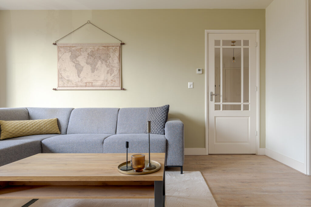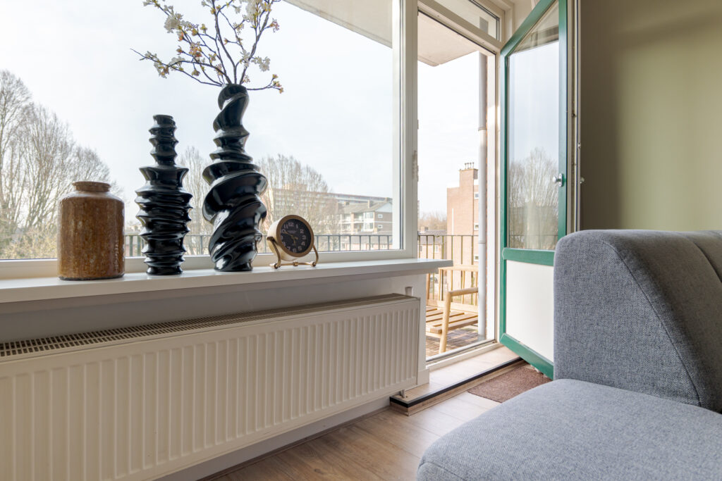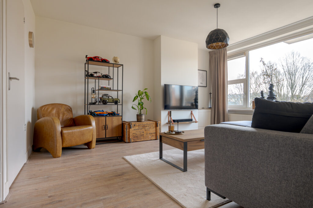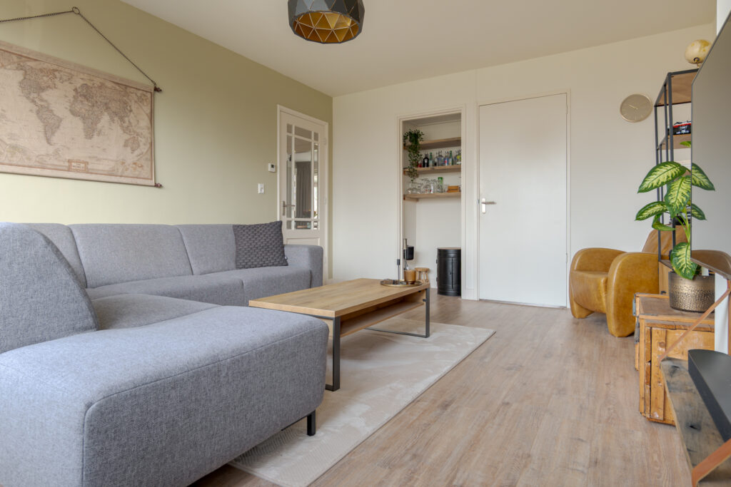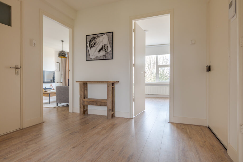 Via het gezamenlijke entree en trappenhuis bereik je het appartement. De hal vormt het centrale punt en geeft toegang tot alle vertrekken. De woonkamer is licht en prettig van formaat en staat in directe verbinding met het balkon aan de voorzijde. Dankzij de ligging op het westen en het vrije uitzicht is dit een fijn en zonnig plekje om te verblijven.