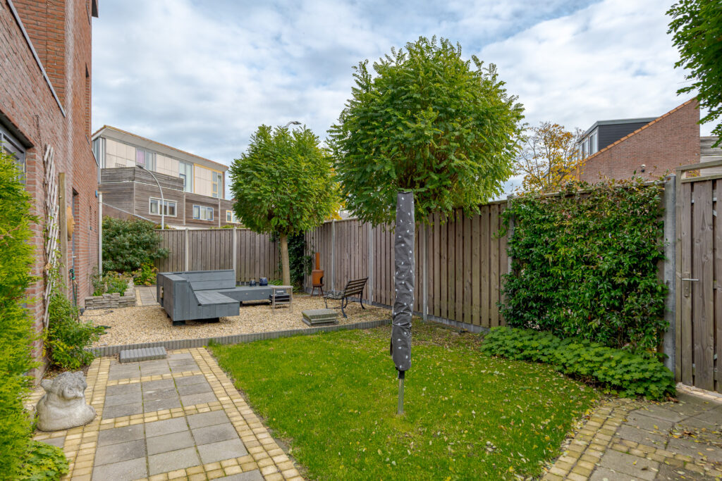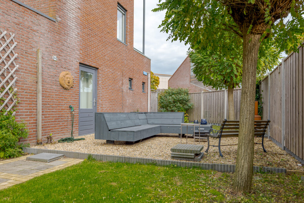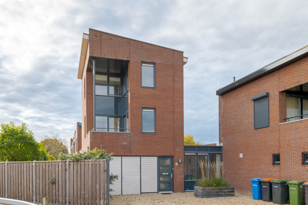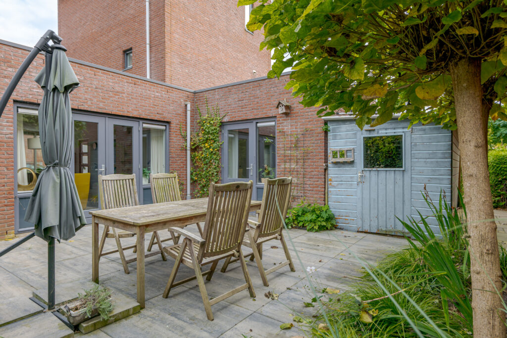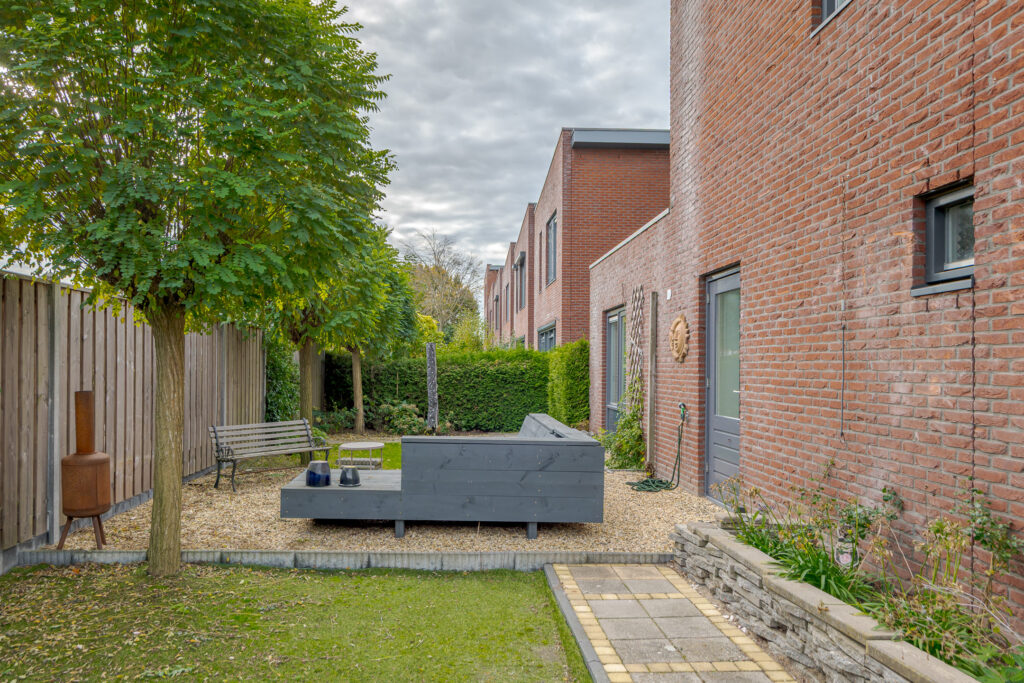 Bij aankomst springt de moderne, bakstenen gevel direct in het oog. De woning beschikt over een onderhoudsvriendelijke voortuin met grindpad en eigen parkeergelegenheid. De zij- en achtertuin bieden veel privacy en diverse zitplekken, waaronder een royaal terras grenzend aan de woning en een extra zithoek onder de bomen aan de zijkant. Dankzij de ligging van de zijtuin op het zuiden geniet u hier vrijwel de hele dag van de zon. Er is tevens een houten berging voor extra opslagruimte.