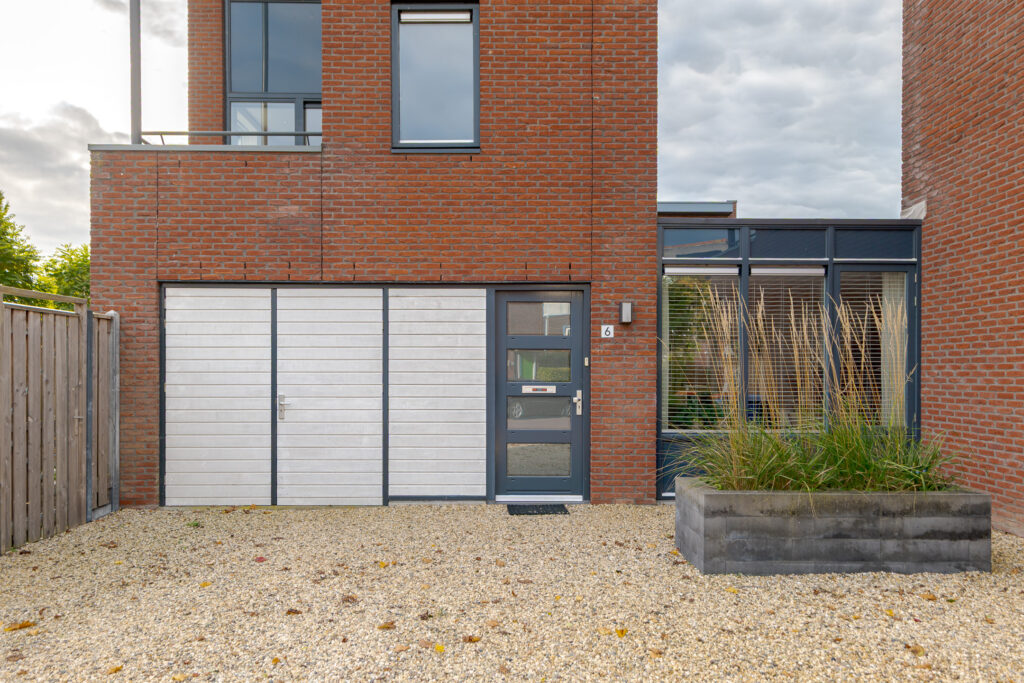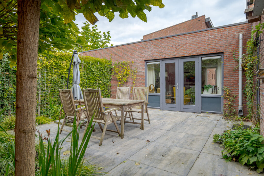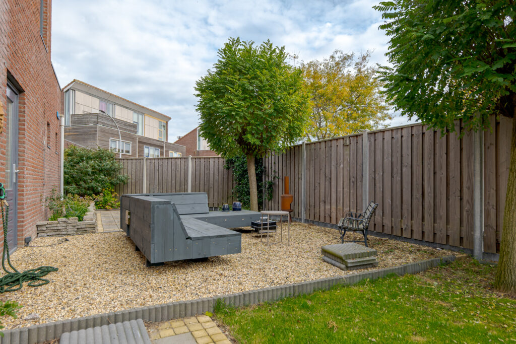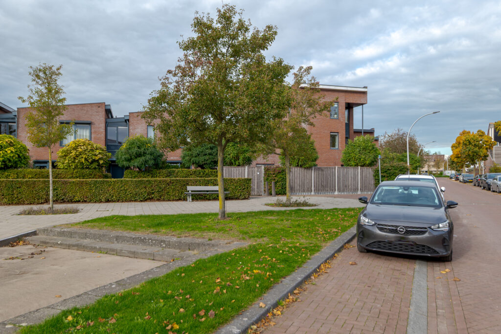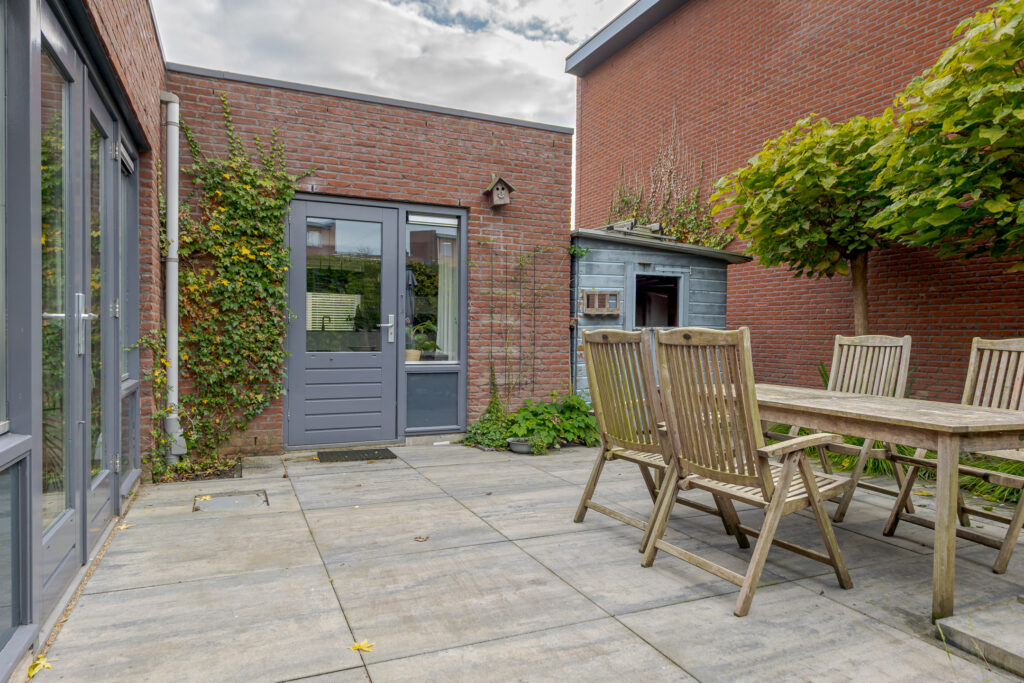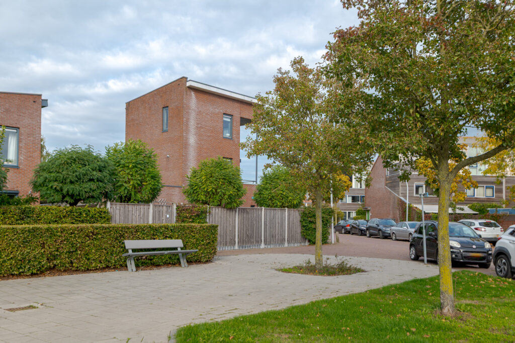 Bij aankomst springt de moderne, bakstenen gevel direct in het oog. De woning beschikt over een onderhoudsvriendelijke voortuin met grindpad en eigen parkeergelegenheid. De zij- en achtertuin bieden veel privacy en diverse zitplekken, waaronder een royaal terras grenzend aan de woning en een extra zithoek onder de bomen aan de zijkant. Dankzij de ligging van de zijtuin op het zuiden geniet u hier vrijwel de hele dag van de zon. Er is tevens een houten berging voor extra opslagruimte.