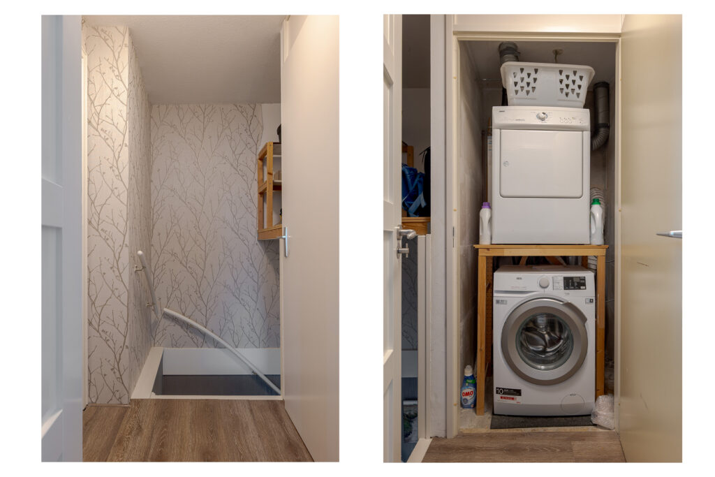 Op de eerste verdieping bevinden zich twee slaapkamers, een comfortabele badkamer met douche en wastafelmeubel, en een ruim dakterras dat via zowel de grote als de kleinere slaapkamer bereikbaar is. De tweede verdieping beschikt over een vierde slaapkamer met speelse L-vorm, een tweede badkamer met douche, wastafelmeubel en toilet, en een aparte ruimte met aansluitingen voor de wasmachine. Beide badkamers zijn voorzien van elektrische vloerverwarming, wat zorgt voor extra comfort.