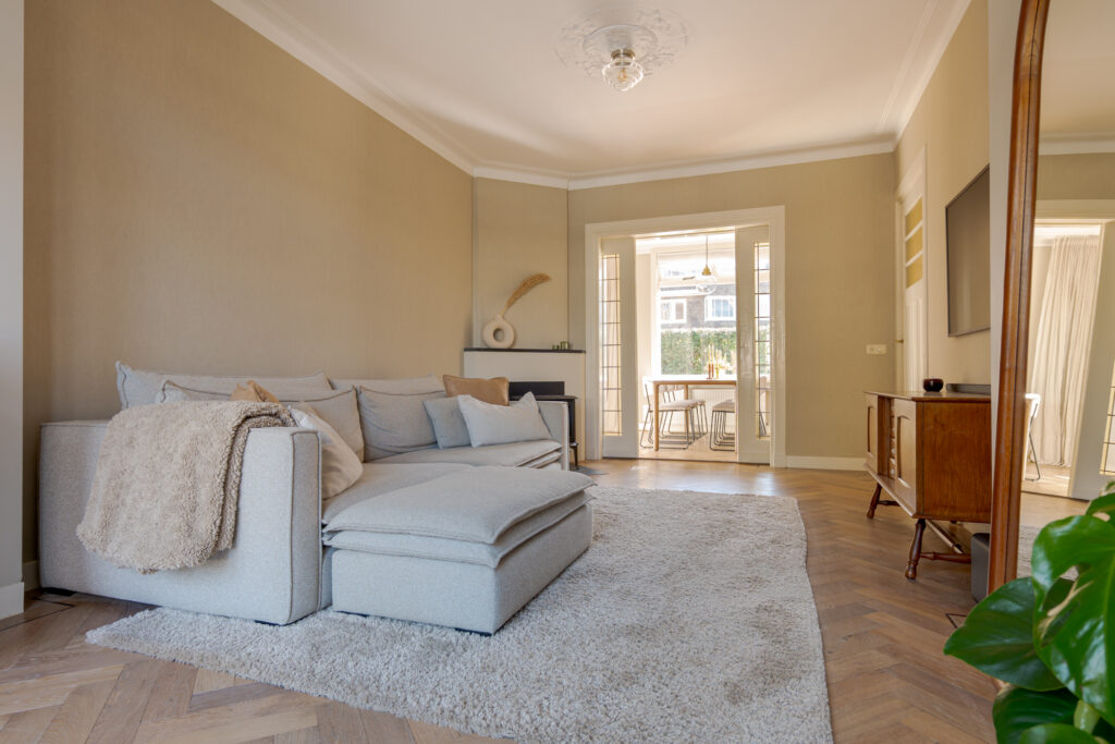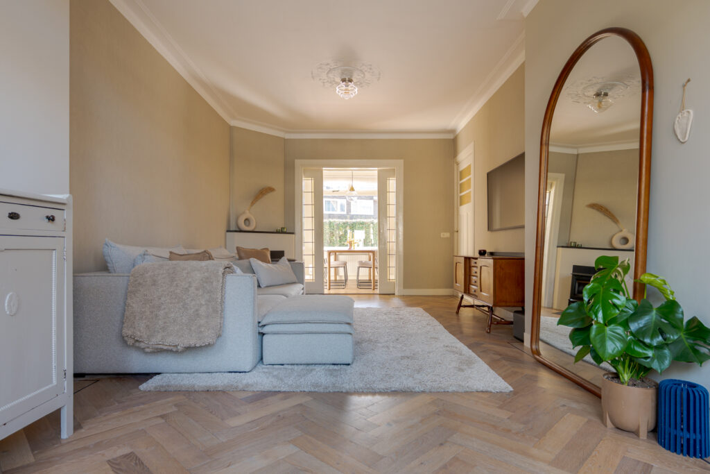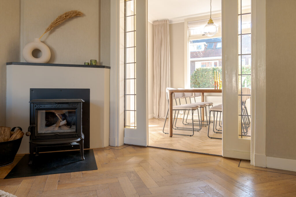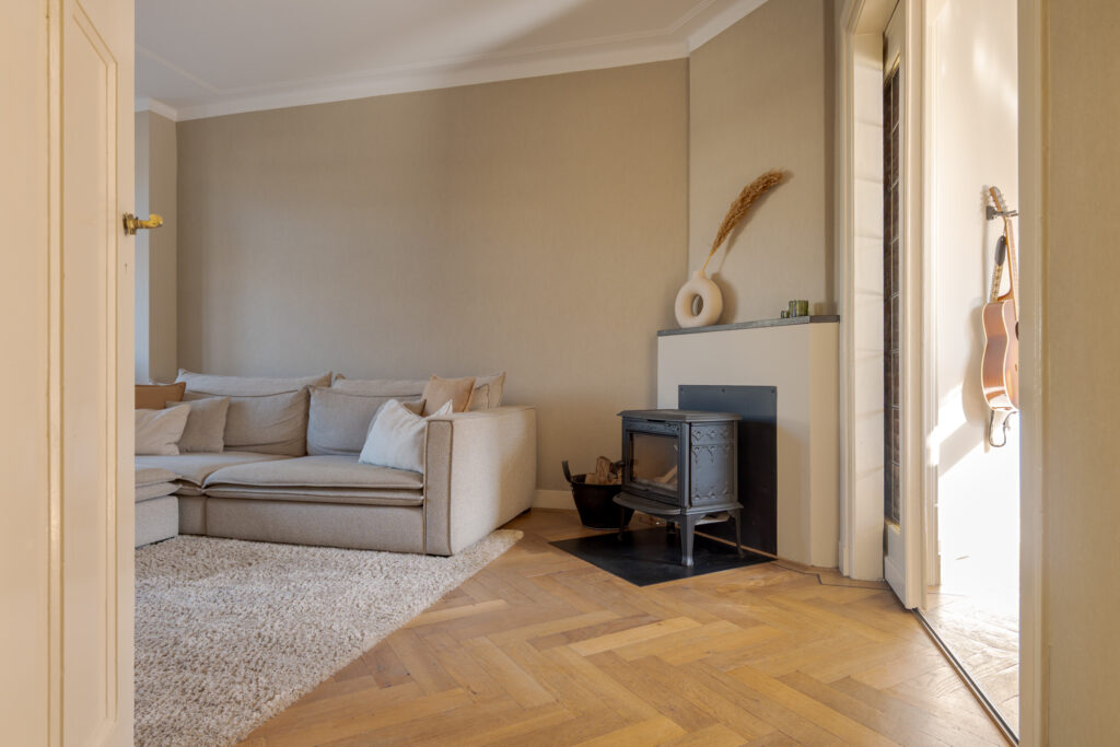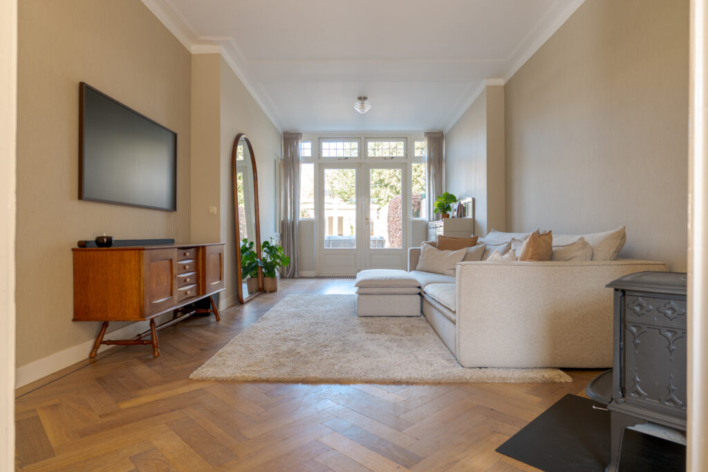 De woning ademt karakter vanaf het eerste moment. Via de entree met tegelvloer en trapopgang betreedt u de woning. De woonkamer en-suite is een sfeervolle leefruimte met hoge plafonds, sierlijsten en glas-in-lood bovenramen die zorgen voor een warme uitstraling. Prachtige elementen zoals de karakteristieke houten vloer, originele en-suite deuren met glas-in-lood en de kachel zorgen voor een authentieke sfeer. Dankzij de openslaande deuren aan de achterzijde vloeien binnen en buiten op prettige wijze in elkaar over.