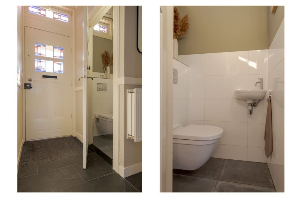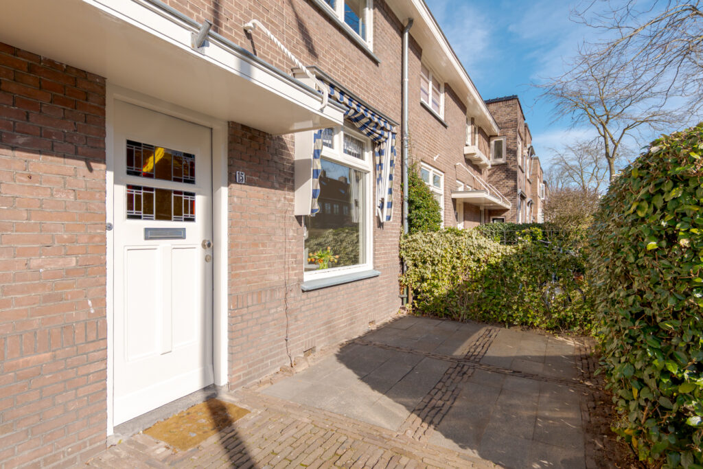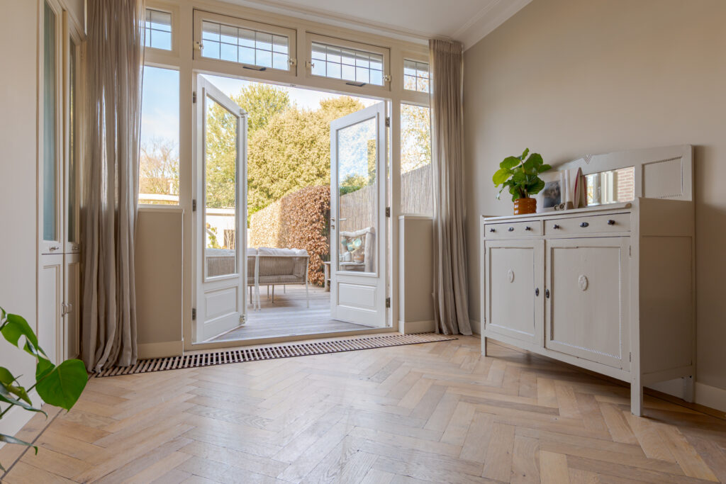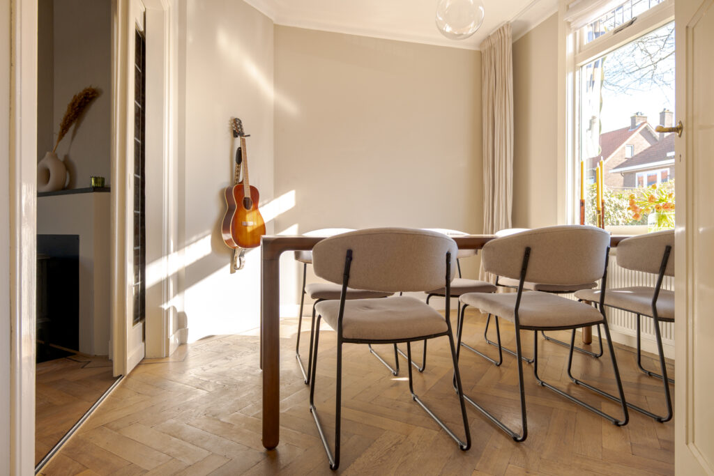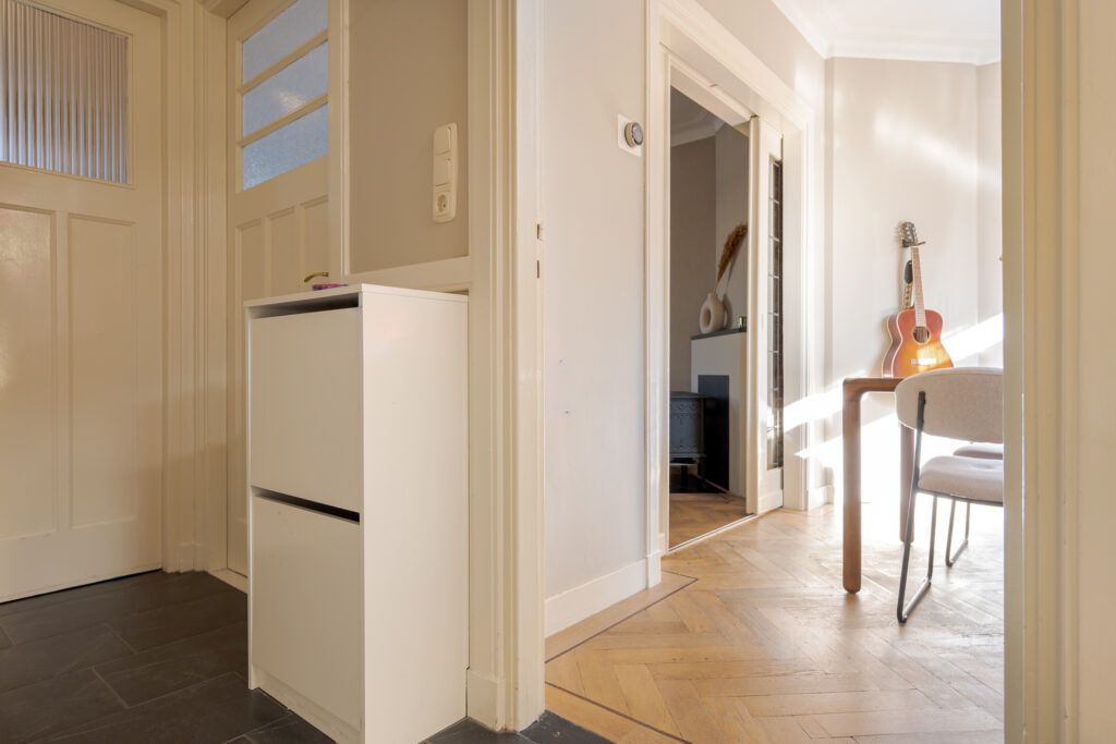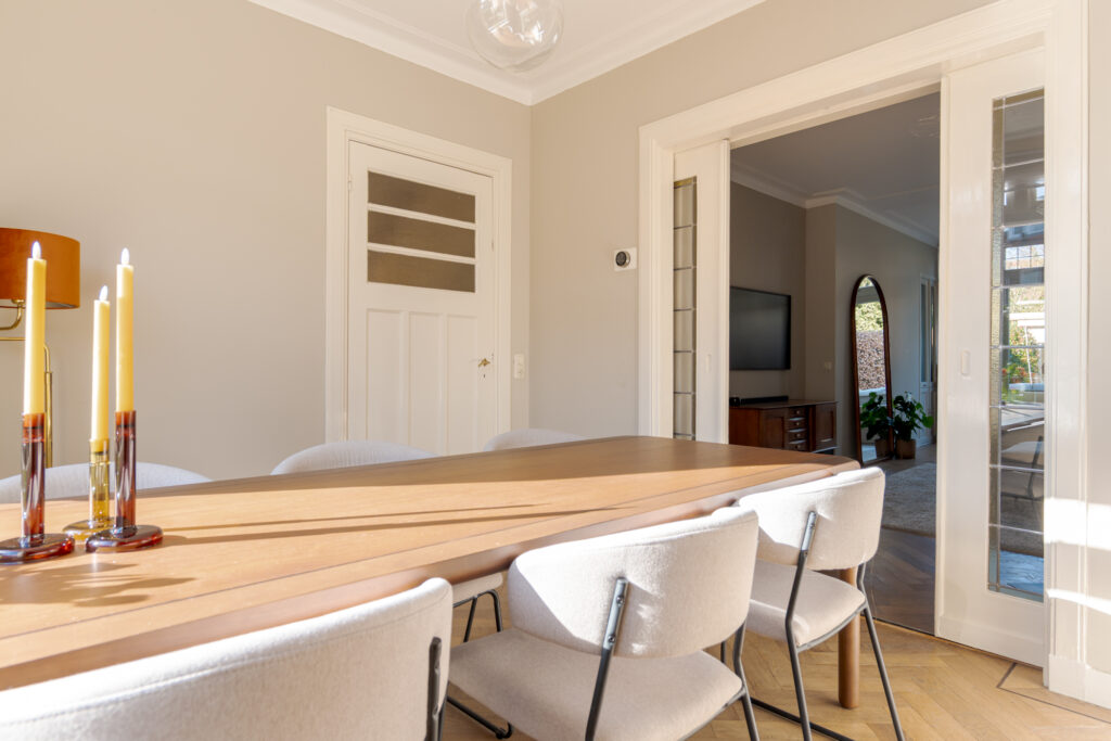 De woning ademt karakter vanaf het eerste moment. Via de entree met tegelvloer en trapopgang betreedt u de woning. De woonkamer en-suite is een sfeervolle leefruimte met hoge plafonds, sierlijsten en glas-in-lood bovenramen die zorgen voor een warme uitstraling. Prachtige elementen zoals de karakteristieke houten vloer, originele en-suite deuren met glas-in-lood en de kachel zorgen voor een authentieke sfeer. Dankzij de openslaande deuren aan de achterzijde vloeien binnen en buiten op prettige wijze in elkaar over.