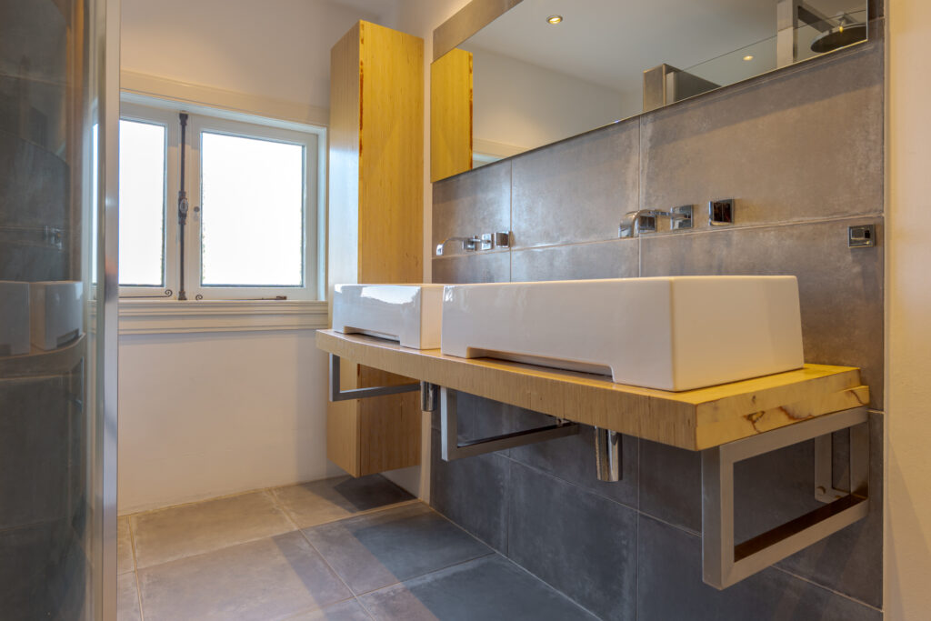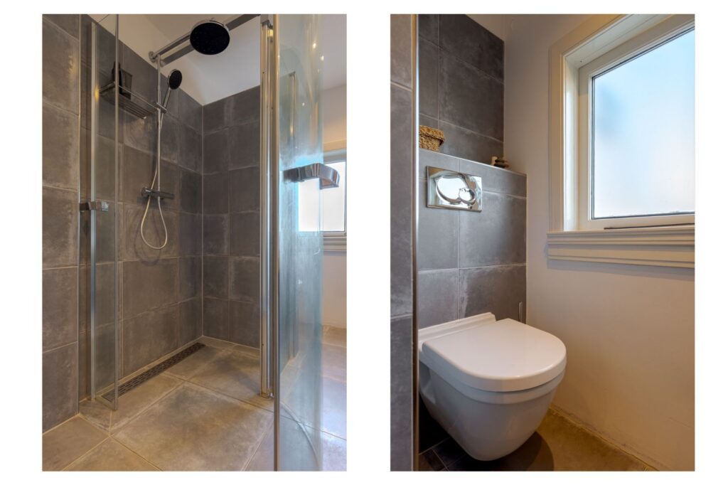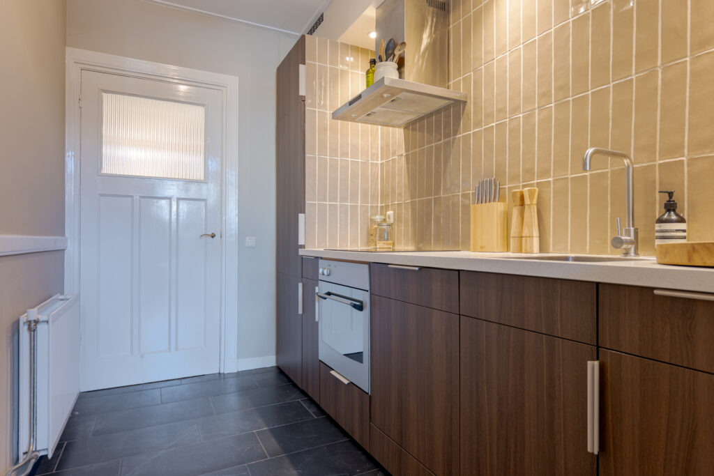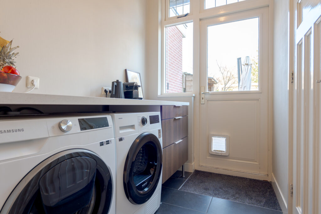 De keuken is separaat en aan de achterzijde gesitueerd. De donkere kastfronten vormen een krachtig contrast met het lichte werkblad, wat zorgt voor een eigentijdse en rustige uitstraling. De tegelwand achter het werkblad geeft de ruimte extra karakter en diepte; een subtiel detail dat direct in het oog springt en de keuken een hoogwaardige afwerking geeft. De naastgelegen bijkeuken is in dezelfde stijl afgewerkt en biedt ruimte aan de was- & droog combinatie, tevens is er van hieruit toegang tot de tuin.