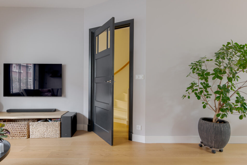 De woning geeft in de hal al direct een frisse en lichte indruk. De woonkamer is strak afgewerkt, in de erker aan de voorzijde bevindt zich de zithoek. Donkere kozijnen en deuren vormen een mooi contrast met de houten vloer die voor een warme sfeer zorgt. Aan de achterzijde bevindt zich de strakke keuken in donkere kleurstelling, deze is voorzien van diverse inbouwapparatuur en voldoende werk- en bergruimte. De eethoek is in direct contact met de keuken, bij mooi weer en de openslaande deuren open, voelt het hier aan als buiten!