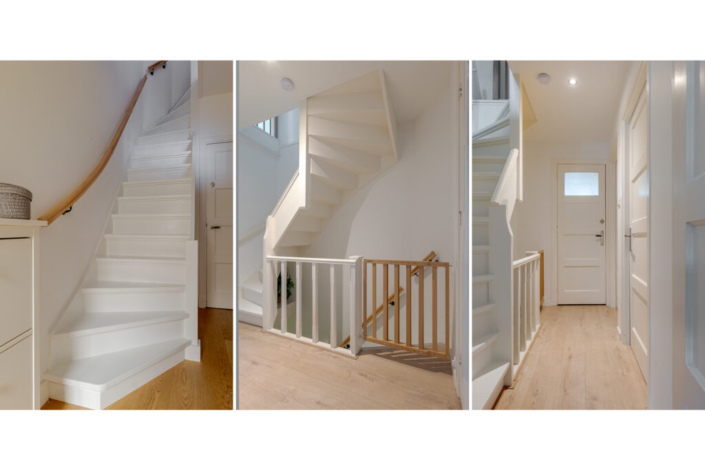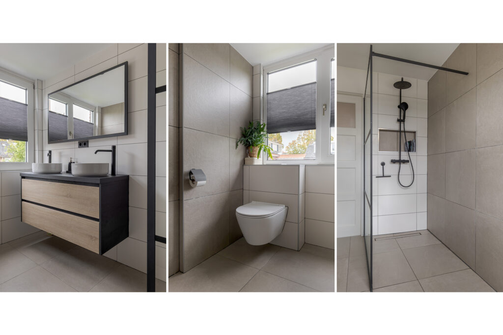 Op de eerste verdieping vindt u drie slaapkamers. Allemaal sfeervol op een eigen manier, een mooi kozijn, de paneeldeuren of een grote raampartij over bijna de hele breedte van de kamer. De badkamer is licht en modern, voorzien van dubbele wastafel, toilet en ruime douche. Ook hier vormen donkere elementen een harmonieus contrast met de natuurlijke vloer en wanden.