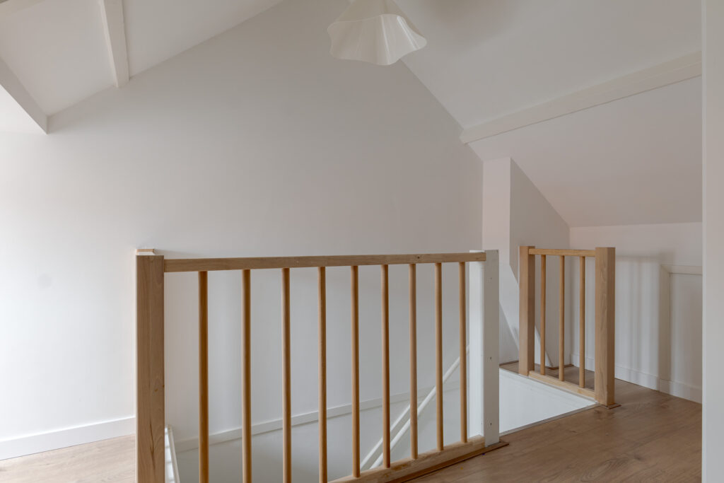 Via een vaste trap komt u op de tweede verdieping. Eerst op de overloop met ruimte voor de wasmachine. Verder bevindt zich hier nog een fijne ruime lichte kamer met dakkapel, de zichtbare balkenstructuur herinnert ons hier nog even aan het bouwjaar van deze prachtige woning!