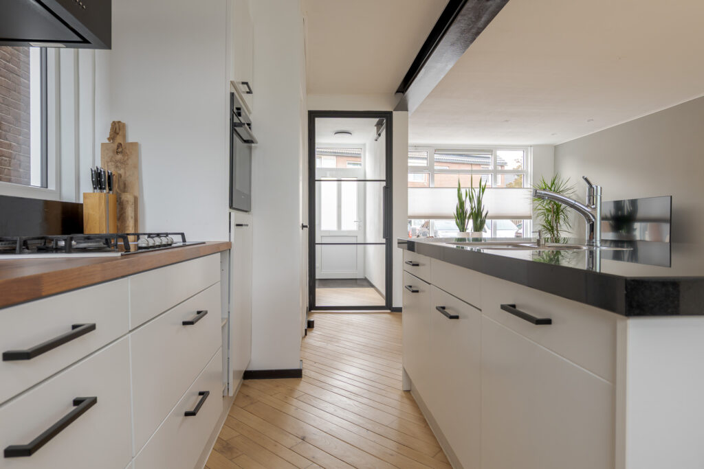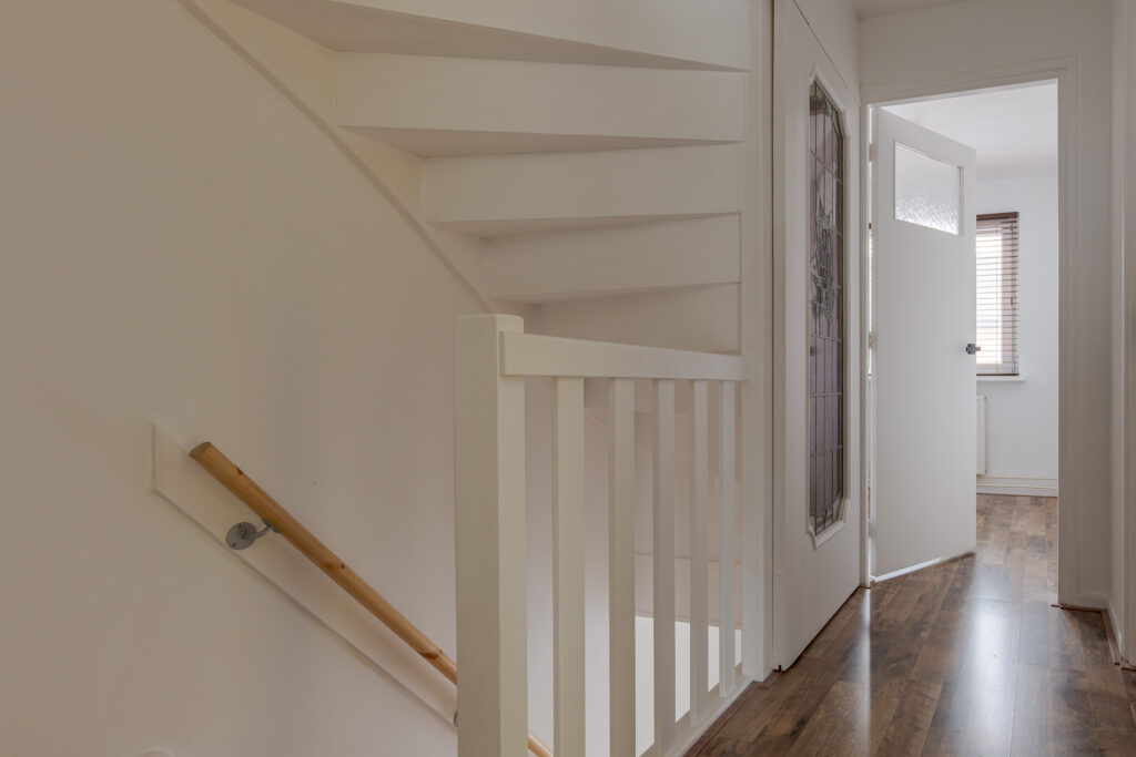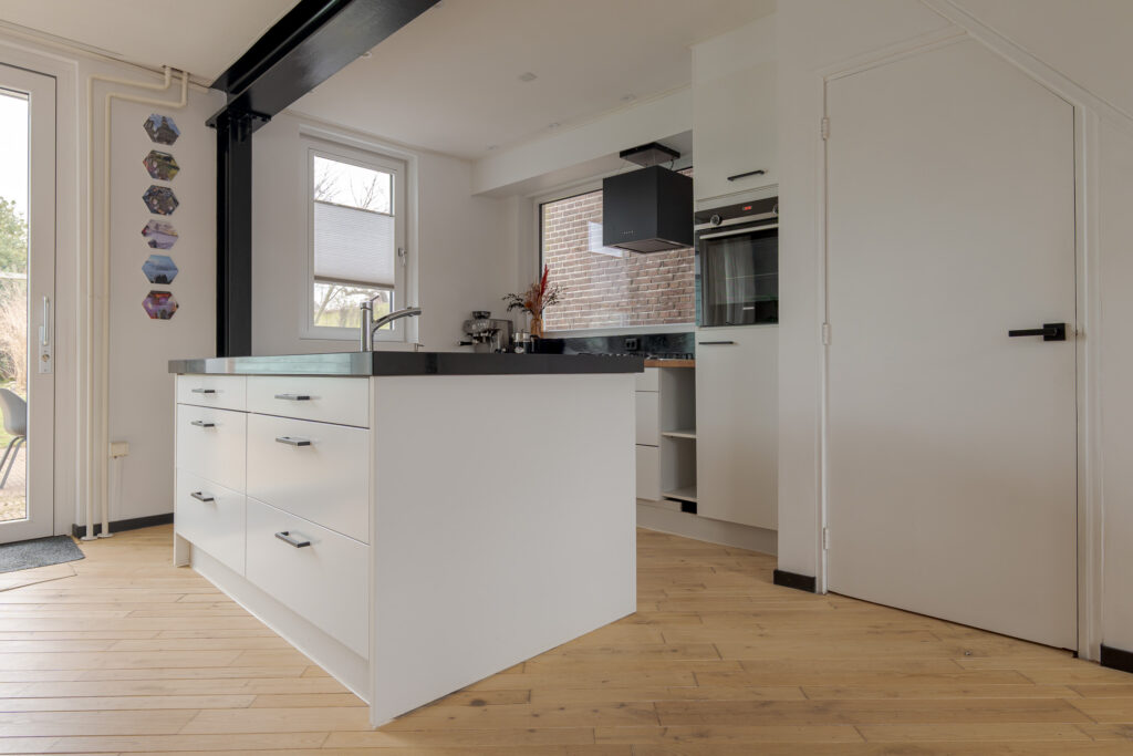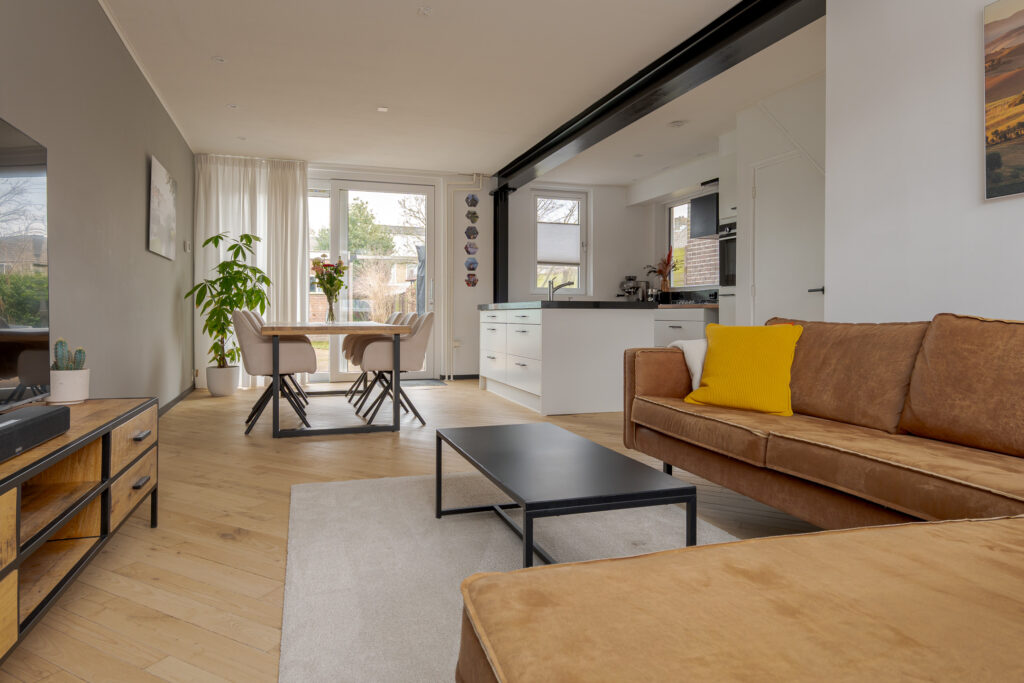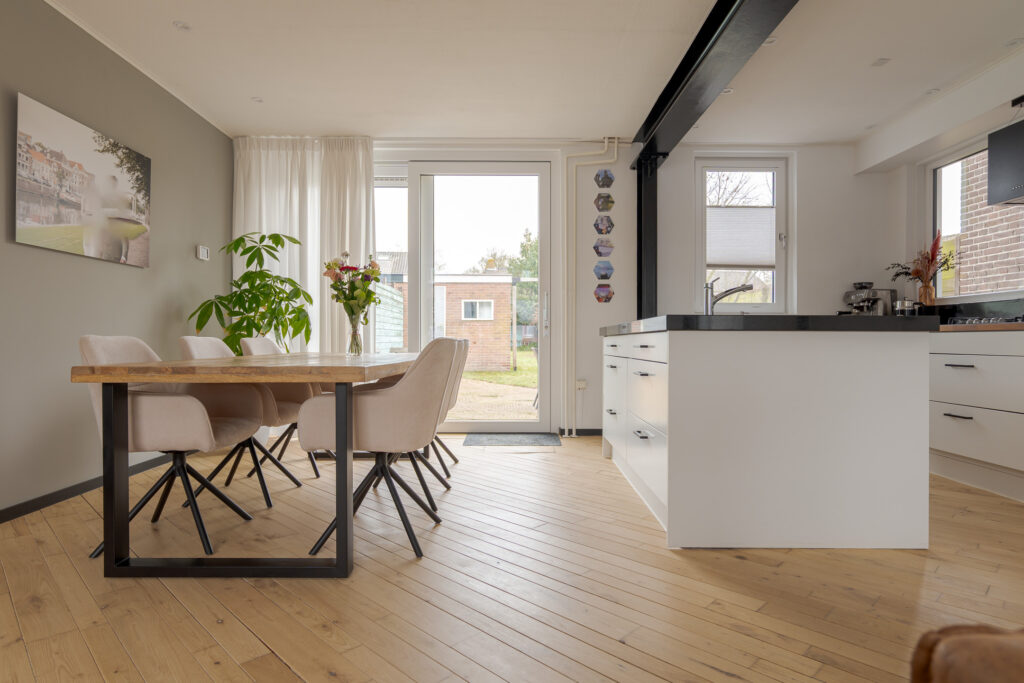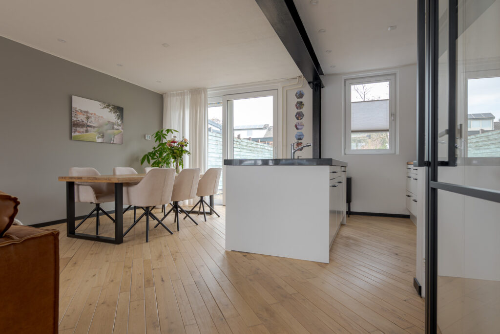 Via de entree komt u binnen in de hal met trapopgang, toegang tot het toilet en de woonkamer. De woonkamer geniet dankzij de grote raampartijen van prettig daglicht. De houten vloer is diagonaal gelegd, wat zorgt voor een speels effect en een ruimtelijk gevoel. Aansluitend bevindt zich de keuken aan de achterzijde van de woning. Deze is strak vormgegeven en opgesteld met een spoeleiland, wat zorgt voor een praktische en overzichtelijke indeling. Mede dankzij het zijraam is ook de keuken een lichte en aangename ruimte. In de woonkamer is daarnaast een handige trapkast aanwezig.
