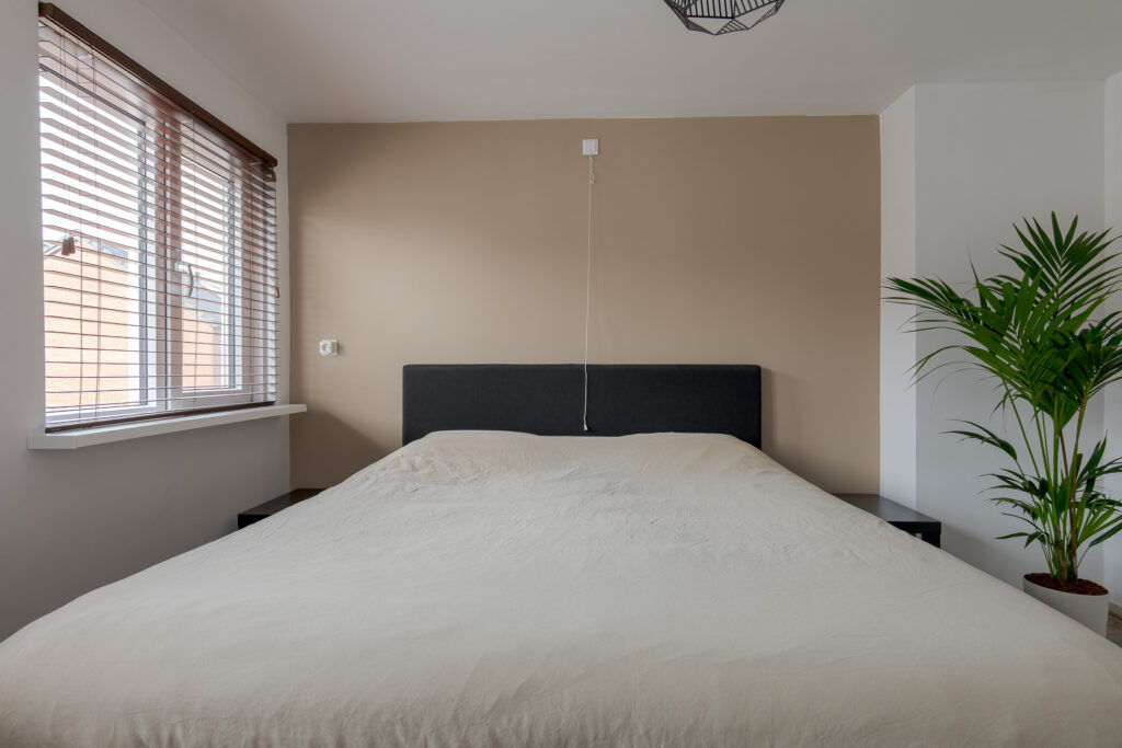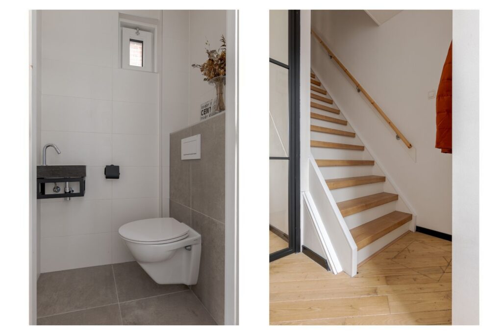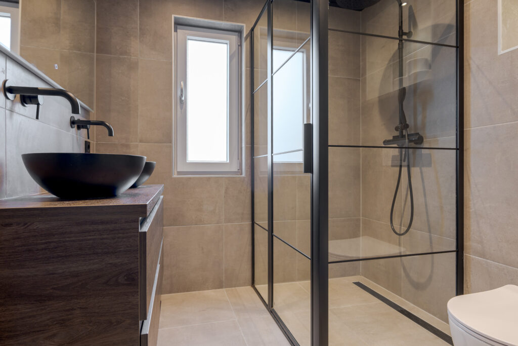 – recent gerenoveerde badkamer met aardetinten en zwarte accenten;