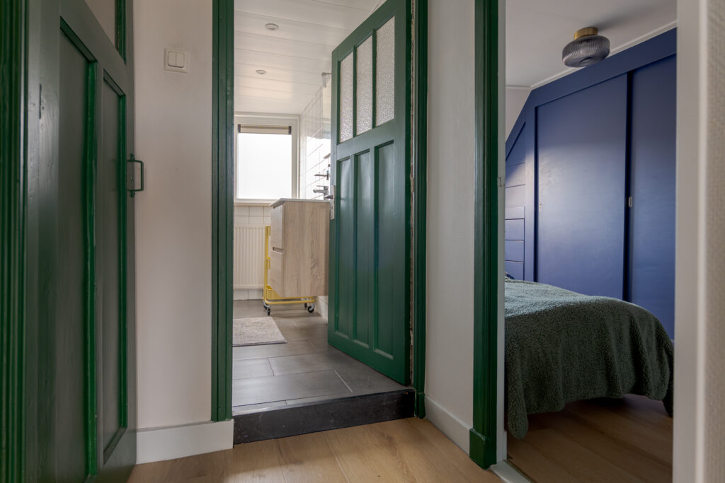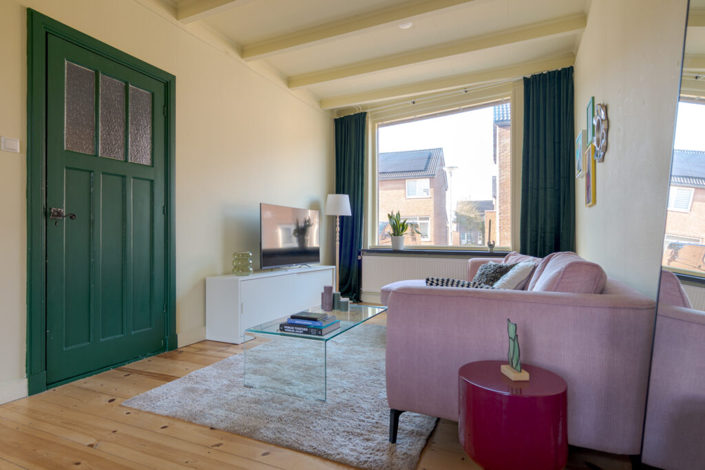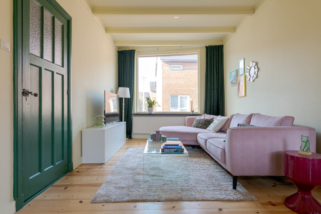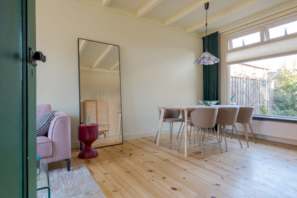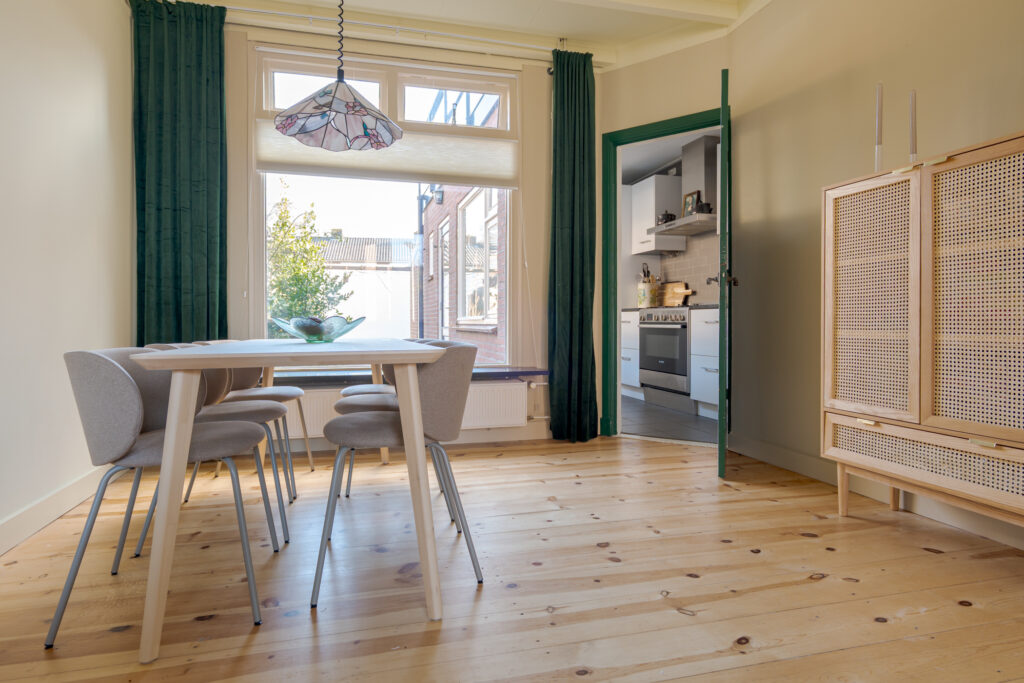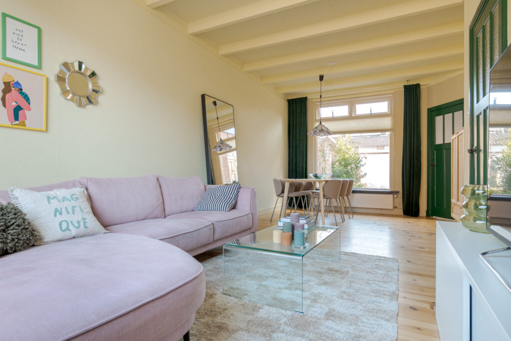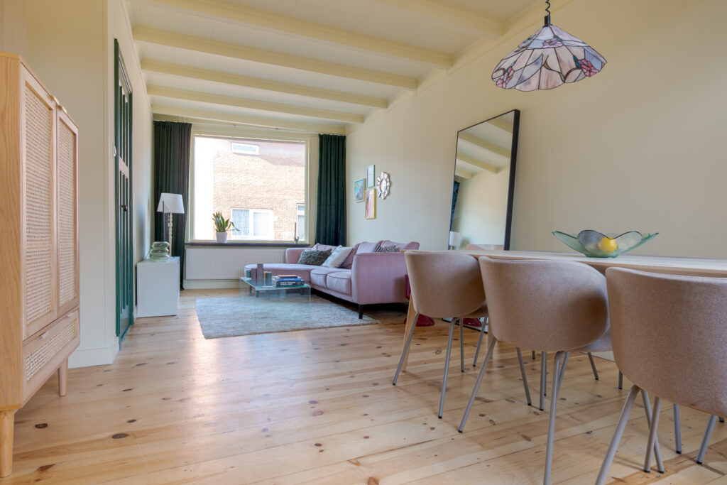 De woning staat op een perceel van ruim 100 m² en beschikt over circa 86 m² woonoppervlakte. Via de entree met meterkast, garderobe en trapopgang komt u in de woonkamer. Het hoge balkenplafond geeft de ruimte een sfeervolle uitstraling en versterkt het karakter van het bouwjaar. De grenen vloer is opnieuw geschuurd en gelakt, wat zorgt voor een warme en verzorgde afwerking.