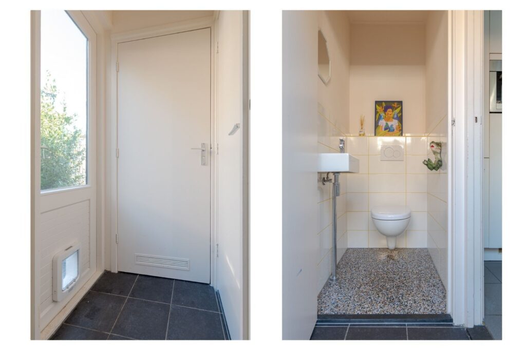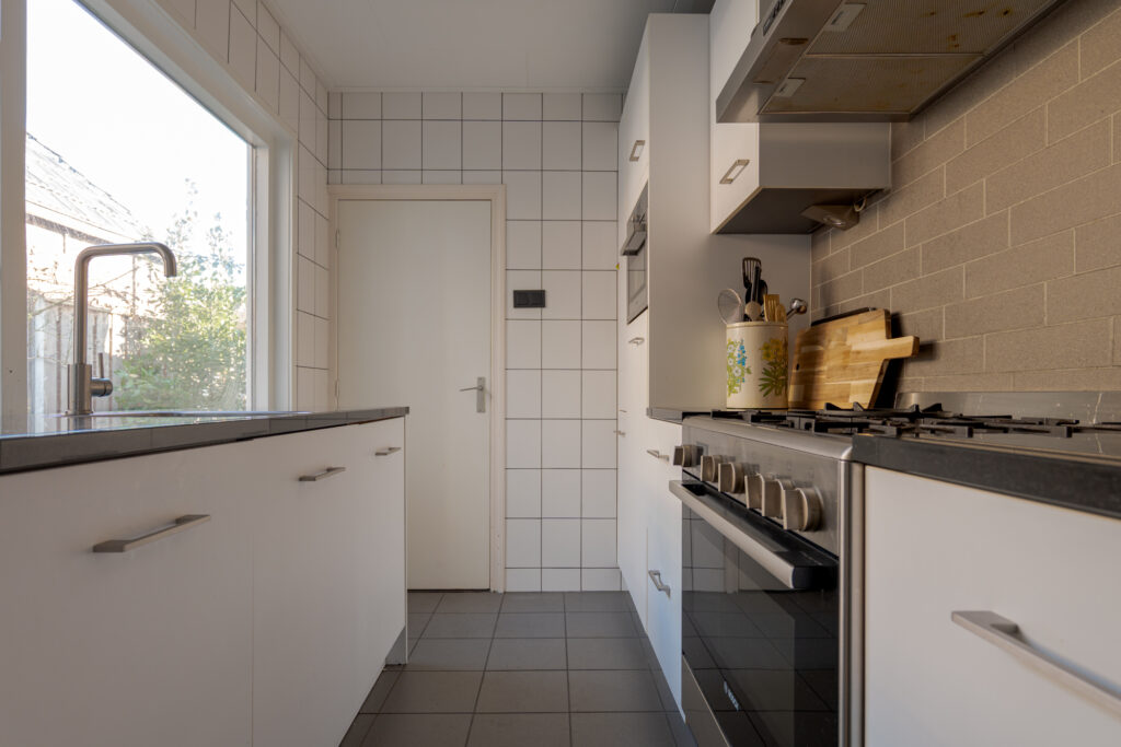 Aansluitend bevindt zich de aangebouwde keuken. Deze is voorzien van diverse inbouwapparatuur, waaronder een vaatwasser, combi-oven, koelkast, afzuigschouw en een fornuis met grote oven en vijf gaspitten. Vanuit de keuken is er toegang tot het in 2024 gemoderniseerde toilet en een praktische berging met opstelplaats voor wasmachine en droger.
