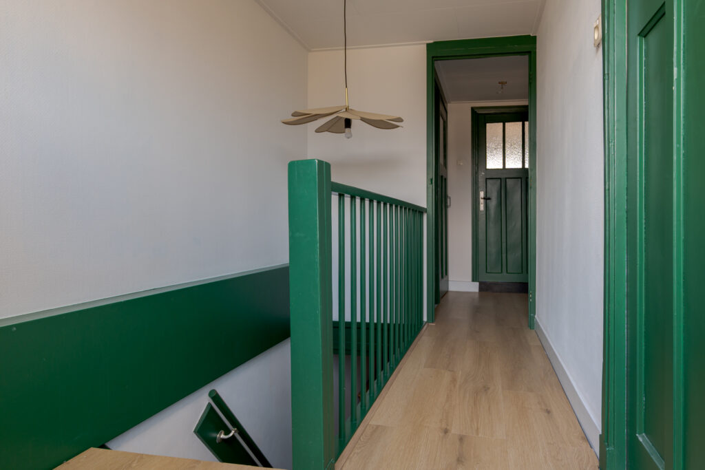 De overloop op de eerste verdieping geeft toegang tot twee slaapkamers en de badkamer. Eén van de slaapkamers beschikt over een ruime inbouwkast. De royale en lichte badkamer is in 2015 gerealiseerd en voorzien van een inloopdouche, toilet en wastafelmeubel.