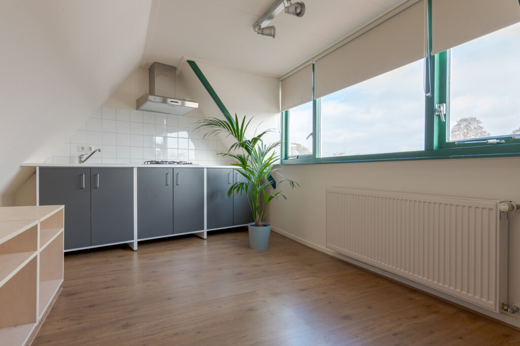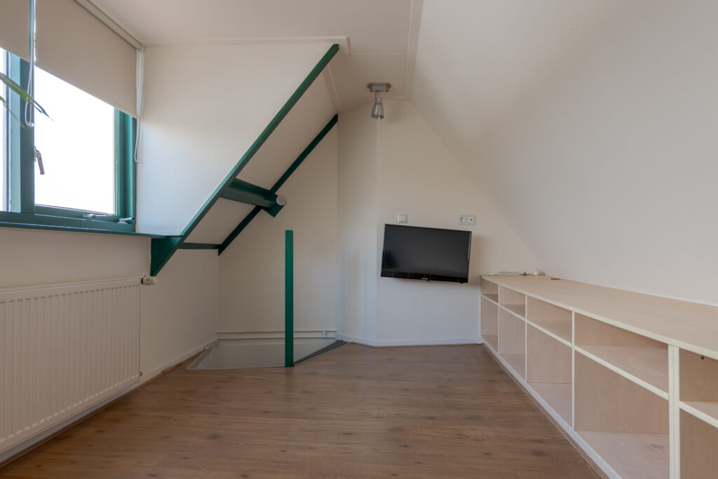 Via een vaste trap bereikt u de zolderverdieping. Hier bevindt zich een zolderkamer met dakkapel, wat zorgt voor extra licht en ruimte. Op deze verdieping is tevens een keukenblokje aanwezig met gaskookplaat, afzuigschouw en gootsteen. Dit maakt de ruimte geschikt voor uiteenlopende doeleinden, zoals een werkruimte, hobbyruimte of logeerkamer.