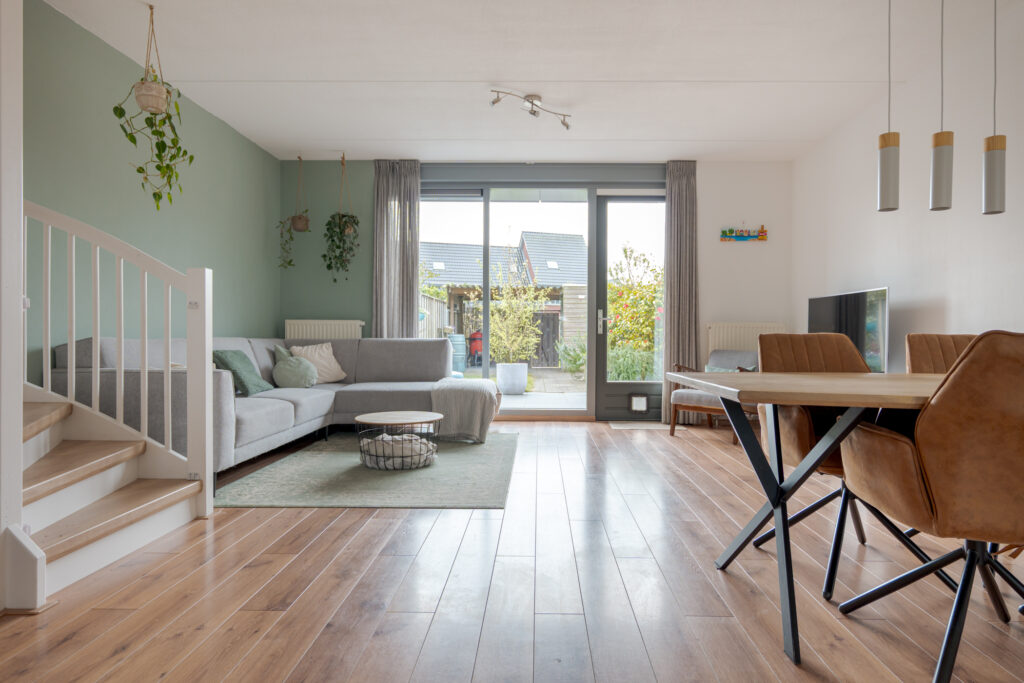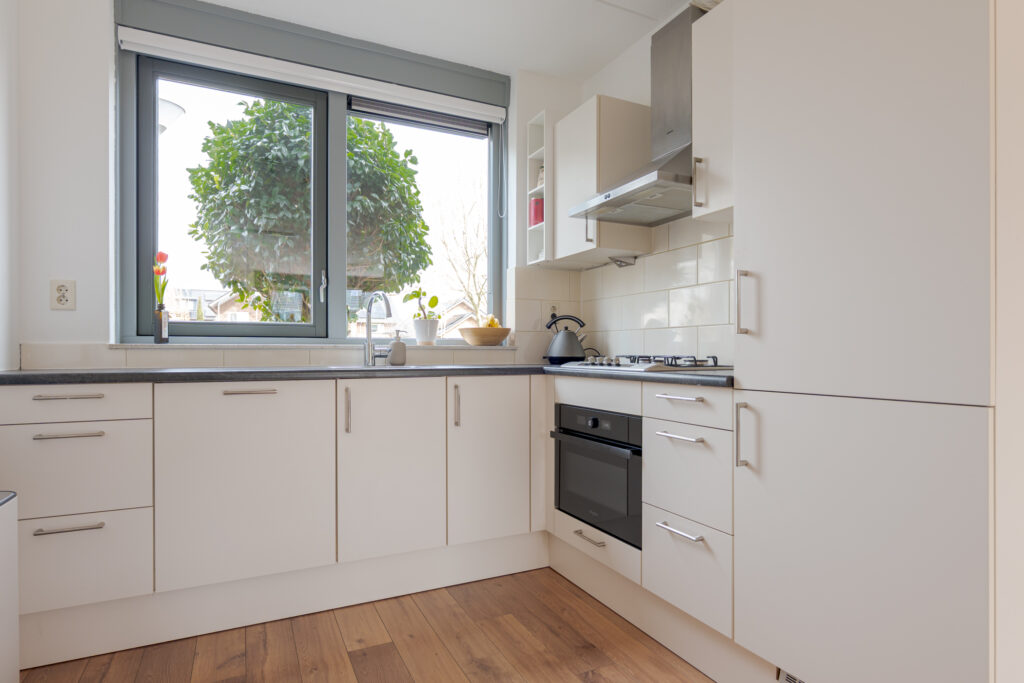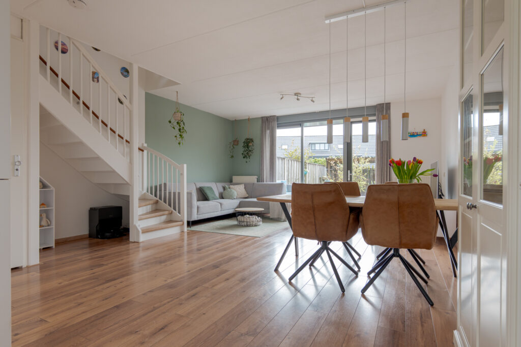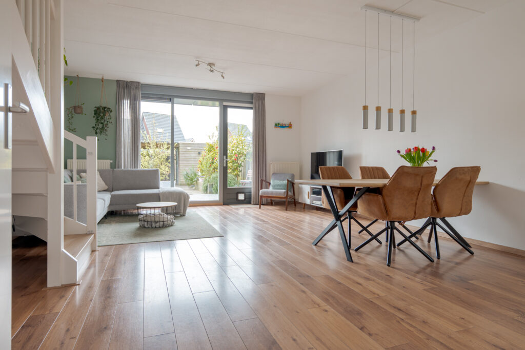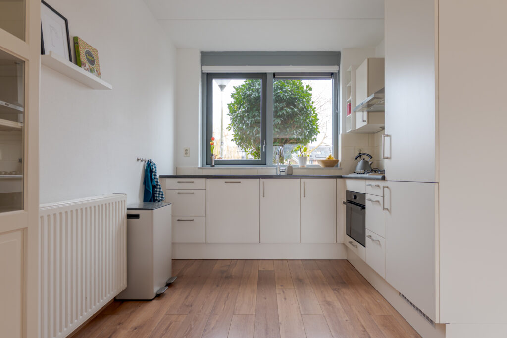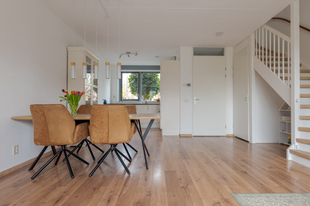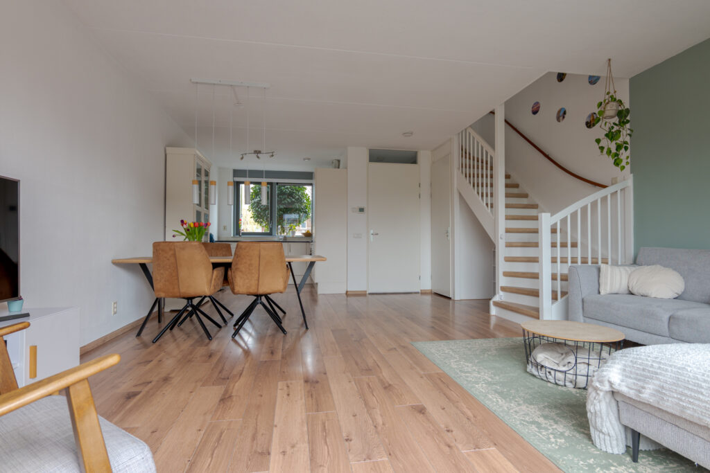 Via de entree komt u in de hal met meterkast en toilet. Aan de voorzijde van de woning bevindt zich de open keuken, uitgevoerd in een moderne opstelling met prettig zicht naar buiten. Aansluitend loopt u door naar de woonkamer aan de tuinzijde. Deze is heerlijk licht dankzij de grote raampartij en de directe verbinding met de achtertuin. De houten vloer en de neutrale afwerking zorgen voor een warme en verzorgde uitstraling, waardoor u zich hier direct thuis voelt. Ook beschikt de woonkamer over een praktische opbergkast en is de trap hiernaast terug te vinden.