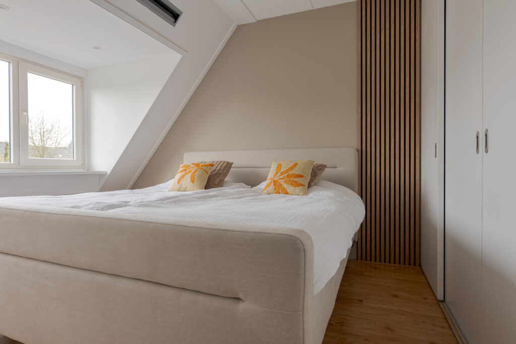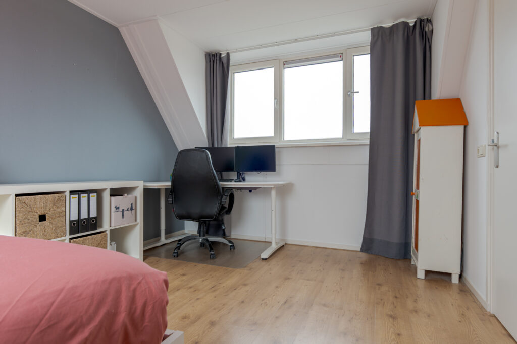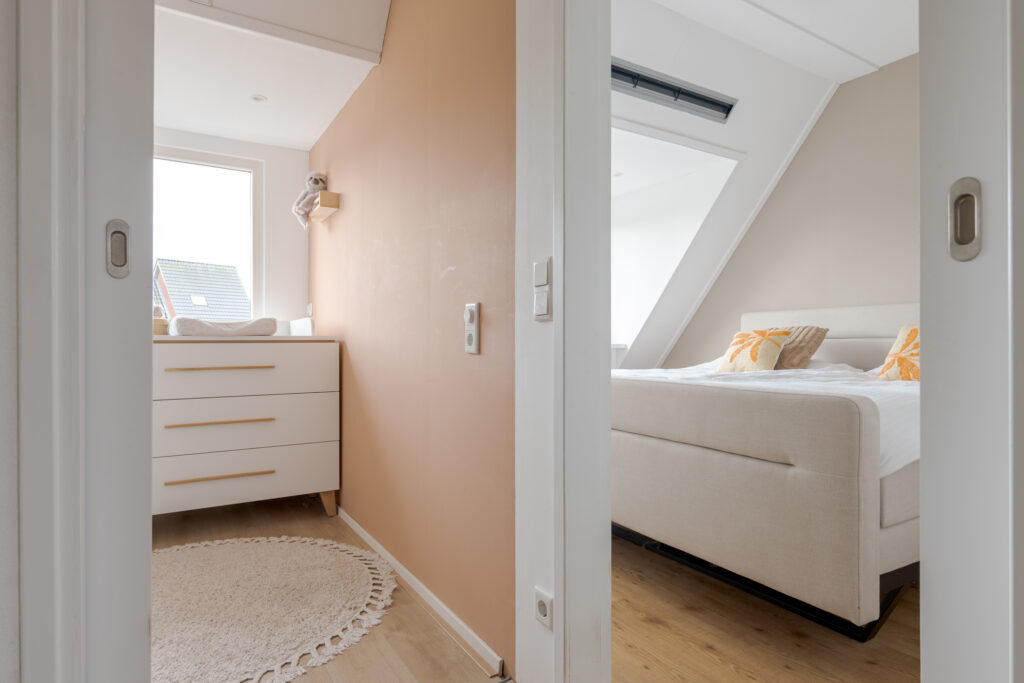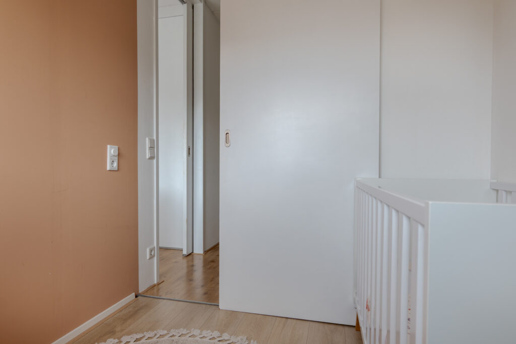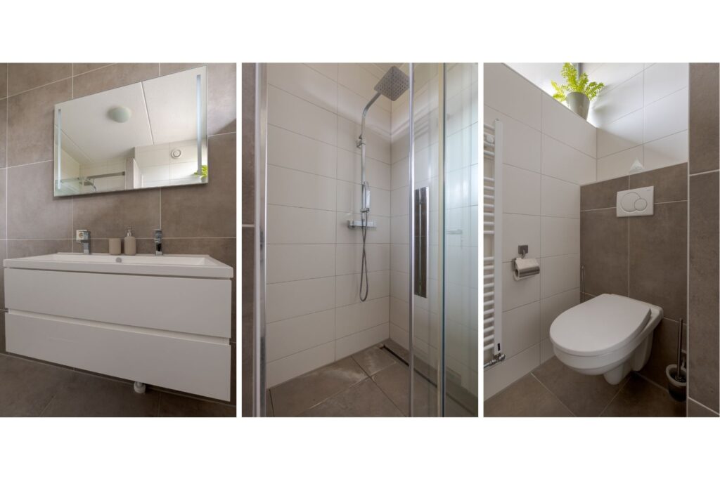 Op de eerste verdieping bevinden zich drie slaapkamers, allen goed bemeten en praktisch in te delen. Twee kamers zijn voorzien van een schuifdeur, wat niet alleen praktisch is, maar ook ruimte bespaart. De badkamer is compleet uitgevoerd en beschikt over een douche, toilet en een dubbele wastafel. Dankzij de indeling en afwerking is dit een comfortabele en functionele ruimte.