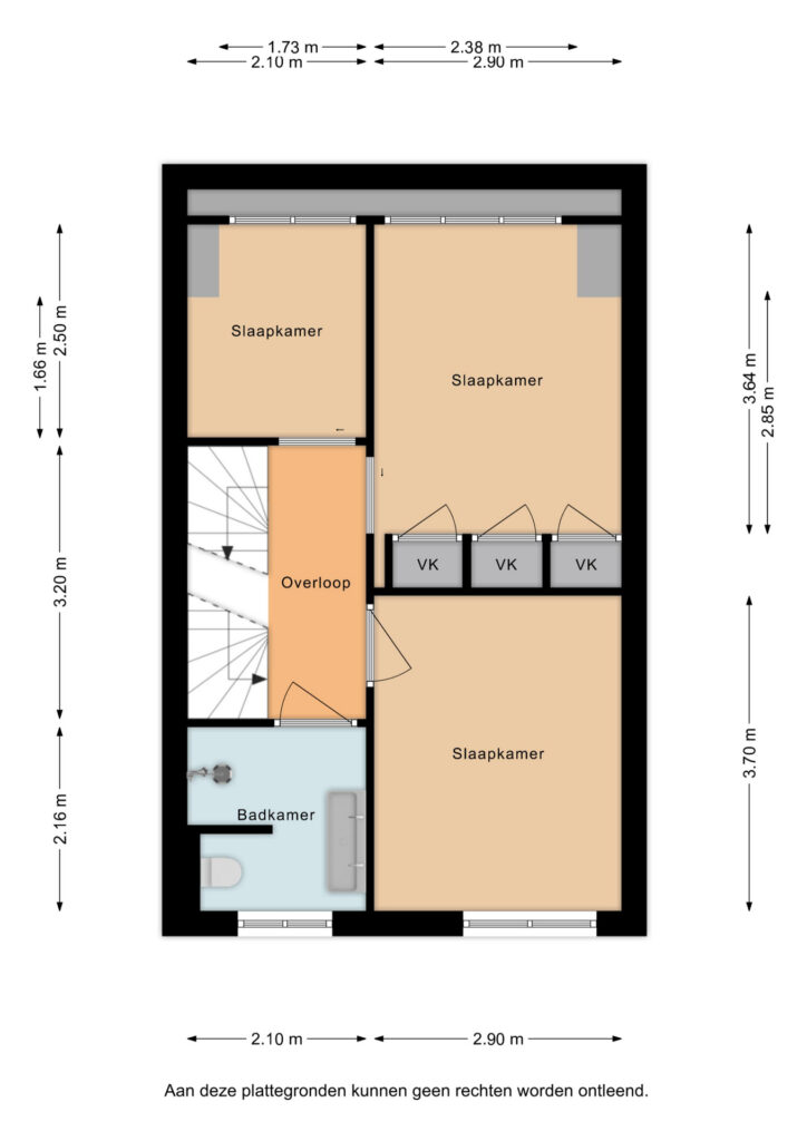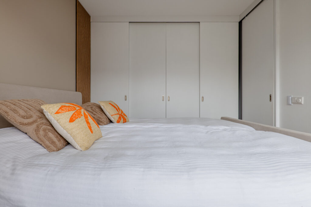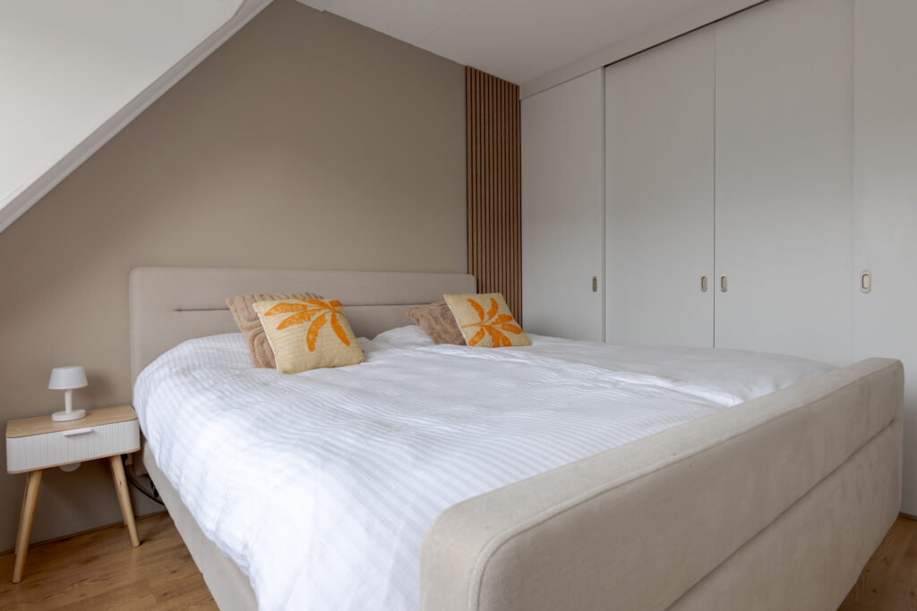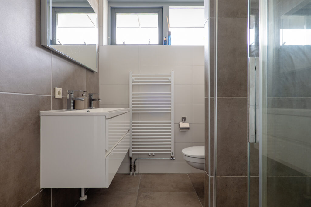 Op de eerste verdieping bevinden zich drie slaapkamers, allen goed bemeten en praktisch in te delen. Twee kamers zijn voorzien van een schuifdeur, wat niet alleen praktisch is, maar ook ruimte bespaart. De badkamer is compleet uitgevoerd en beschikt over een douche, toilet en een dubbele wastafel. Dankzij de indeling en afwerking is dit een comfortabele en functionele ruimte.