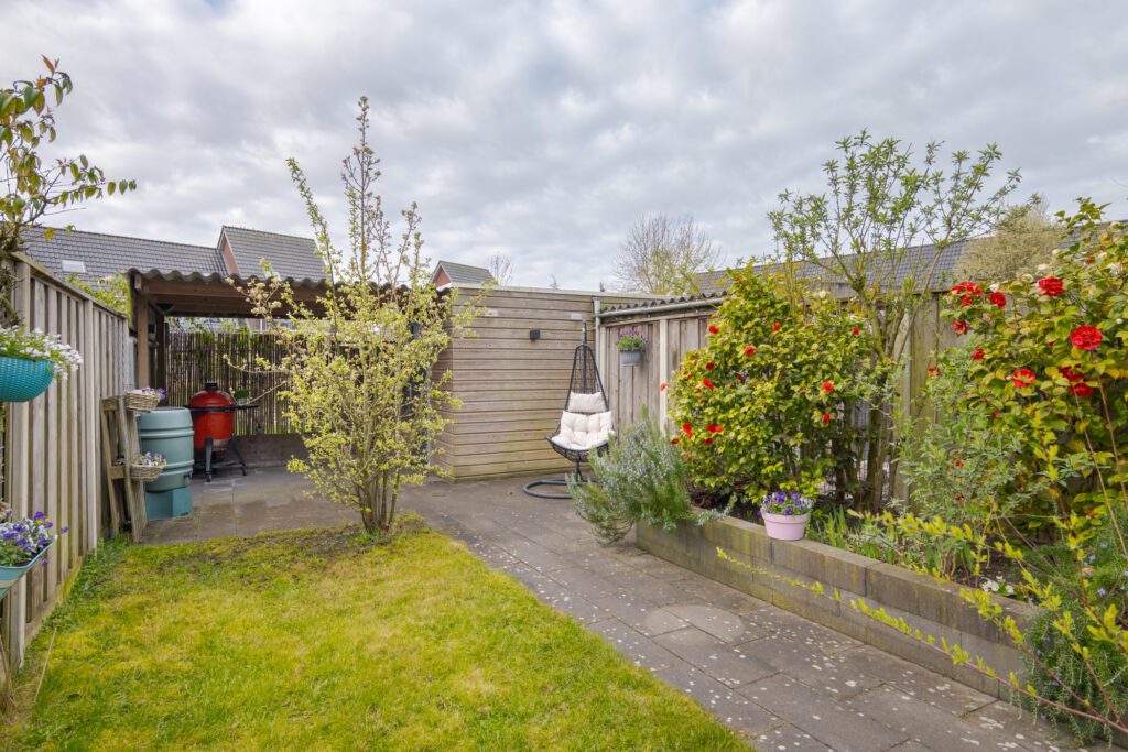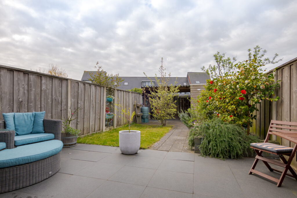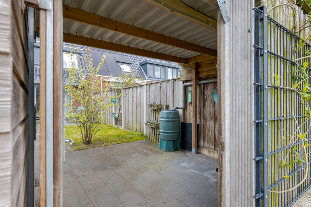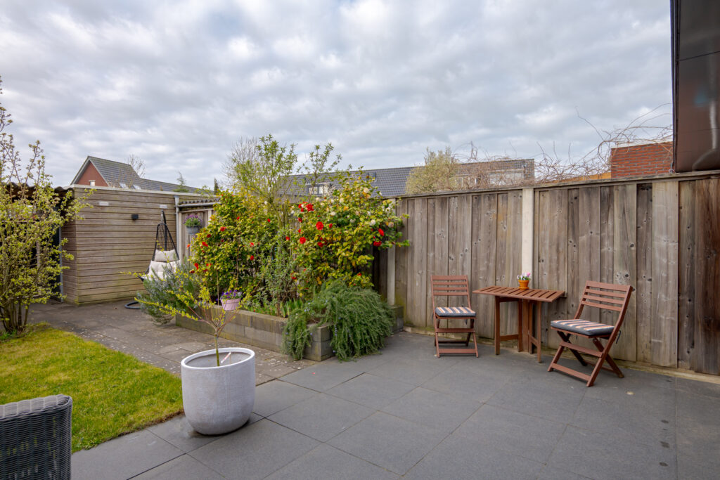De achtertuin is verzorgd aangelegd. Dankzij de ligging op het zuiden geniet u hier volop van de zon. Direct aan de woning bevindt zich een terras, verderop in de tuin is ruimte voor groen en een tweede zitplek. Achterin vindt u een vrijstaande houten berging en een overkapping, ideaal voor het stallen van fietsen of het creëren van een beschutte buitenplek. De tuin is tevens bereikbaar via een achterom.