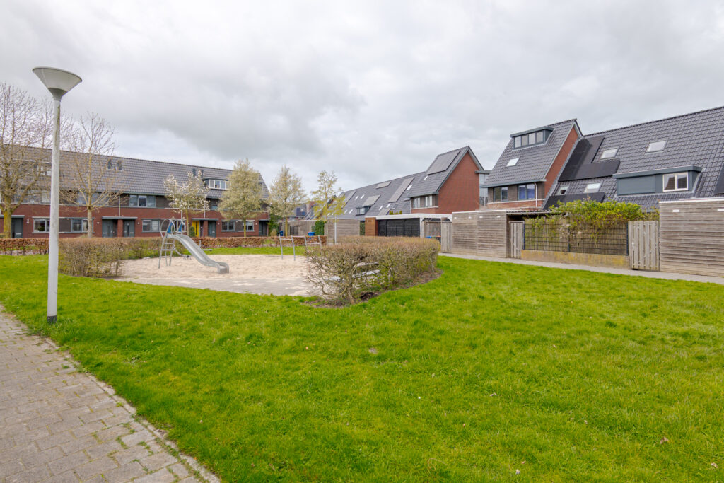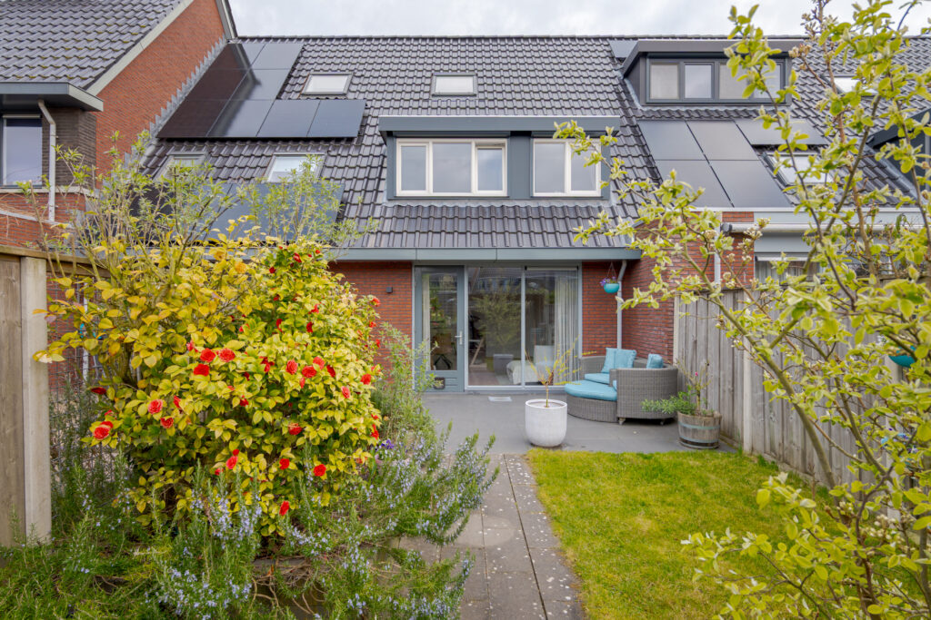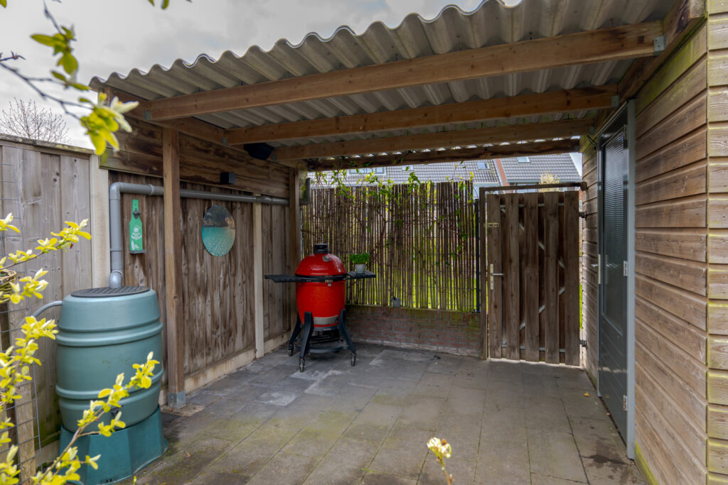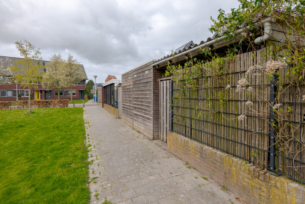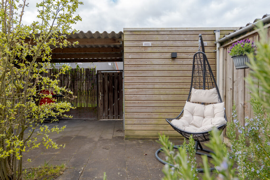 De achtertuin is verzorgd aangelegd. Dankzij de ligging op het zuiden geniet u hier volop van de zon. Direct aan de woning bevindt zich een terras, verderop in de tuin is ruimte voor groen en een tweede zitplek. Achterin vindt u een vrijstaande houten berging en een overkapping, ideaal voor het stallen van fietsen of het creëren van een beschutte buitenplek. De tuin is tevens bereikbaar via een achterom.
