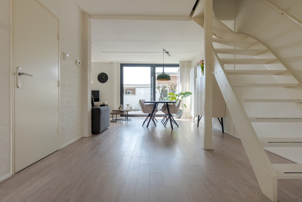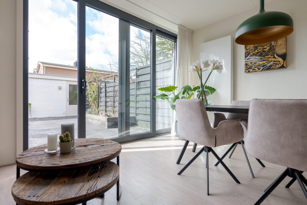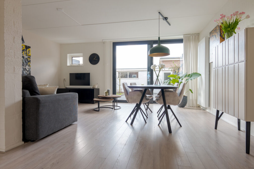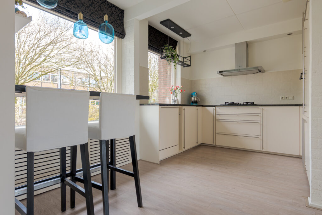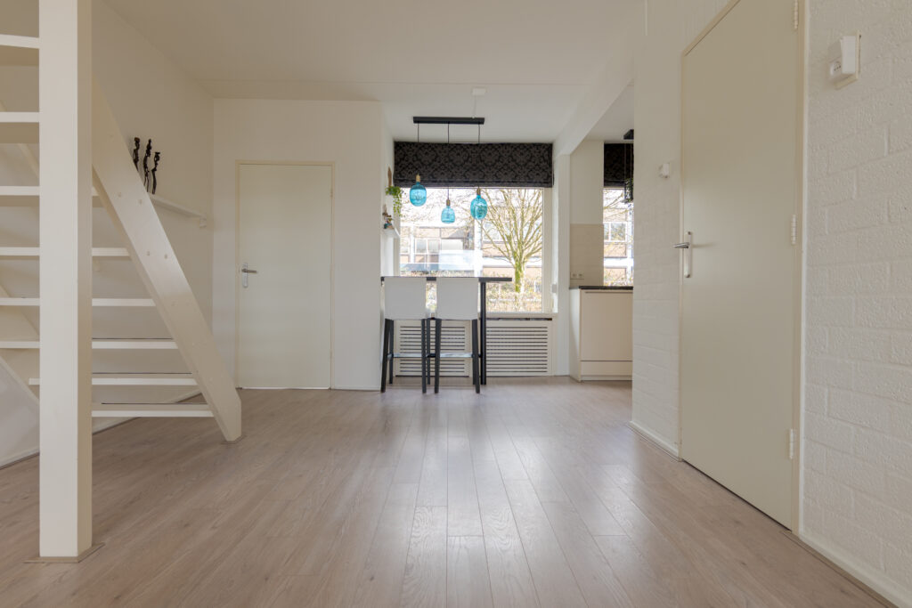 Via de entree aan de voorzijde komt u binnen in de hal met garderobe. Vanuit hier loopt u door naar de ruime woonkamer. Dankzij de grote glazen schuifpui (2023) aan de achterzijde en de diverse raampartijen alsmede de lichte afwerking van wanden en vloer oogt deze leefruimte open en aangenaam licht. De zithoek en eettafel kunnen hier moeiteloos een plek krijgen, terwijl de verbinding met de tuin voor een prettig ruimtelijk geheel zorgt. De keuken ligt aan de voorzijde en is praktisch ingedeeld, in een u-opstelling met moderne lichte fronten. Er bevindt zich tevens een ontbijtbar met zicht op de voortuin. Een fijne plek om ‘s morgens rustig de dag te beginnen met een kopje koffie. Aansluitend aan de woonkamer bevindt zich een portaal met toegang tot het toilet en vaste kast. Via de trap in de woonkamer komt u op de eerste verdieping.
