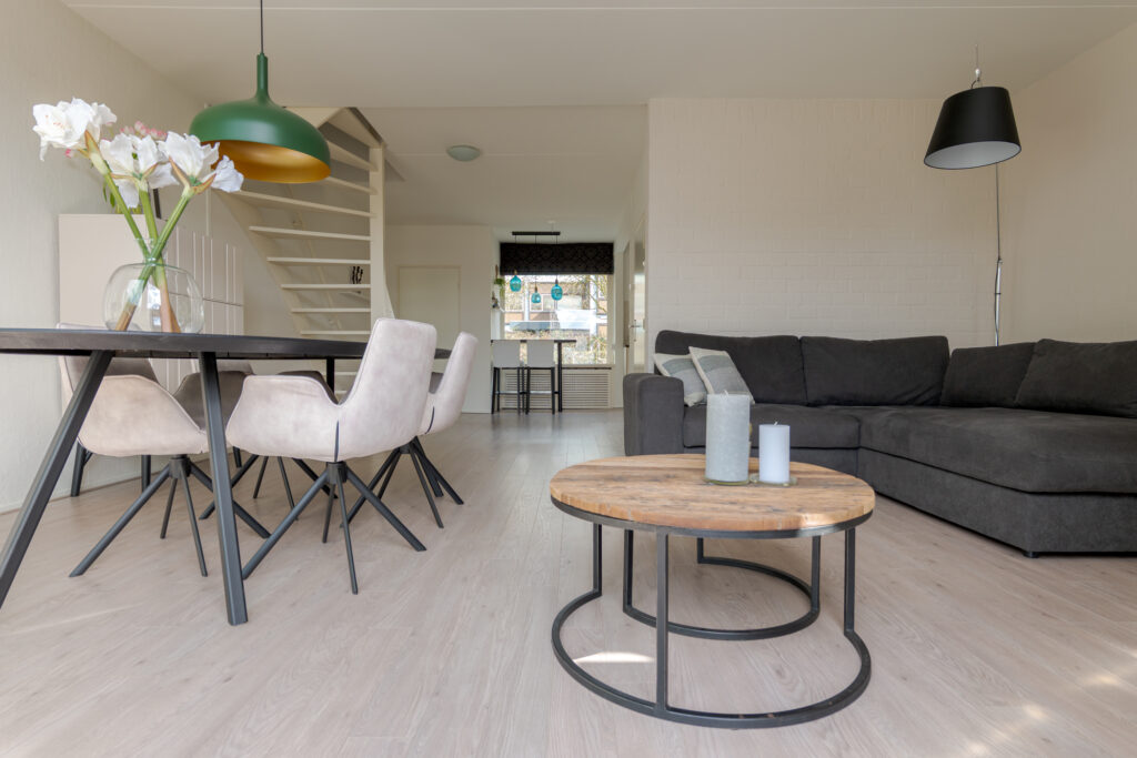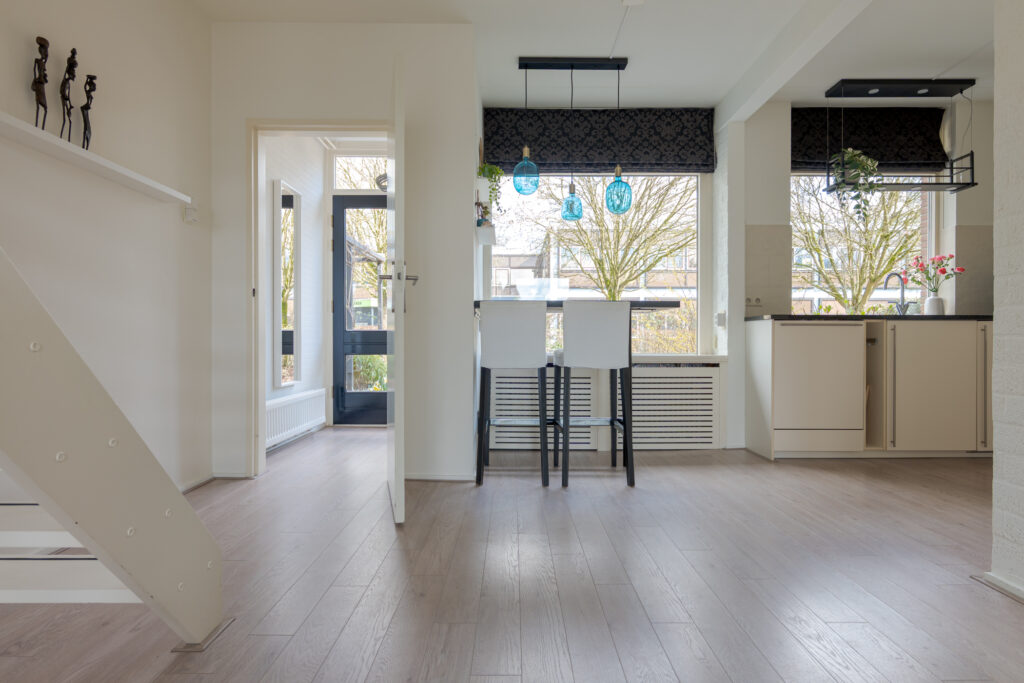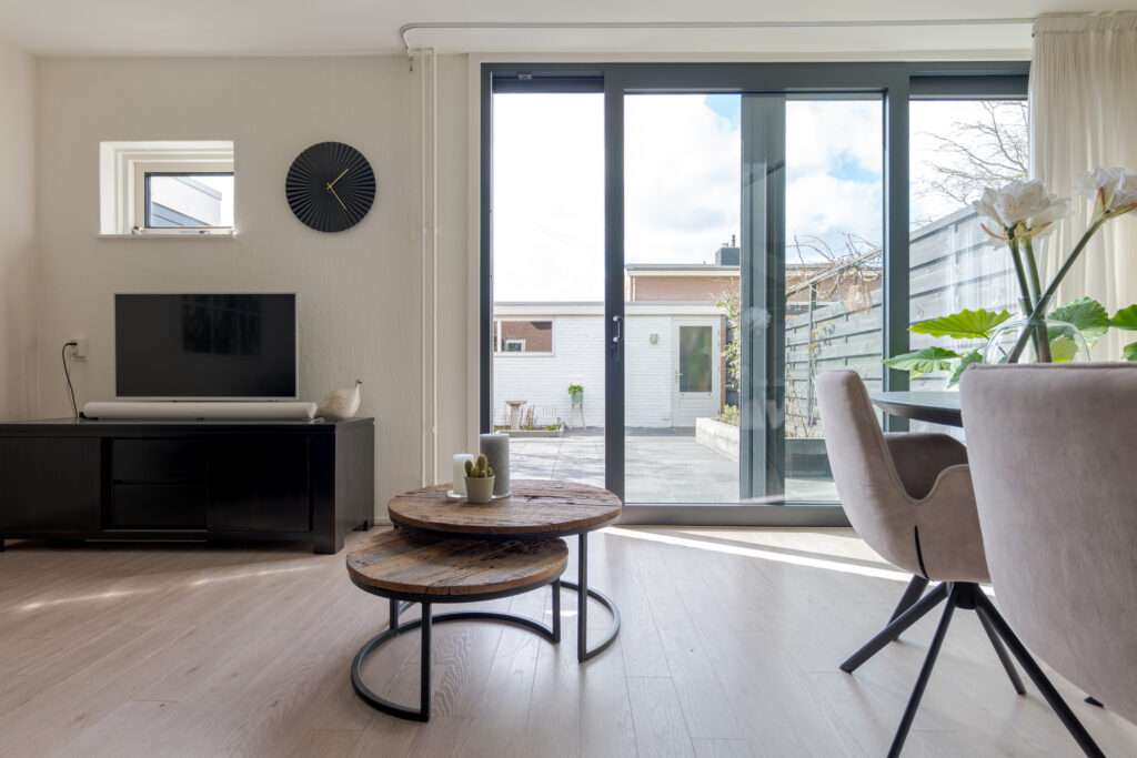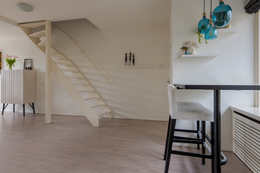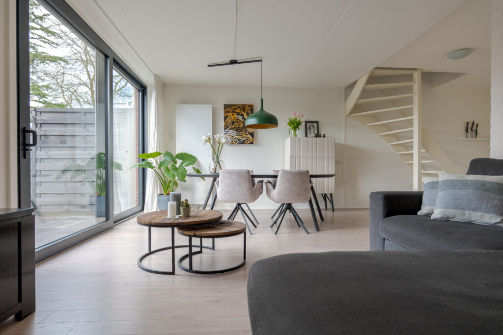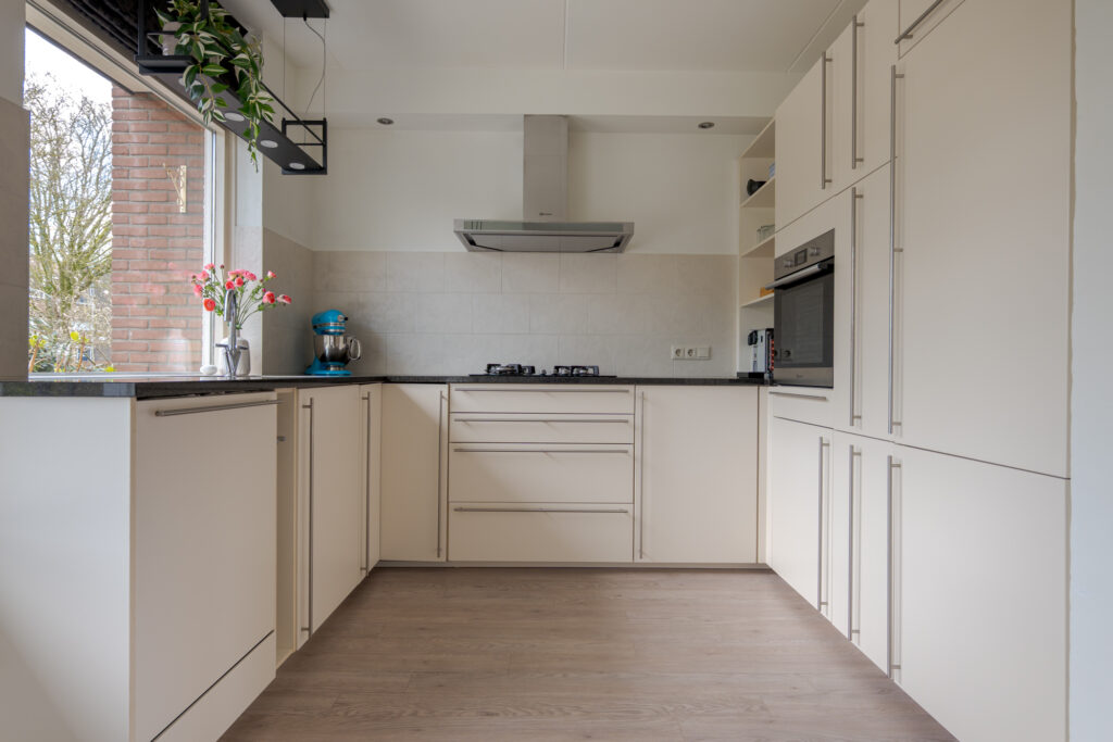 Via de entree aan de voorzijde komt u binnen in de hal met garderobe. Vanuit hier loopt u door naar de ruime woonkamer. Dankzij de grote glazen schuifpui (2023) aan de achterzijde en de diverse raampartijen alsmede de lichte afwerking van wanden en vloer oogt deze leefruimte open en aangenaam licht. De zithoek en eettafel kunnen hier moeiteloos een plek krijgen, terwijl de verbinding met de tuin voor een prettig ruimtelijk geheel zorgt. De keuken ligt aan de voorzijde en is praktisch ingedeeld, in een u-opstelling met moderne lichte fronten. Er bevindt zich tevens een ontbijtbar met zicht op de voortuin. Een fijne plek om ‘s morgens rustig de dag te beginnen met een kopje koffie. Aansluitend aan de woonkamer bevindt zich een portaal met toegang tot het toilet en vaste kast. Via de trap in de woonkamer komt u op de eerste verdieping.