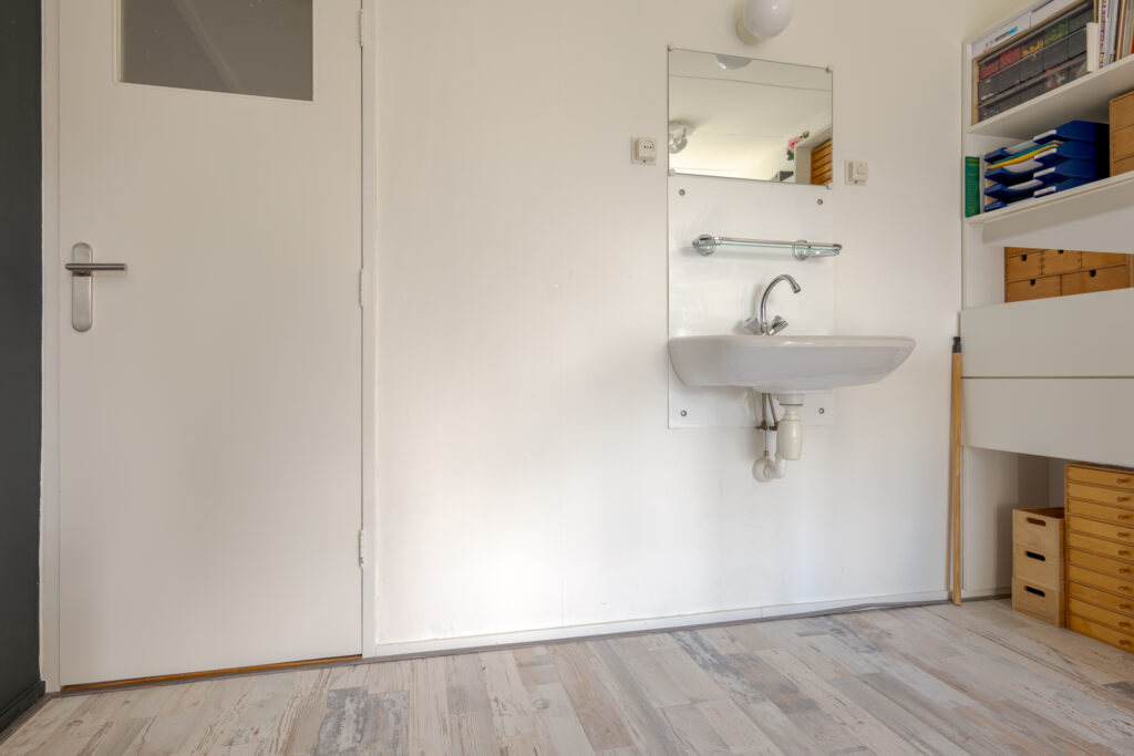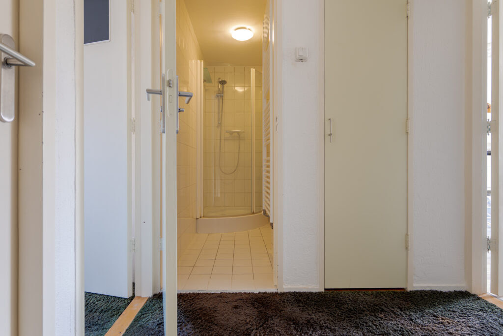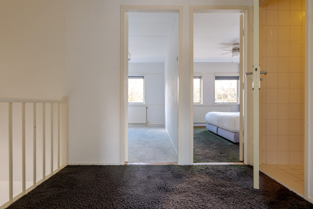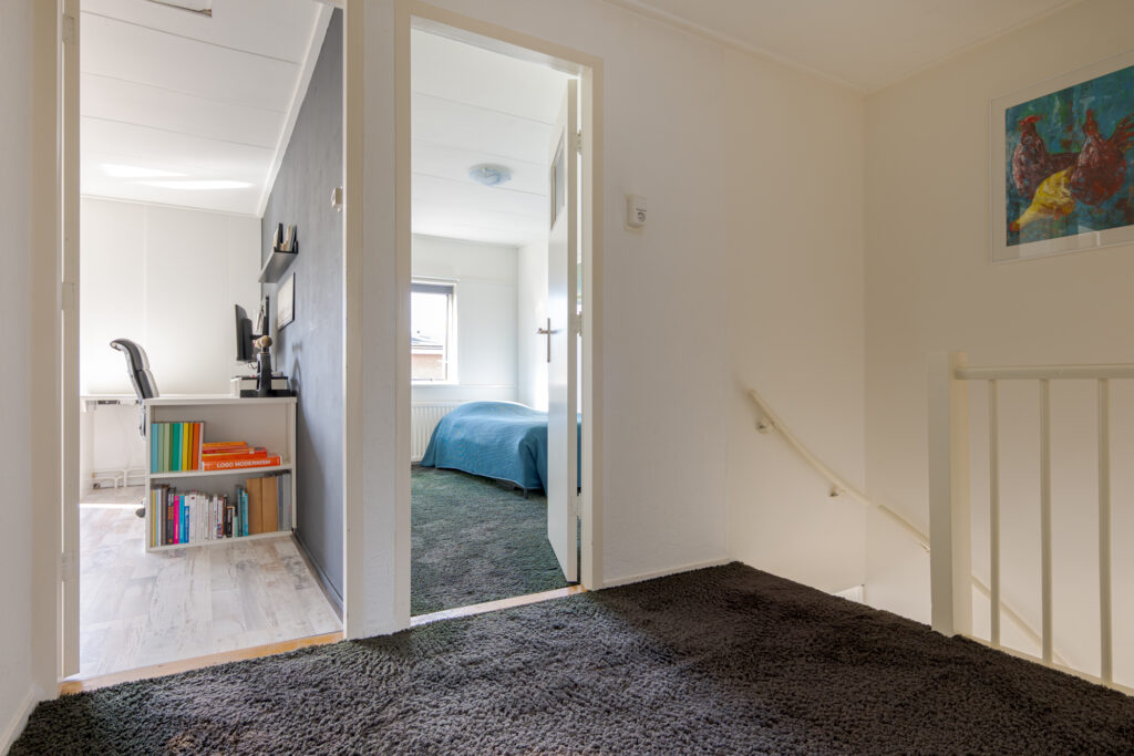 Op de eerste verdieping geeft de overloop toegang tot maar liefst vier slaapkamers en de badkamer. Twee slaapkamers zijn ruimer van opzet, terwijl de andere kamers ook uitstekend gebruikt kunnen worden als kinder-, werk- of logeerkamer. De badkamer is compact en functioneel ingedeeld met douche en wastafel en toilet. Vanuit een van de slaapkamers is er middels een vlizotrap toegang tot een bergzolder.