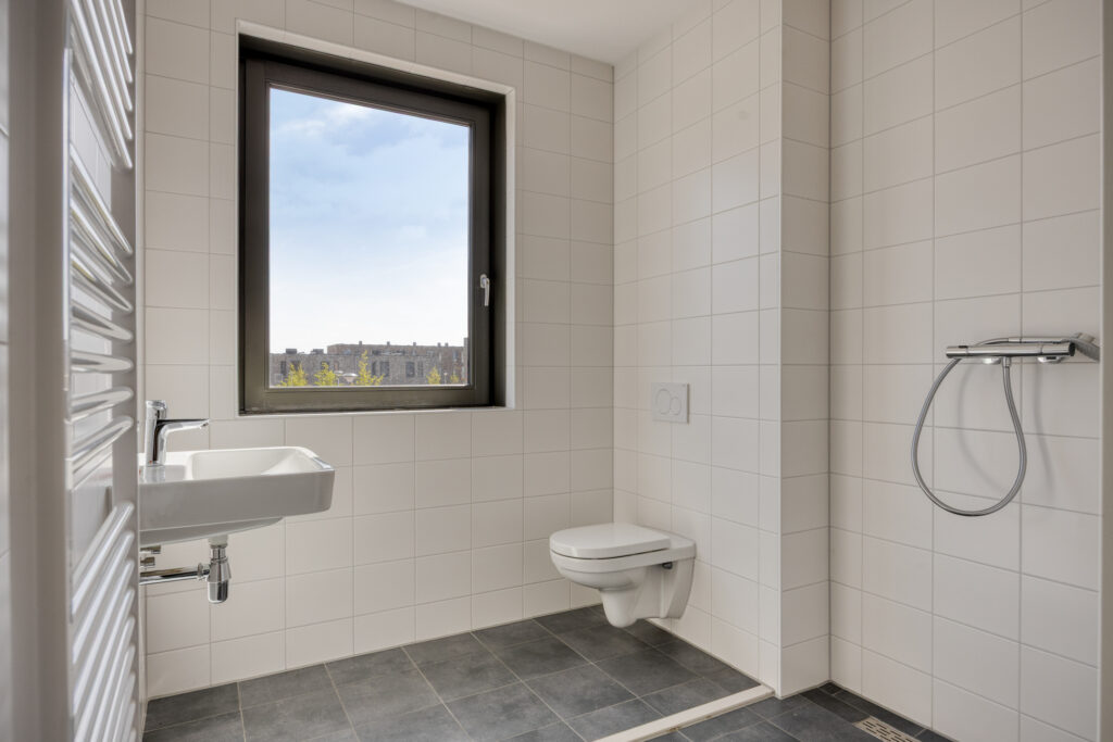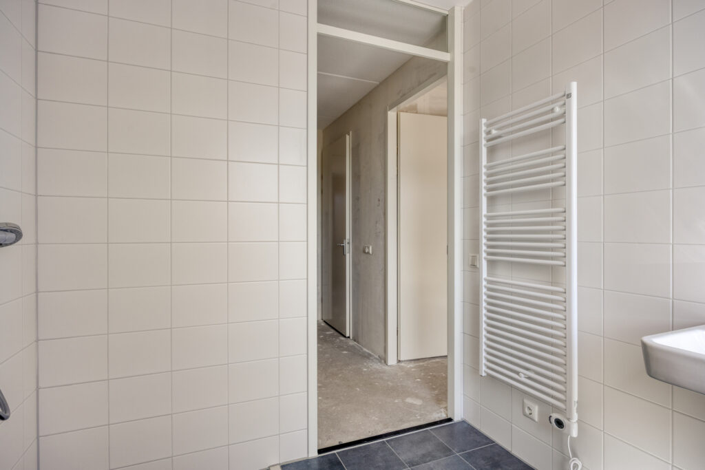 Op de eerste verdieping komt u op de overloop met toegang tot twee goed bemeten slaapkamers. De badkamer is voorzien van een douche, wastafel en toilet en beschikt over vloerverwarming, wat zorgt voor extra comfort. Daarnaast is er een aparte wasruimte op de overloop aanwezig, ideaal voor het netjes wegwerken van de wasmachine en droger en als bergruimte.