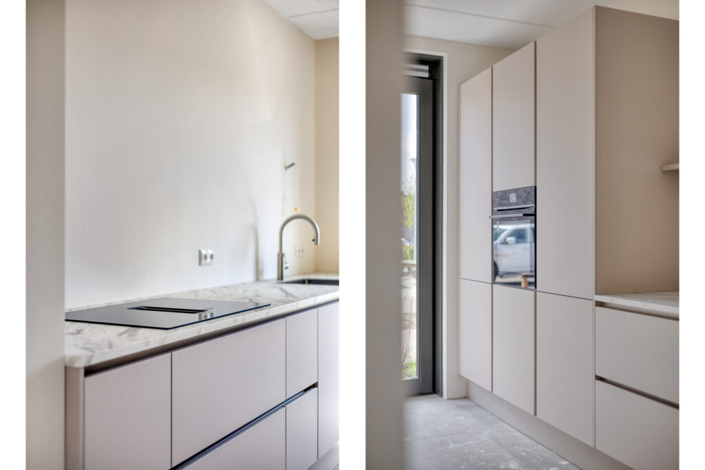 Bij binnenkomst betreedt u de hal met toegang tot het toilet, de meterkast en de trapopgang. Aan de voorzijde van de woning bevindt zich de moderne keukenopstelling met inbouwapparatuur en veel berg- en werkruimte. De keuken is strak afgewerkt met taupekleurige kasten lades en een marmerlook aanrechtblad. Het biedt een uitstekende basis om de beneden verdieping verder naar eigen smaak verderaf te werken.