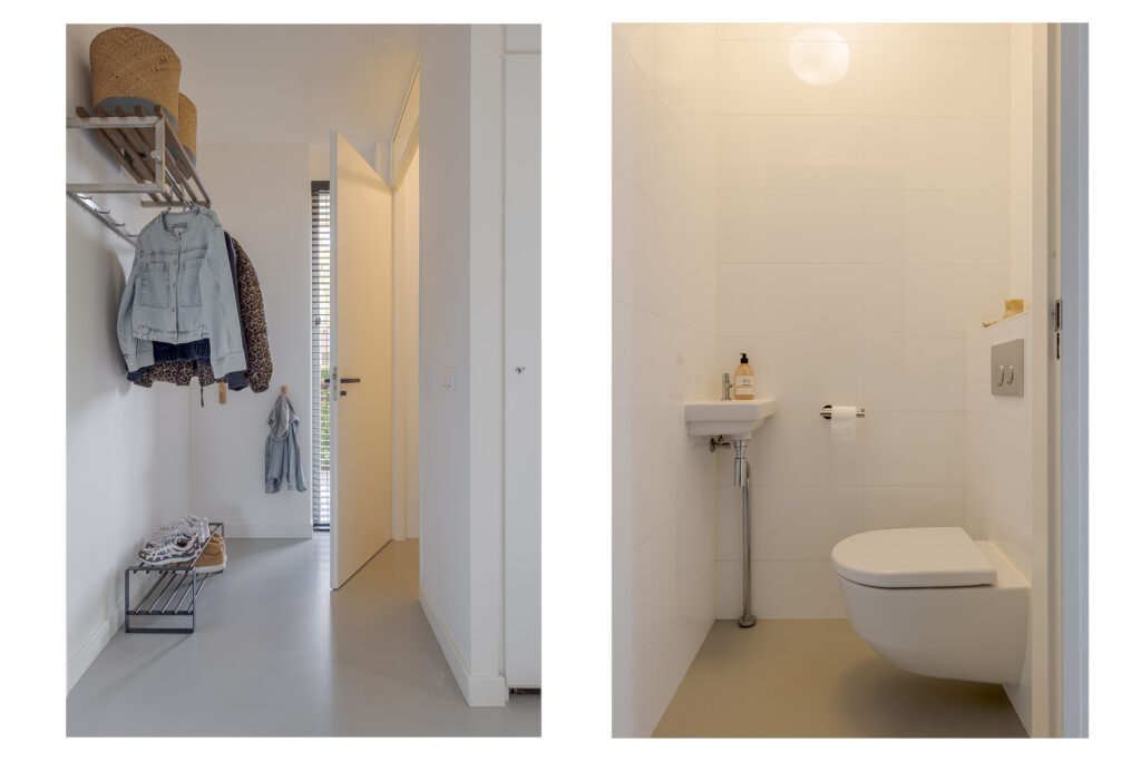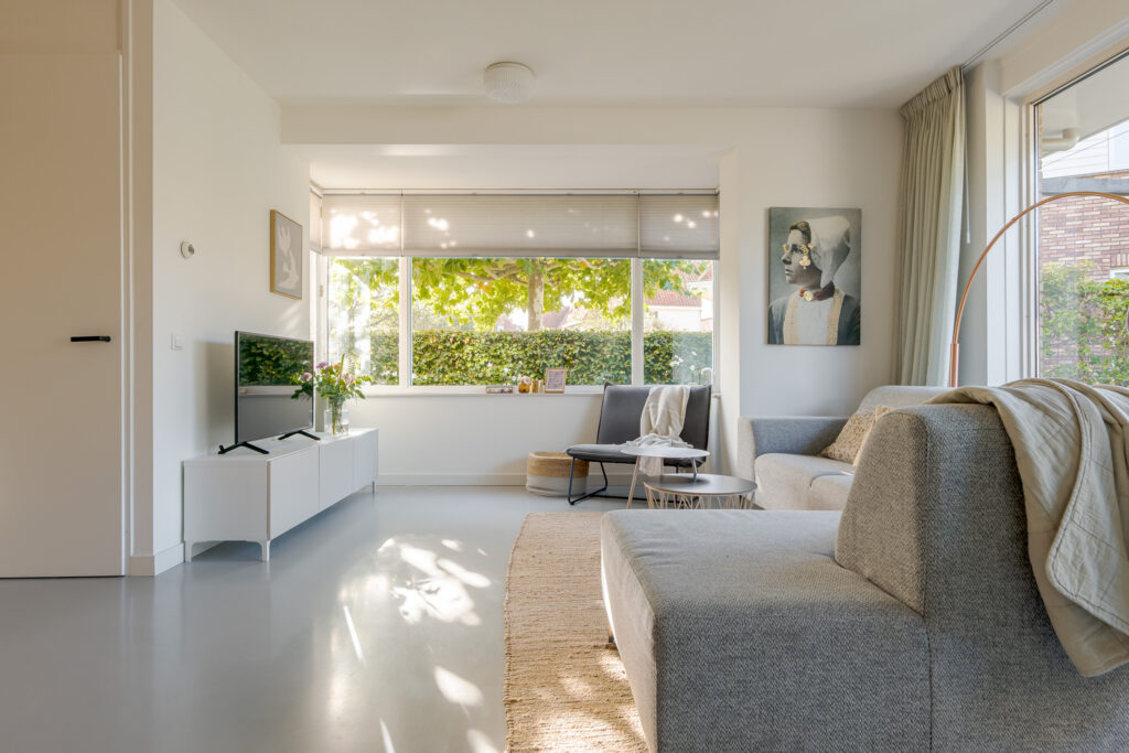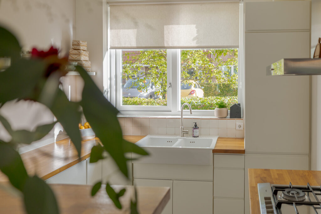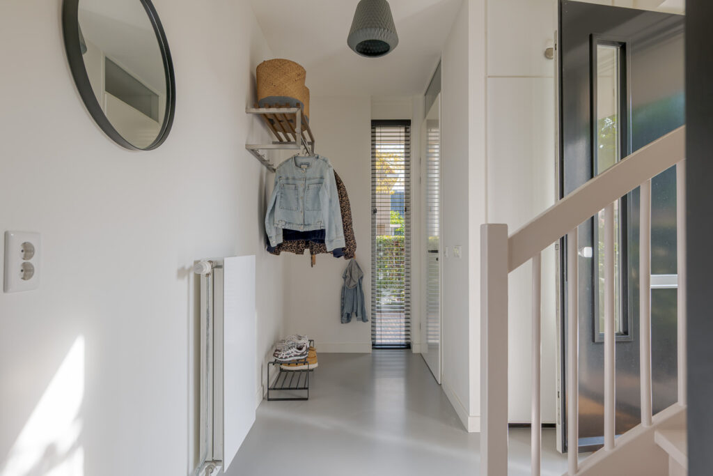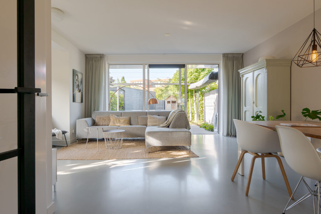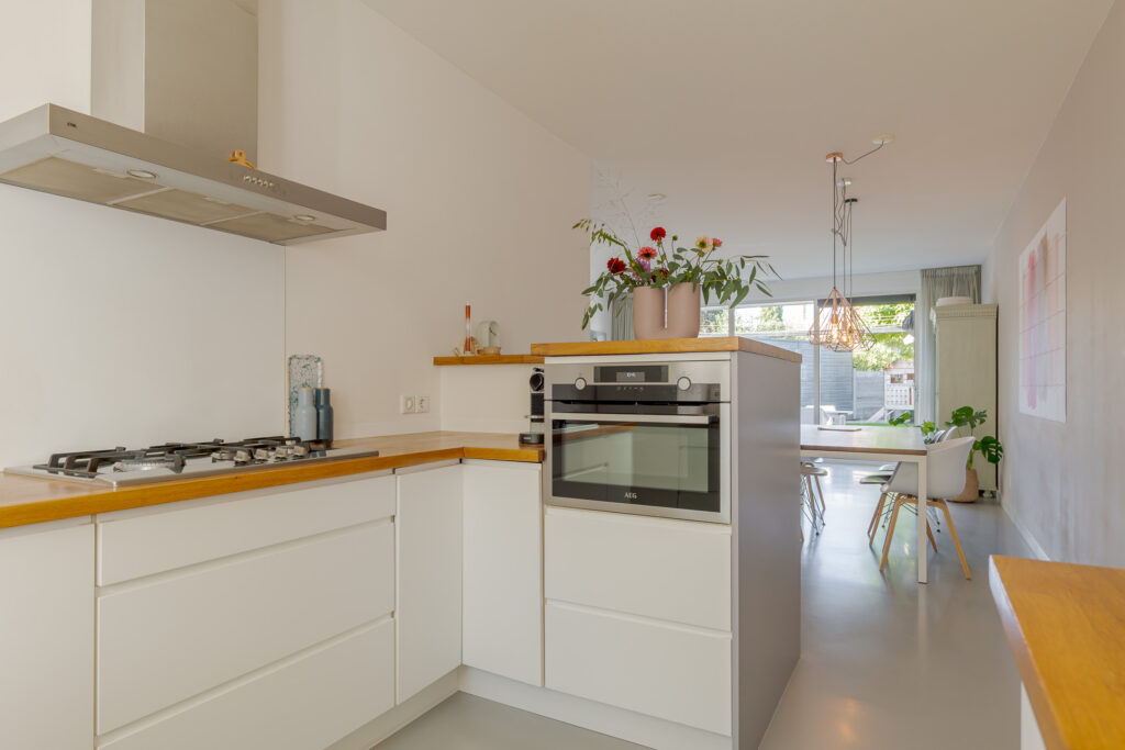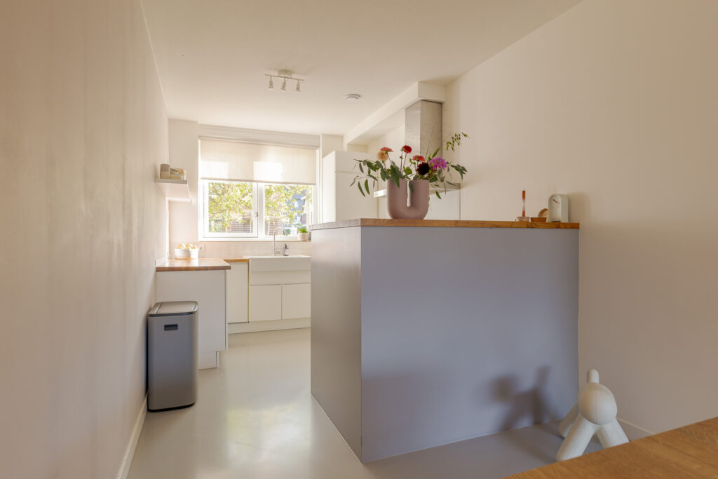 Via de entree komt u binnen in de hal met toilet en toegang tot de woonkamer. Hier kunt u al zien dat de hele woning goed is onderhouden en dat de huidige bewoners veel zorg hebben besteed aan onderhoud en sfeer. Alles is mooi strak afgewerkt en is fris van kleur. De woonkamer is ruim opgezet en profiteert van veel lichtinval dankzij de grote raampartijen en de schuifpui aan de tuinzijde. Hierdoor ontstaat een prettige verbinding tussen binnen en buiten. De keuken, aan de voorzijde van de woning gesitueerd, is praktisch ingedeeld en biedt voldoende werk- en kastruimte. De combinatie van witte fronten en het houten keukenblad houdt deze ruimte overzichtelijk en geeft het een rustige sfeer. De leefruimte beneden is voorzien van mooie strakke grijze gietvloer.