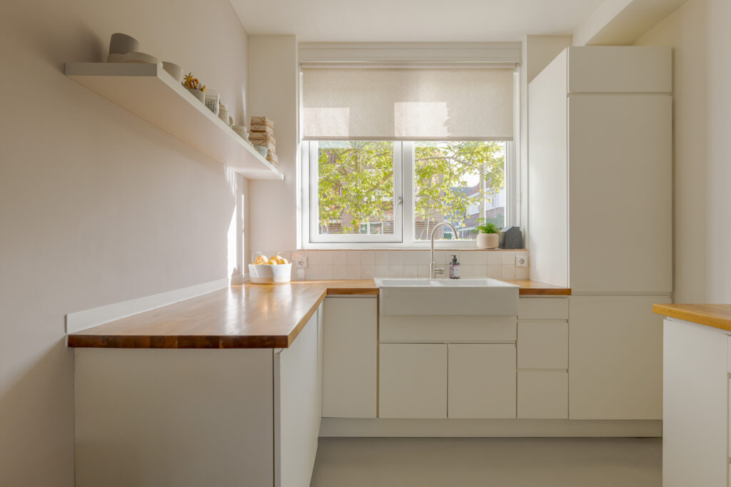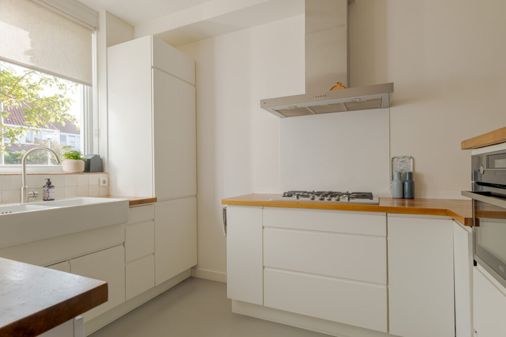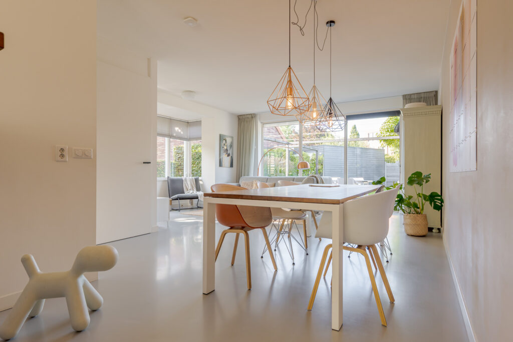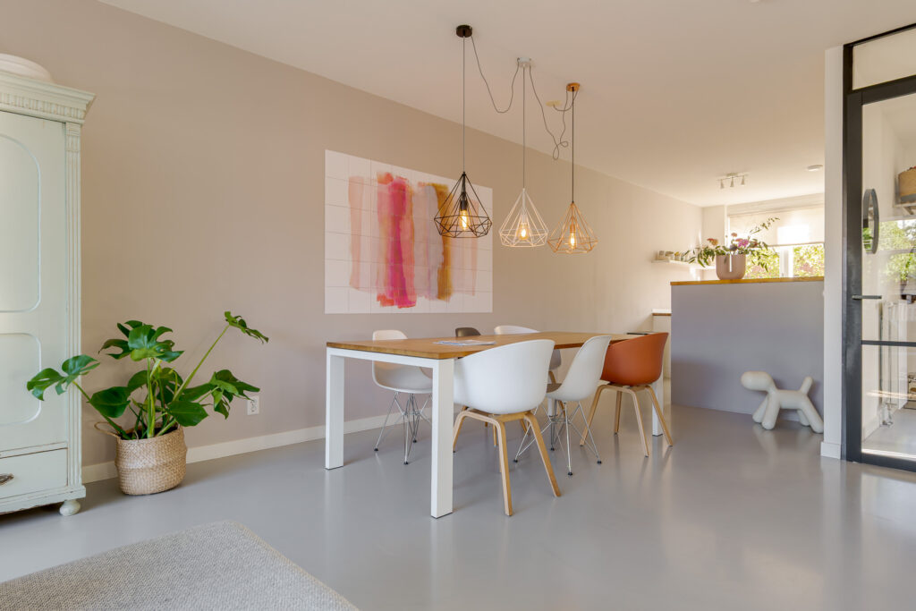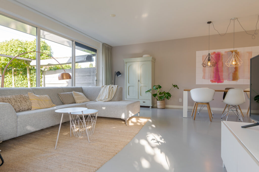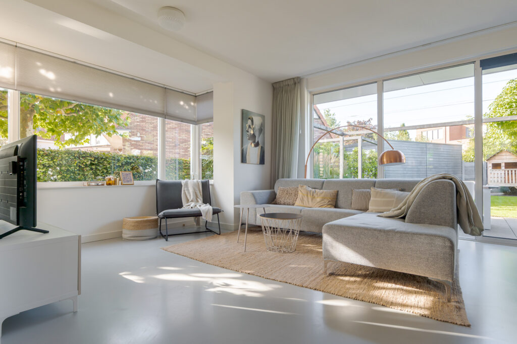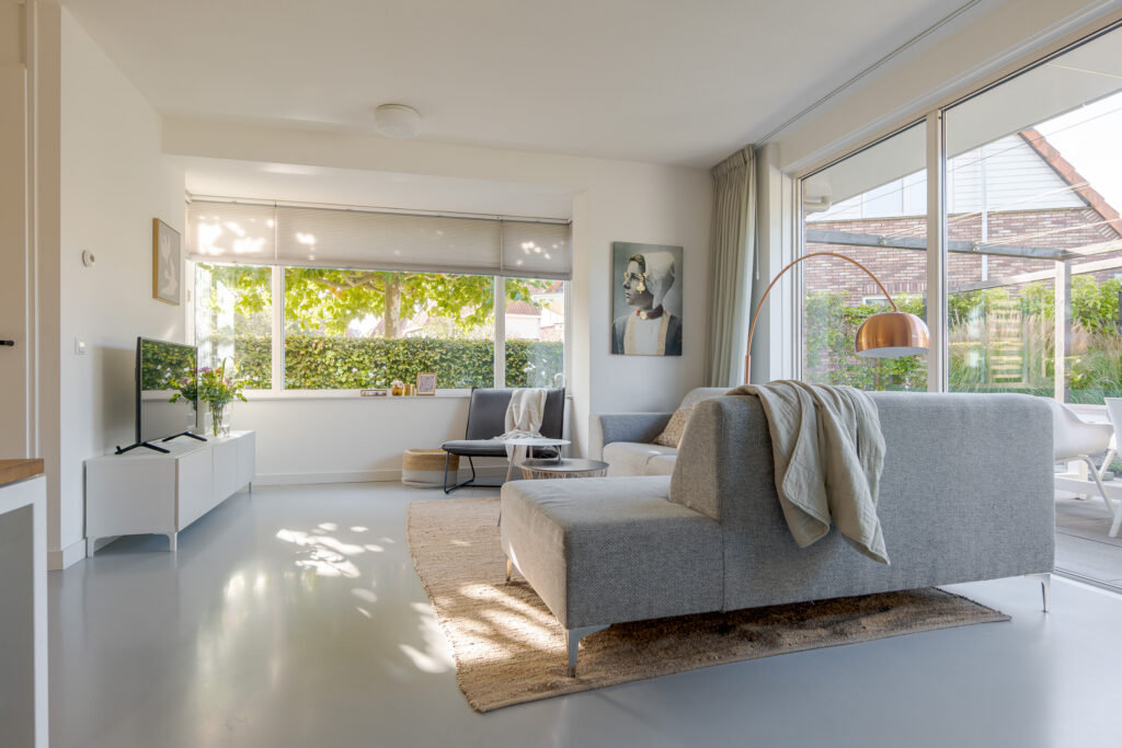 Via de entree komt u binnen in de hal met toilet en toegang tot de woonkamer. Hier kunt u al zien dat de hele woning goed is onderhouden en dat de huidige bewoners veel zorg hebben besteed aan onderhoud en sfeer. Alles is mooi strak afgewerkt en is fris van kleur. De woonkamer is ruim opgezet en profiteert van veel lichtinval dankzij de grote raampartijen en de schuifpui aan de tuinzijde. Hierdoor ontstaat een prettige verbinding tussen binnen en buiten. De keuken, aan de voorzijde van de woning gesitueerd, is praktisch ingedeeld en biedt voldoende werk- en kastruimte. De combinatie van witte fronten en het houten keukenblad houdt deze ruimte overzichtelijk en geeft het een rustige sfeer. De leefruimte beneden is voorzien van mooie strakke grijze gietvloer.