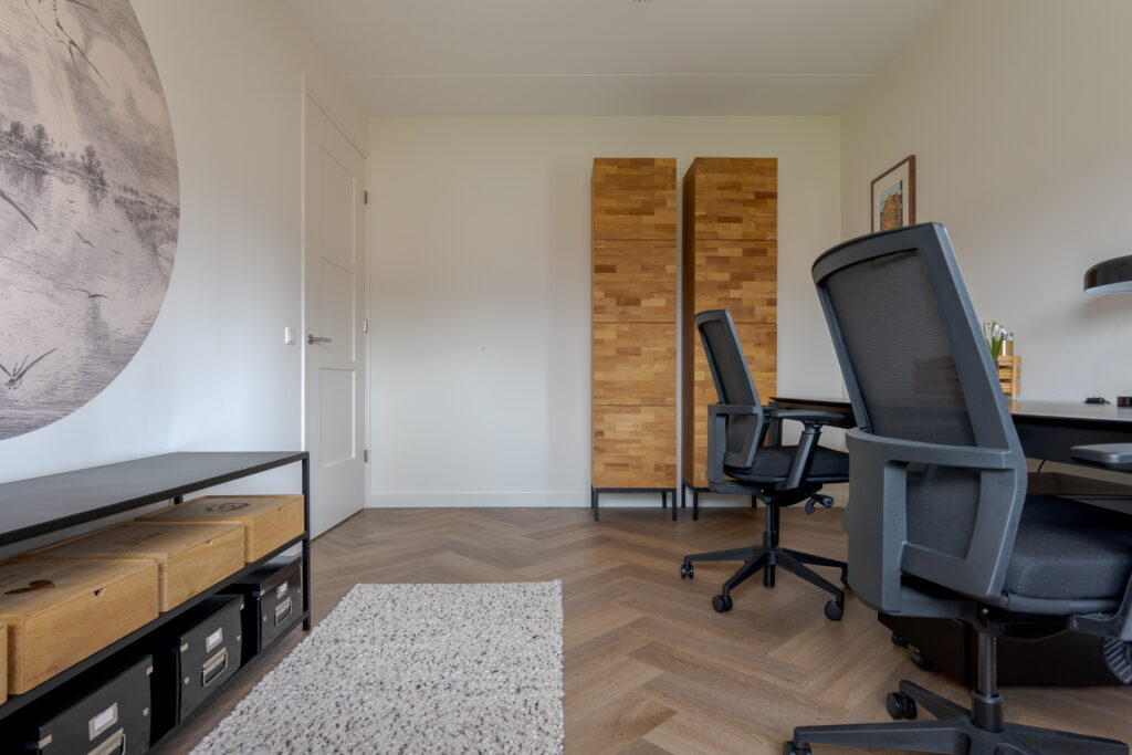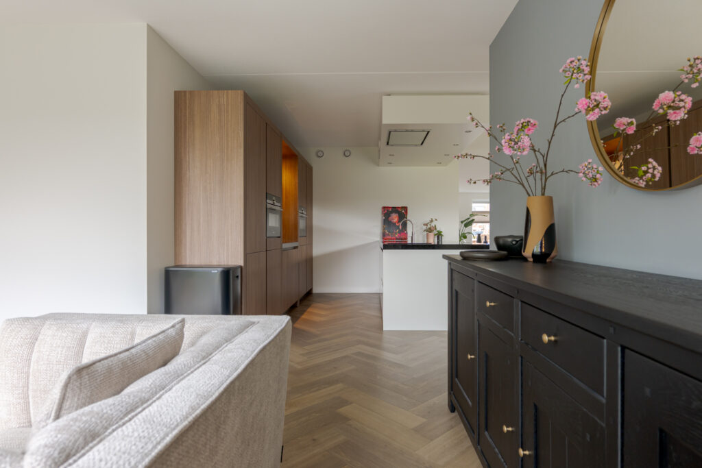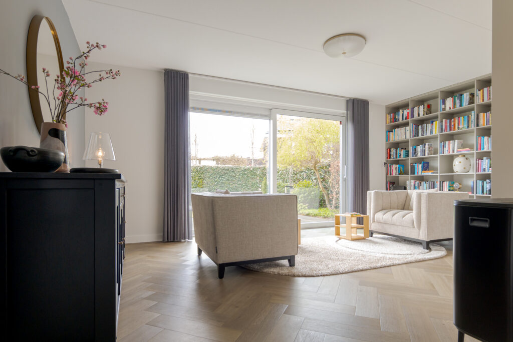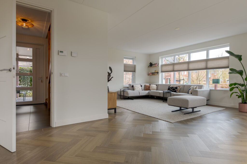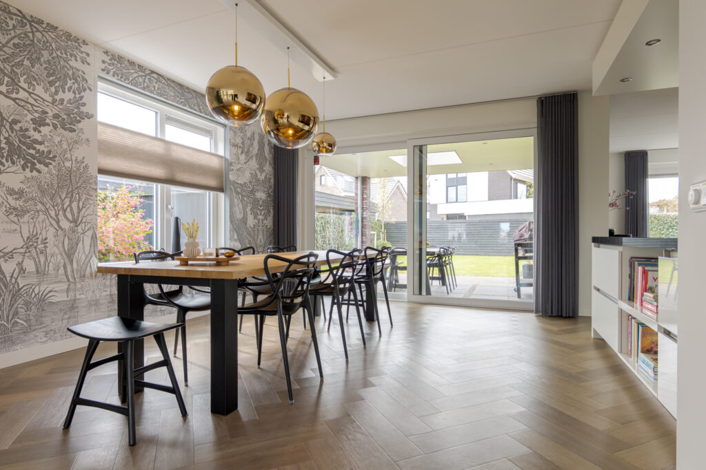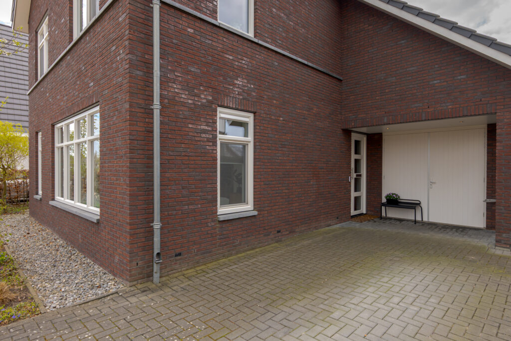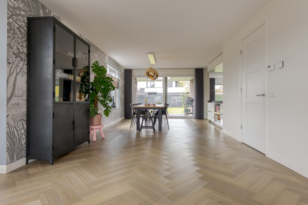 Wie de rust even wil opzoeken, loopt via de keuken naar de tuinkamer. Een heerlijke plek om te ontspannen. Vanuit deze ruimte is tevens de inpandige garage bereikbaar. Deze is voorzien van elektra en een extra loopdeur aan de zijkant, waardoor de ruimte ook interessant kan zijn voor bijvoorbeeld een kantoor of praktijk aan huis. De begane grond is strak en warm afgewerkt met visgraat PVC, stucwerk en eikenhouten trappen, wat direct de kwalitatieve uitstraling van de woning onderstreept.