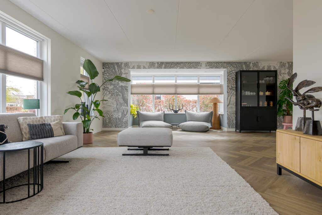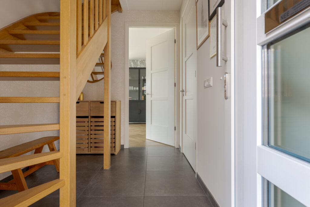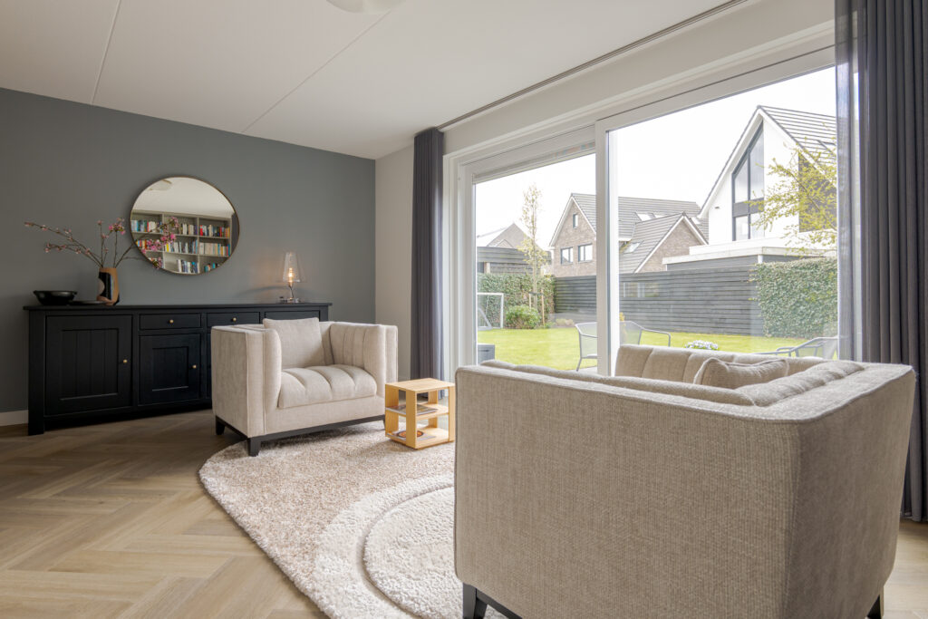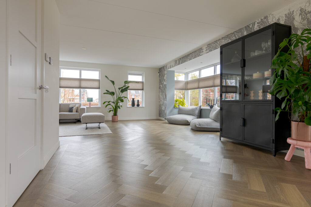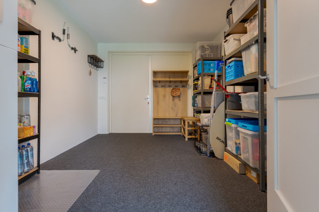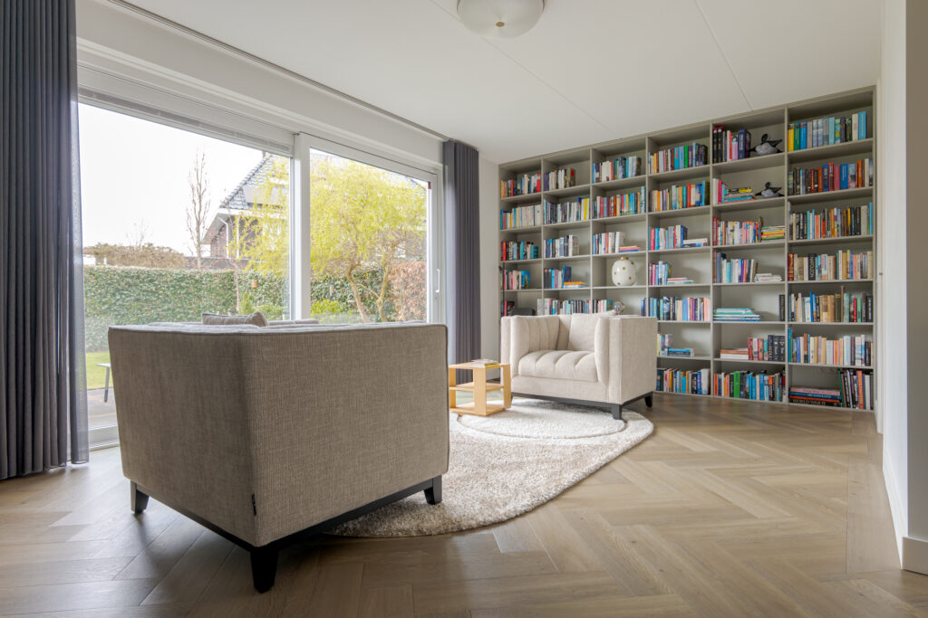 Wie de rust even wil opzoeken, loopt via de keuken naar de tuinkamer. Een heerlijke plek om te ontspannen. Vanuit deze ruimte is tevens de inpandige garage bereikbaar. Deze is voorzien van elektra en een extra loopdeur aan de zijkant, waardoor de ruimte ook interessant kan zijn voor bijvoorbeeld een kantoor of praktijk aan huis. De begane grond is strak en warm afgewerkt met visgraat PVC, stucwerk en eikenhouten trappen, wat direct de kwalitatieve uitstraling van de woning onderstreept.