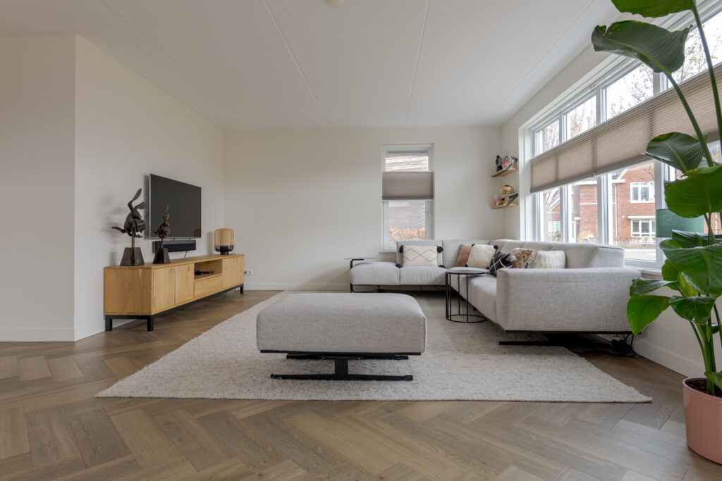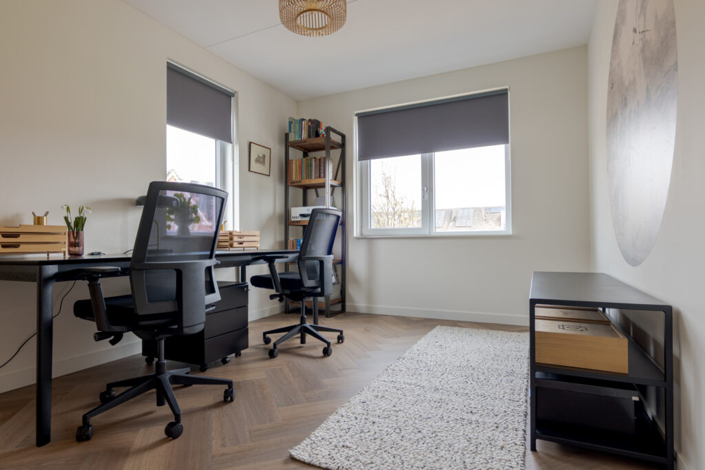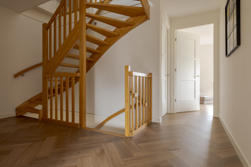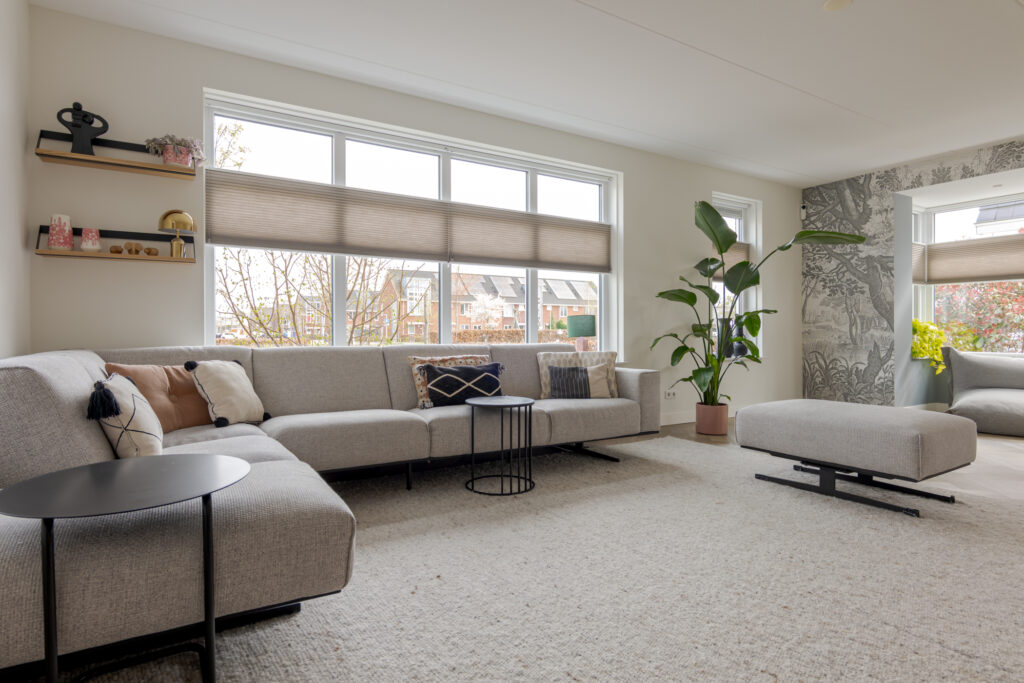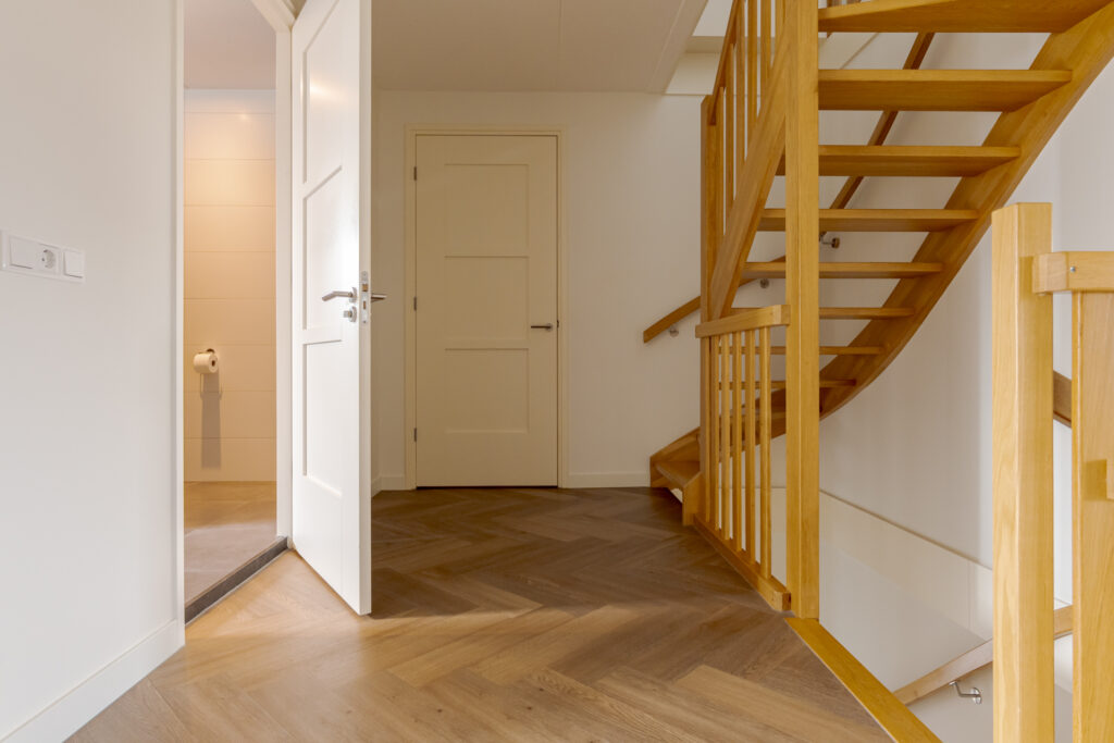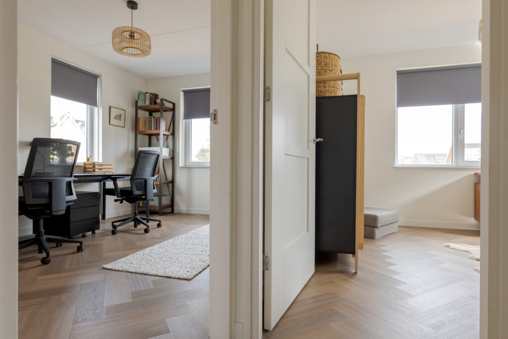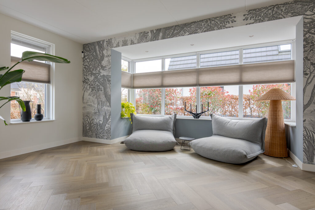 Wie de rust even wil opzoeken, loopt via de keuken naar de tuinkamer. Een heerlijke plek om te ontspannen. Vanuit deze ruimte is tevens de inpandige garage bereikbaar. Deze is voorzien van elektra en een extra loopdeur aan de zijkant, waardoor de ruimte ook interessant kan zijn voor bijvoorbeeld een kantoor of praktijk aan huis. De begane grond is strak en warm afgewerkt met visgraat PVC, stucwerk en eikenhouten trappen, wat direct de kwalitatieve uitstraling van de woning onderstreept.