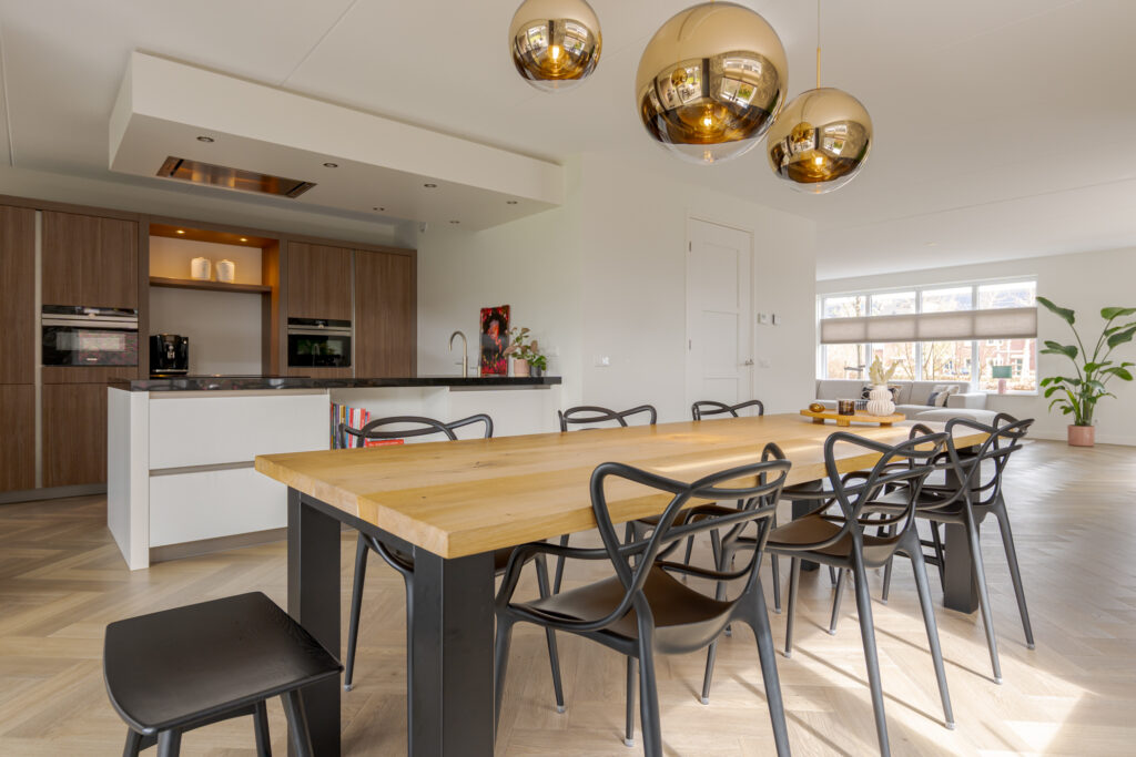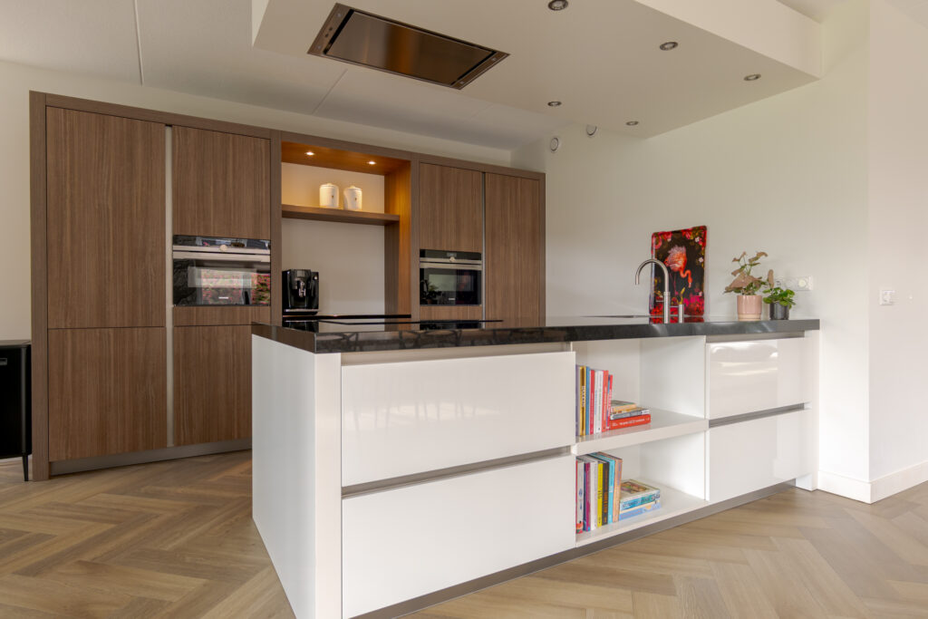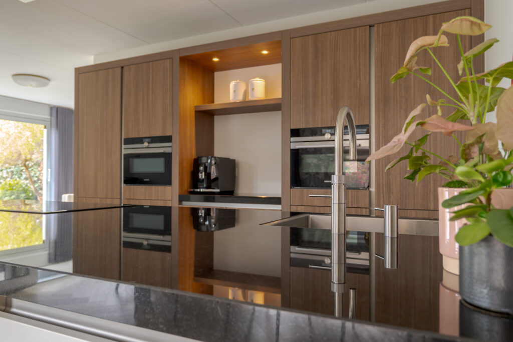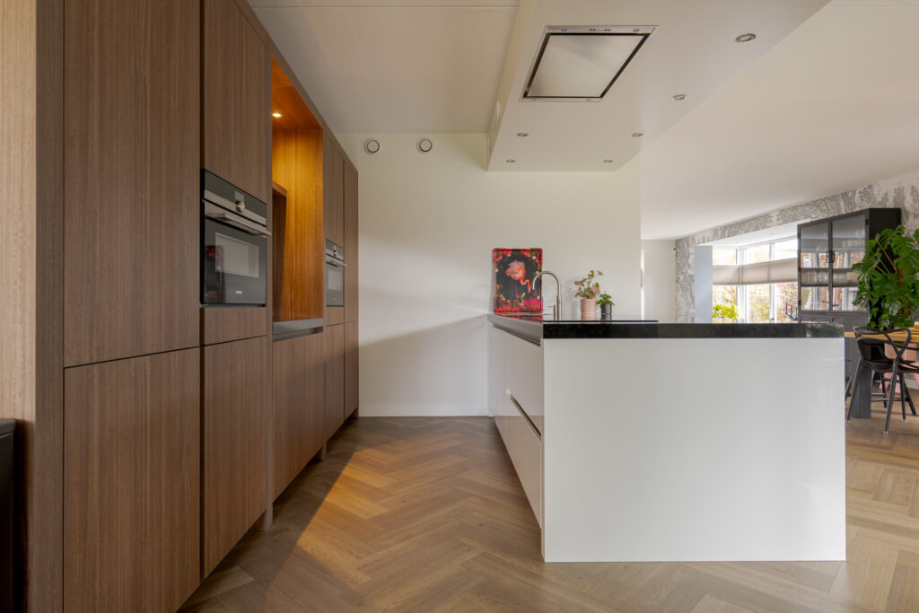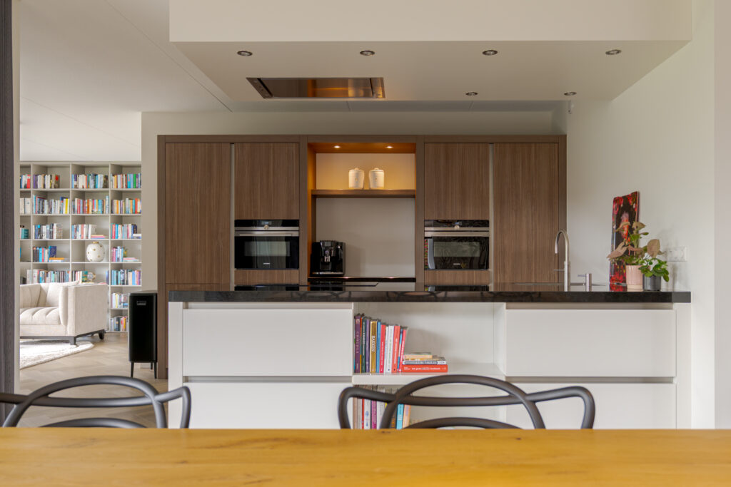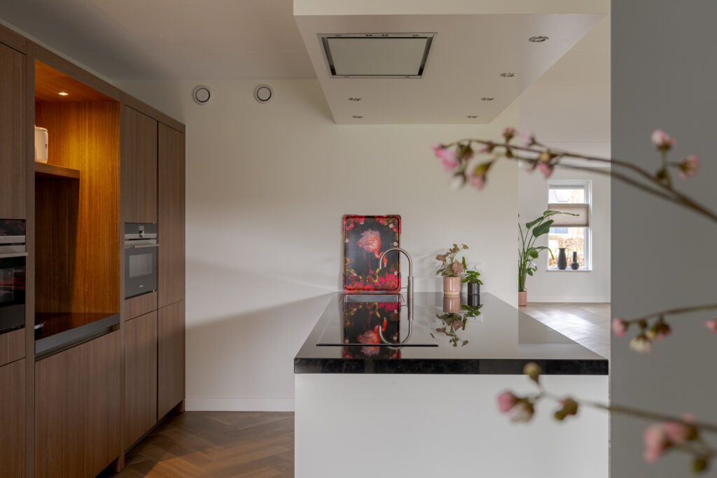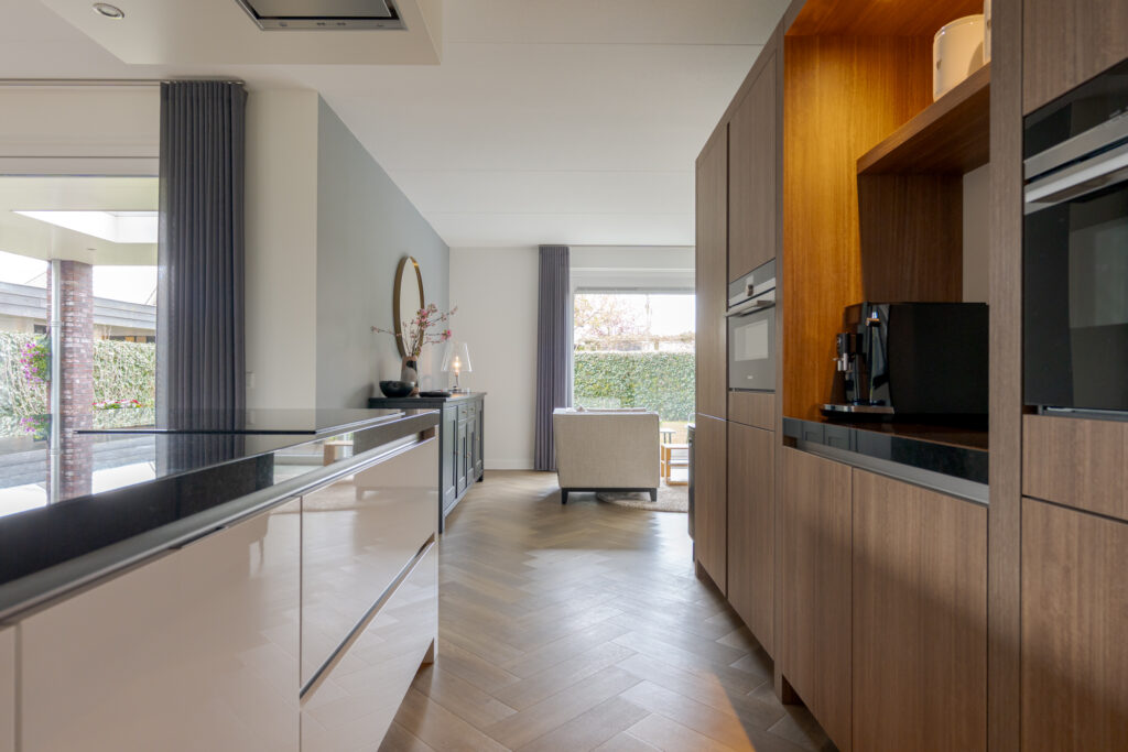 Bij aankomst vallen direct de verzorgde uitstraling, de royale opzet en de fraaie lijnen van de woning op. Via de oprit komt u via de overdekte entree in de hal met toilet, en de trap naar de verdieping. Aan de voorzijde bevindt zich de sfeervolle woonkamer met erker, waar de grote raampartijen zorgen voor prettig daglicht en vrij zicht op het groen. Aansluitend bevindt zich de ruime woonkeuken, uitgevoerd met een schiereiland en kastenwand. Deze keuken is niet alleen stijlvol vormgegeven, maar ook zeer compleet uitgerust met onder meer een inductiekookplaat, afzuigkap, koel-vriescombinatie, combi-oven/magnetron, stoomoven, vaatwasser en een Quooker. Dankzij de open opzet staat de keuken in fijne verbinding met de leefruimtes, wat deze verdieping zeer geschikt maakt voor zowel het dagelijks gezinsleven als gezellige avonden met gasten.