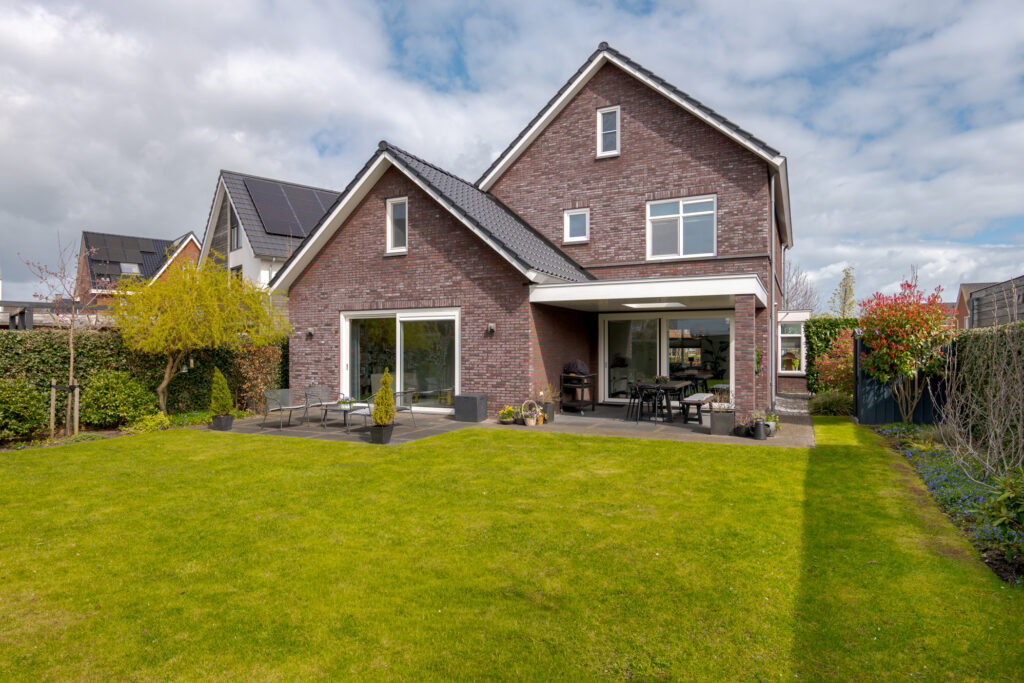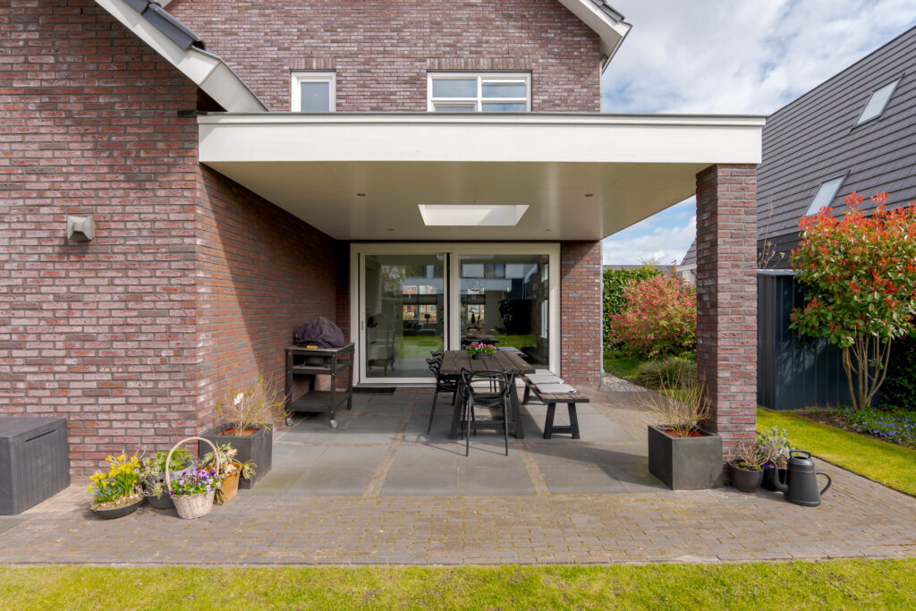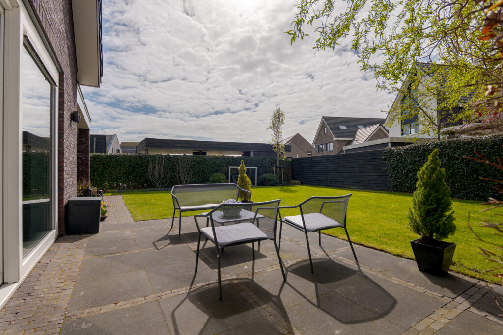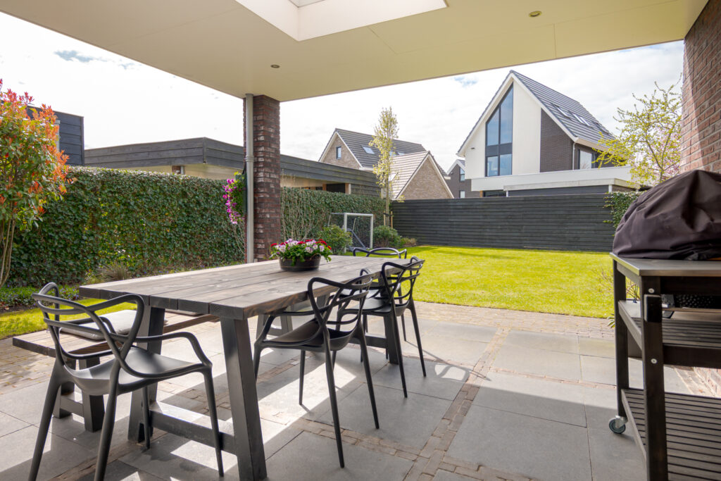 Ook buiten is het wooncomfort hoog. De tuin ligt op het zuidwesten en biedt daarmee een fijne zonligging. Via de schuifpui bereikt u het overdekte terras, waar u beschut buiten kunt zitten en optimaal kunt genieten van de tuin. In combinatie met de vrije ligging, de ruimte rondom de woning en de verzorgde opzet is dit een heerlijke plek voor het hele gezin om buiten te leven.