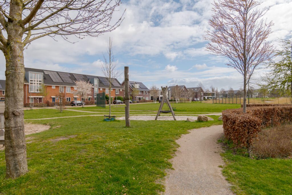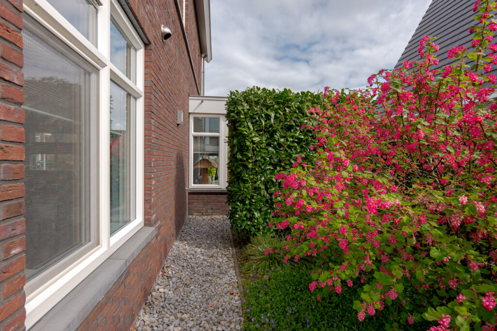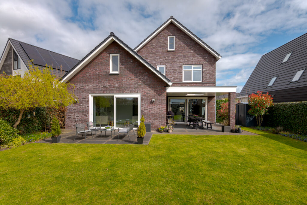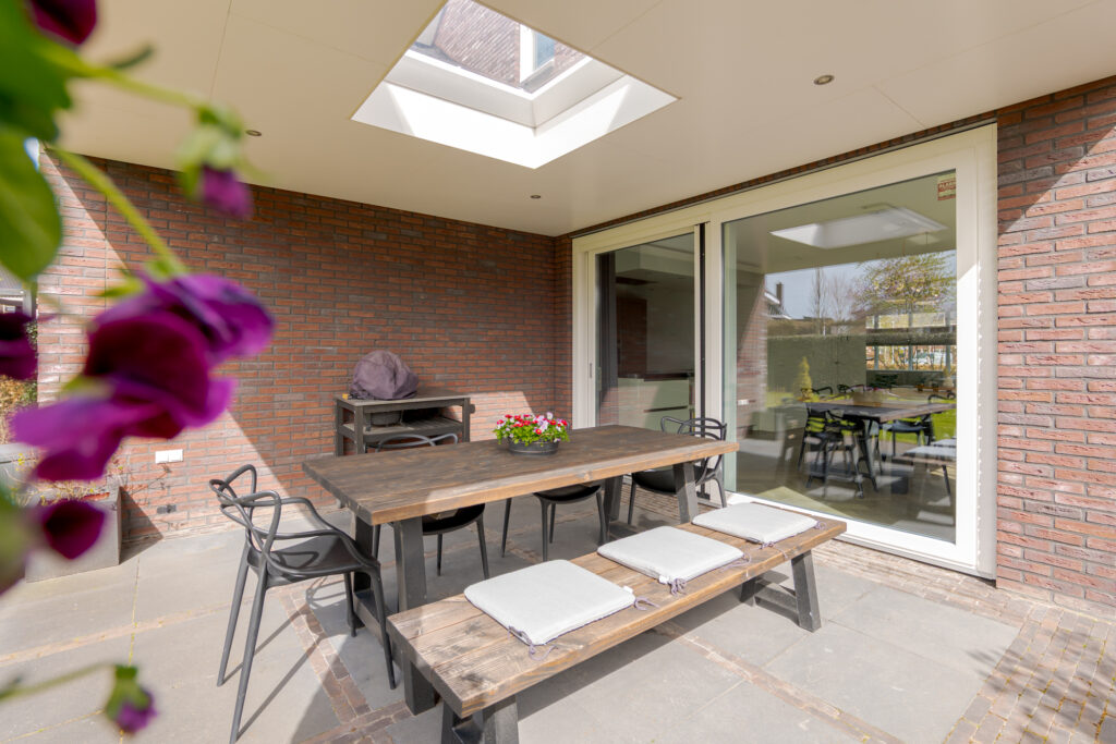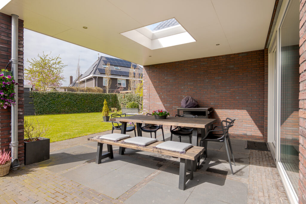 Ook buiten is het wooncomfort hoog. De tuin ligt op het zuidwesten en biedt daarmee een fijne zonligging. Via de schuifpui bereikt u het overdekte terras, waar u beschut buiten kunt zitten en optimaal kunt genieten van de tuin. In combinatie met de vrije ligging, de ruimte rondom de woning en de verzorgde opzet is dit een heerlijke plek voor het hele gezin om buiten te leven.