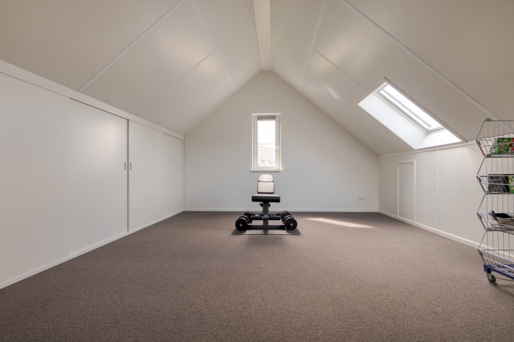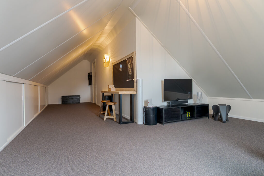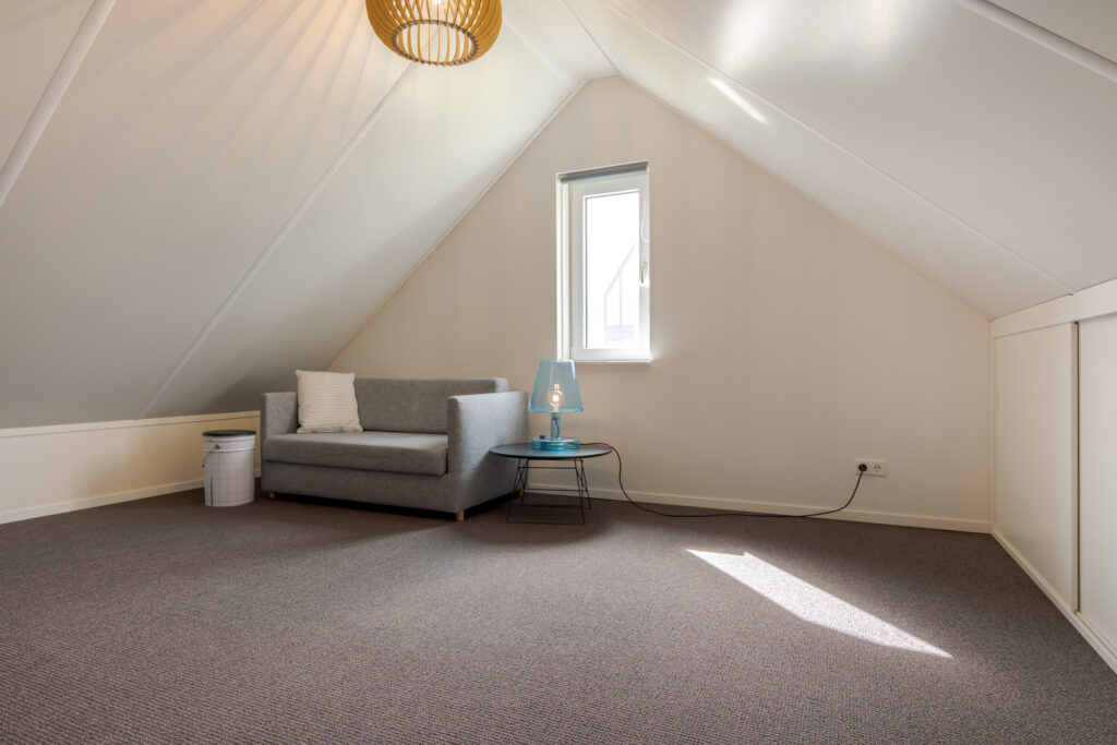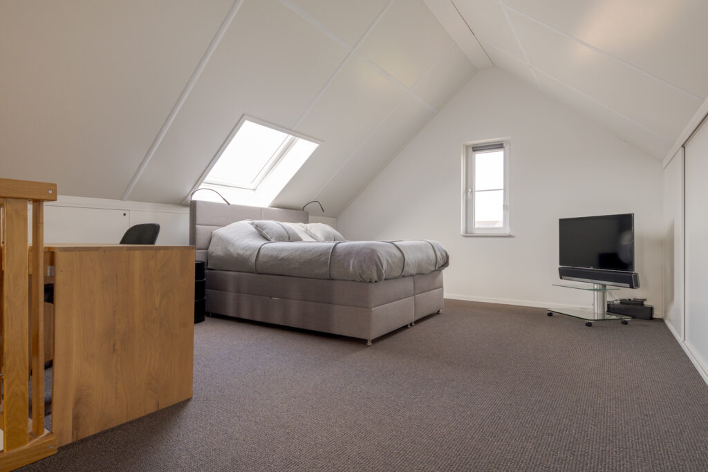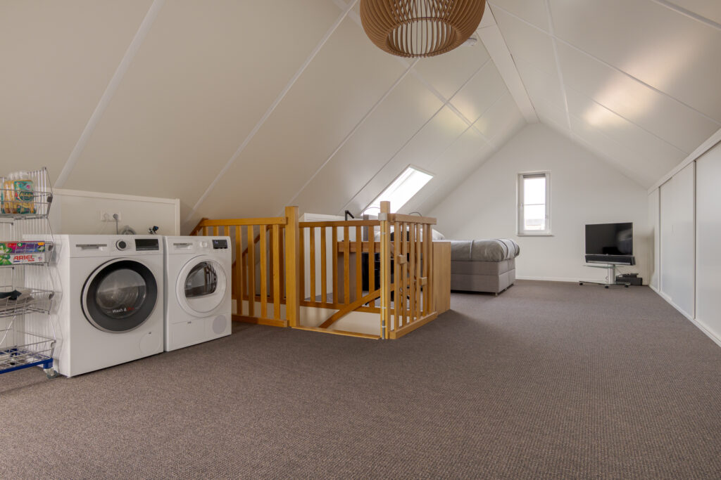 De tweede verdieping bestaat uit een royale open zolderverdieping met wasmachine-opstelling en volop bergruimte achter de op maat gemaakte vaste kasten en knieschotten. Dankzij de ramen aan voor- en achterzijde en de dakramen is dit een lichte en goed bruikbare verdieping, die desgewenst nog verder kan worden ingedeeld.