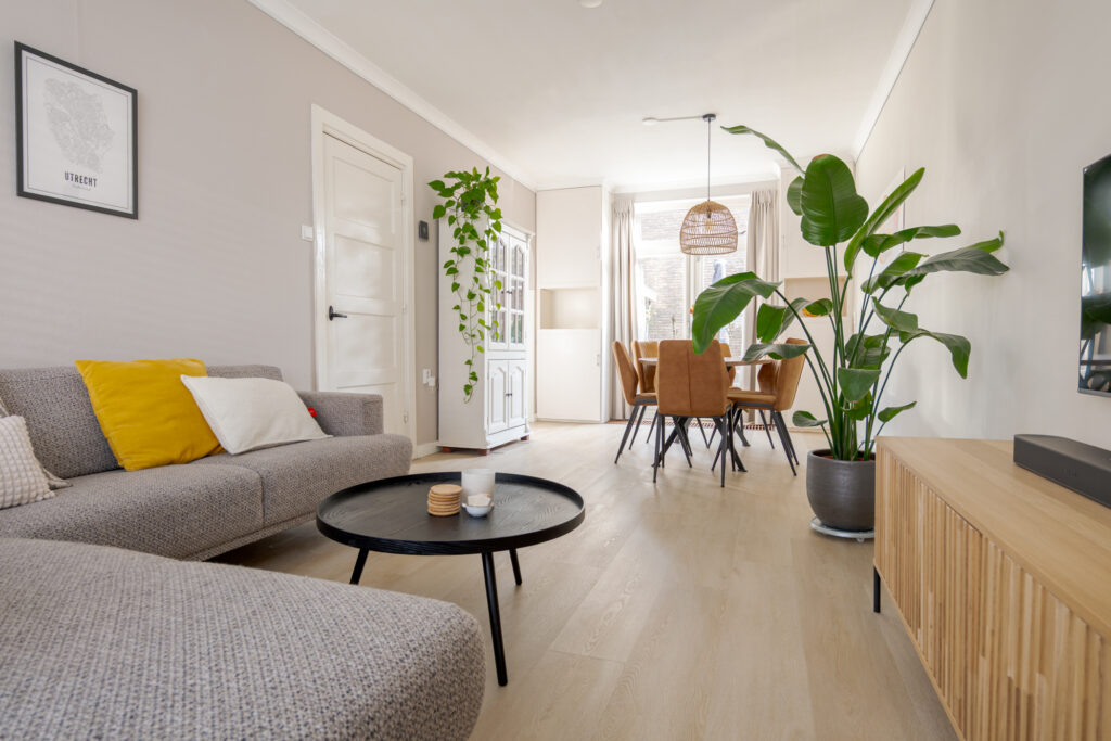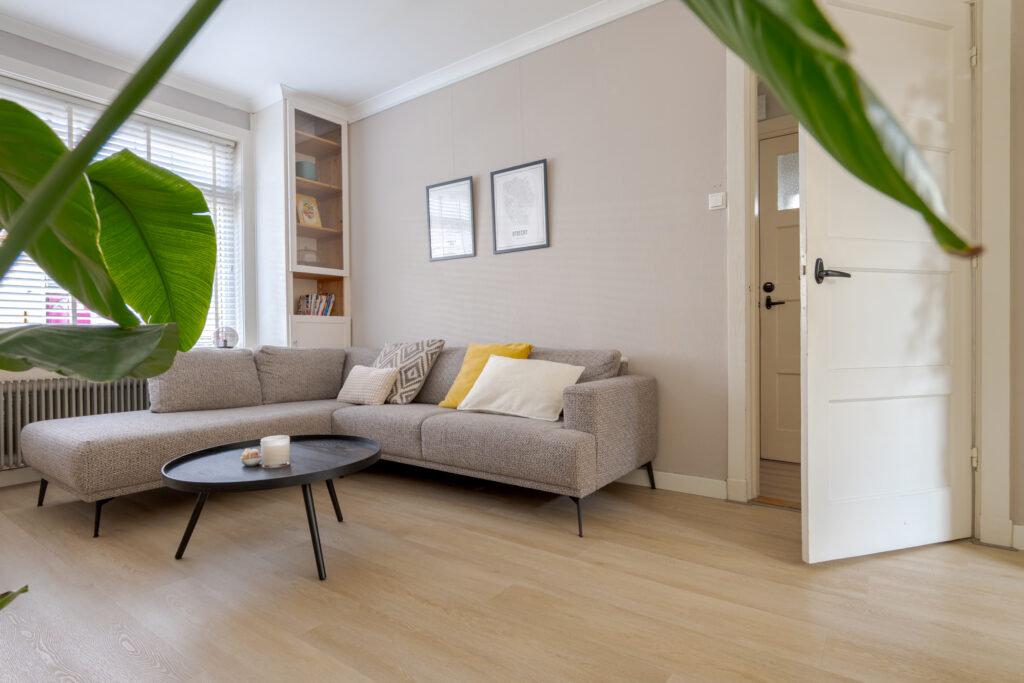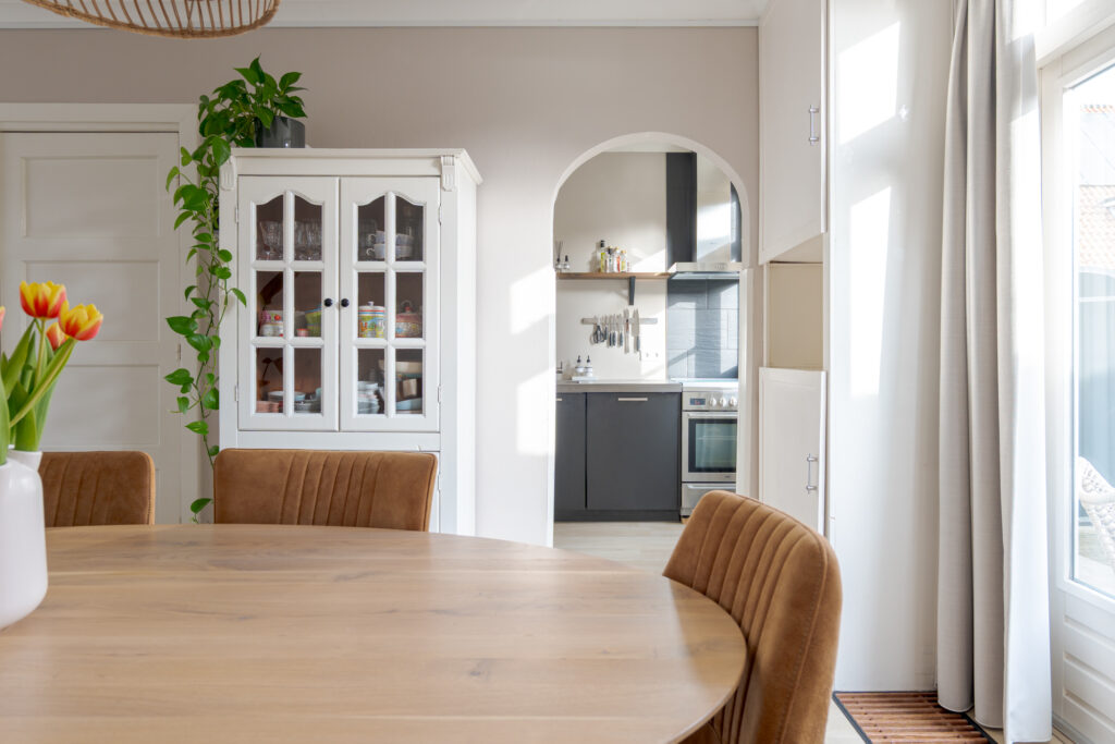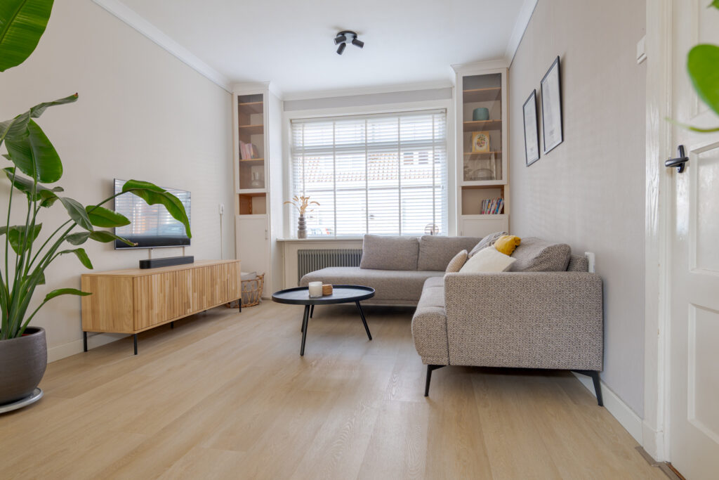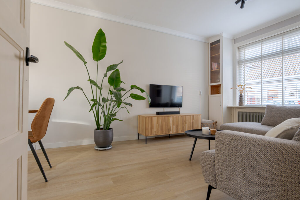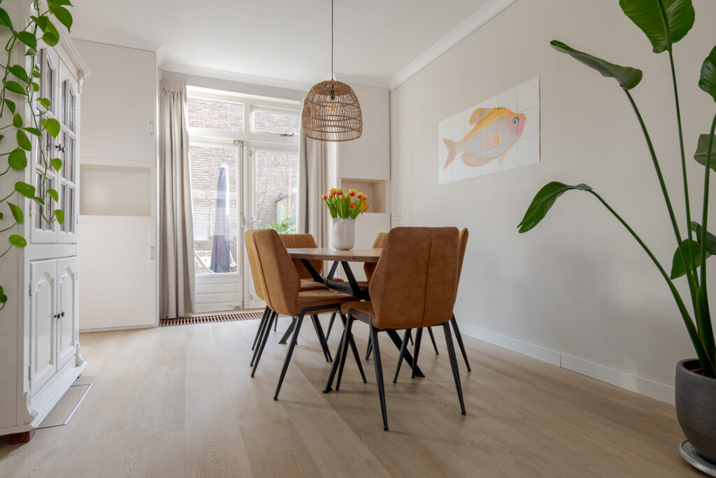 De woonkamer voelt direct prettig aan. Dankzij de grote raampartijen aan zowel de voor- als achterzijde valt het daglicht rijkelijk naar binnen. De houtlook PVCvloer en de rustige kleurstelling zorgen voor een warme basis waarin u zich direct thuis zult voelen. Er is een voorzetwand geplaatst tegen de wand met de buren. Aan de achterzijde openen de openslaande deuren naar de tuin, waardoor binnen en buiten op natuurlijke wijze in elkaar overlopen. In de zomer zet u de deuren open en geniet u van het buitenleven, terwijl u binnen toch alle comfort behoudt.