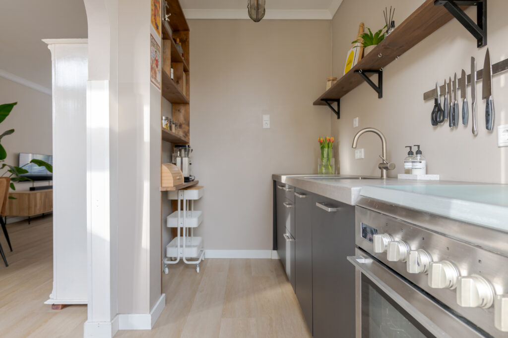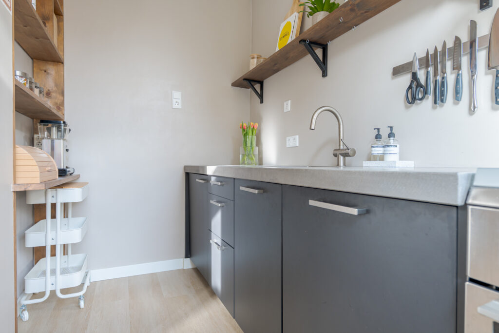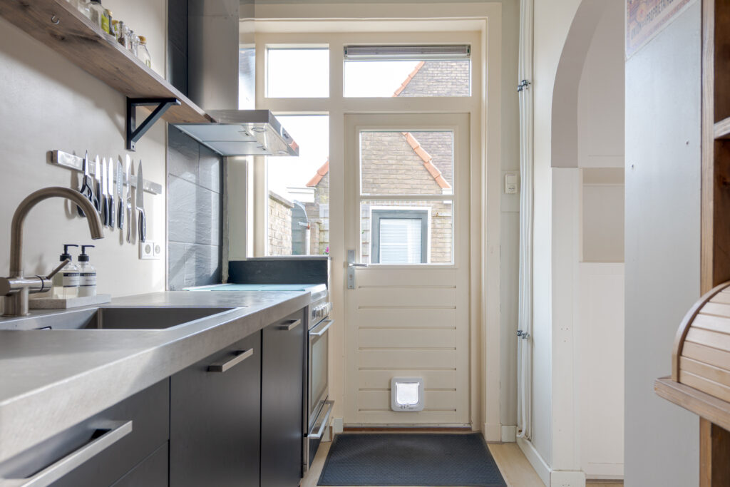 De halfopen keuken is netjes en functioneel ingericht met een 4-pits gaskookplaat, oven (recent vervangen), vaatwasser, koelkast en afzuigkap. Een fijne plek om te koken met zicht op de tuin, vanuit hier loopt u zo naar buiten!
