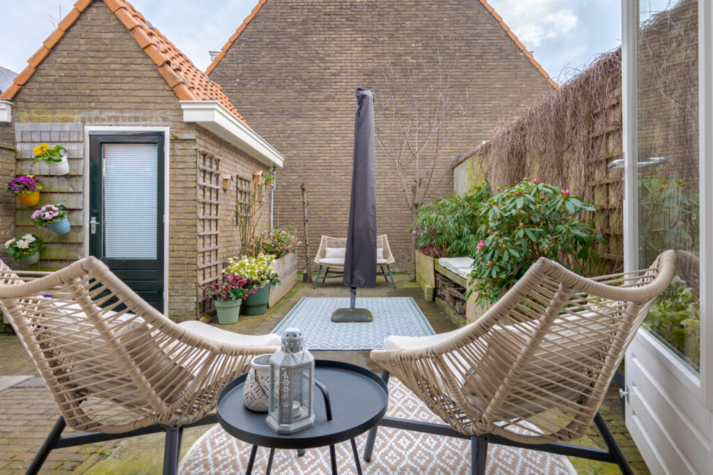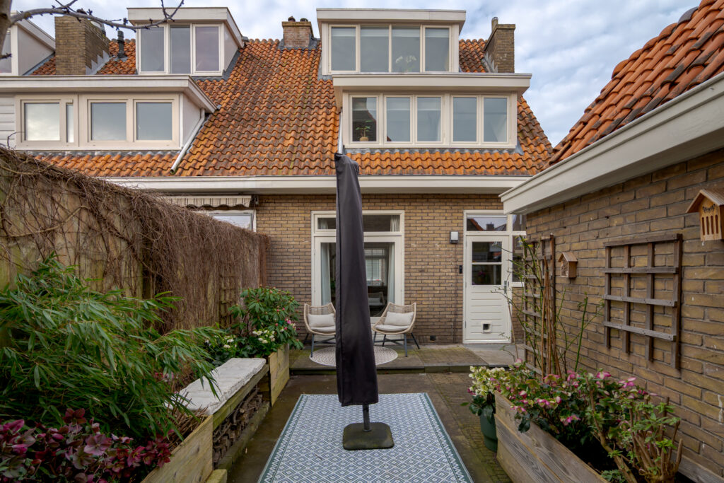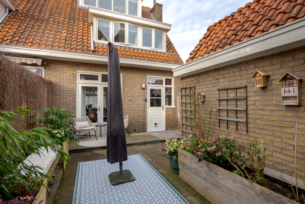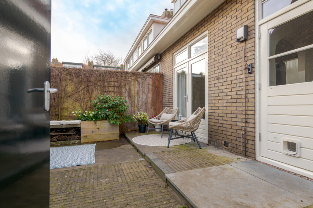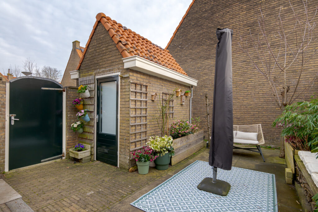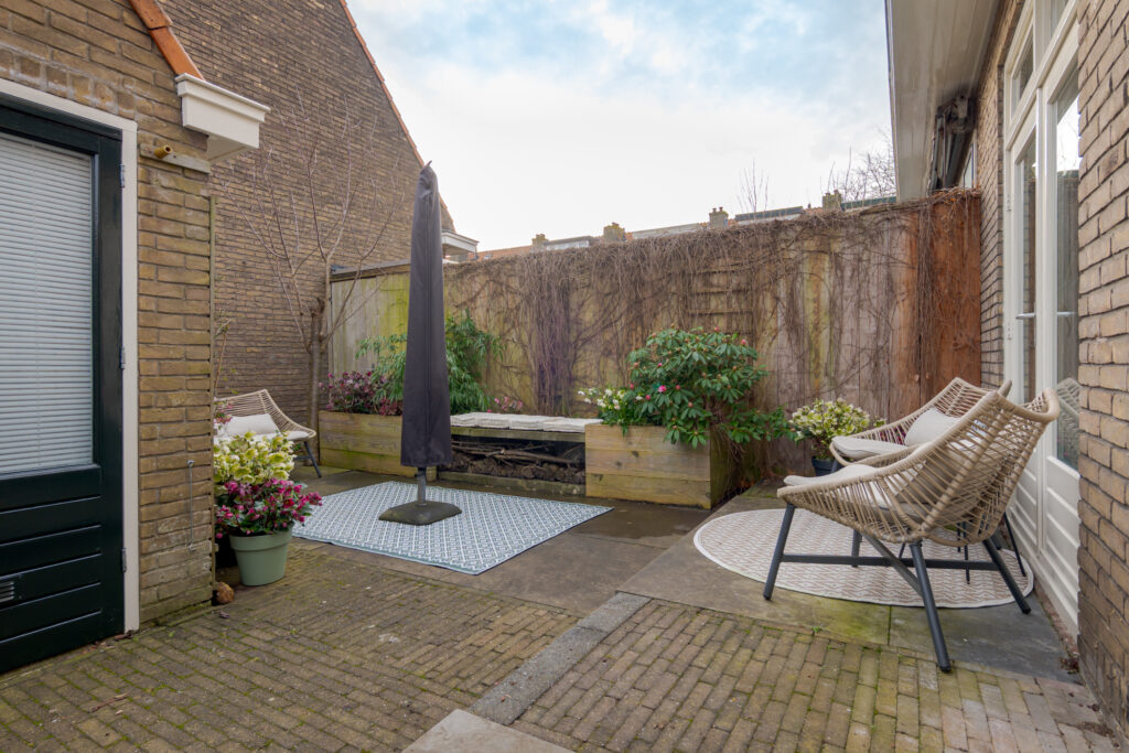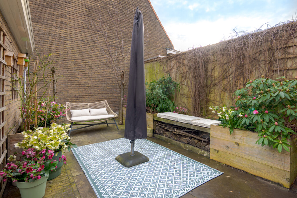 De achtertuin is gelegen op het noordoosten en verzorgd aangelegd met een fijne afwisseling van bestrating en groene borders. Hier kunt u in alle rust genieten van uw ochtendkoffie of een lange zomeravond. De vrijstaande stenen berging beschikt over water en elektra, ideaal voor fietsen en tuingereedschap. Via het achterom bereikt u eenvoudig de tuin.