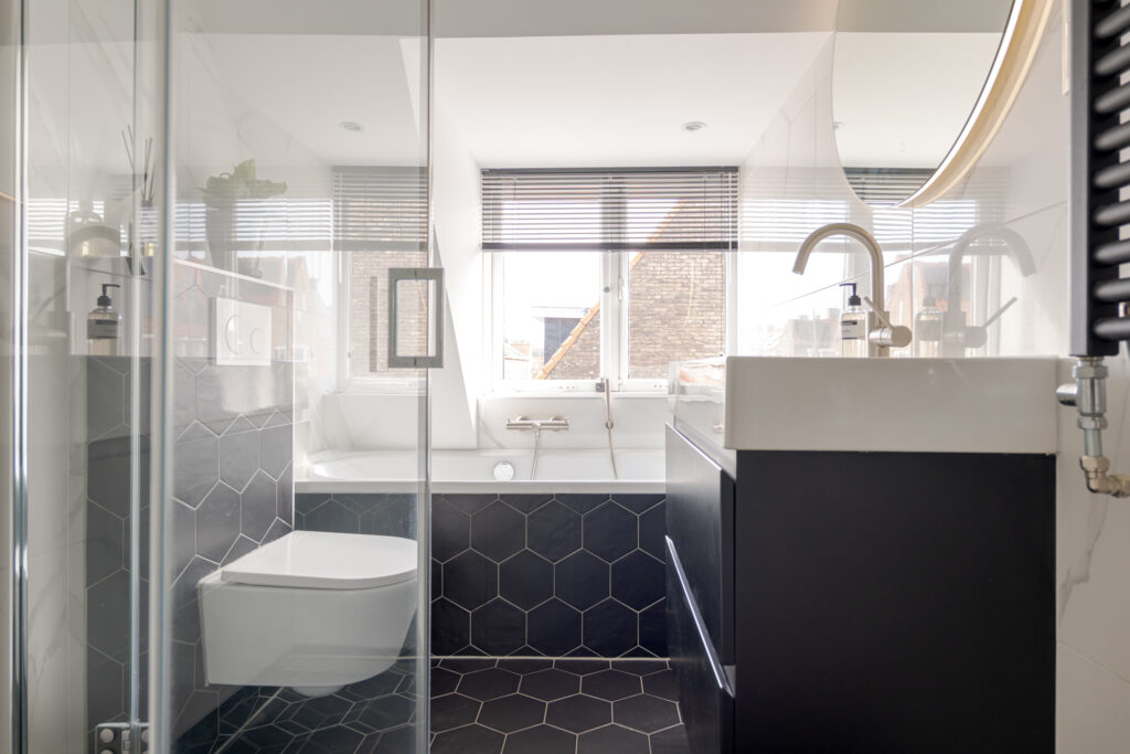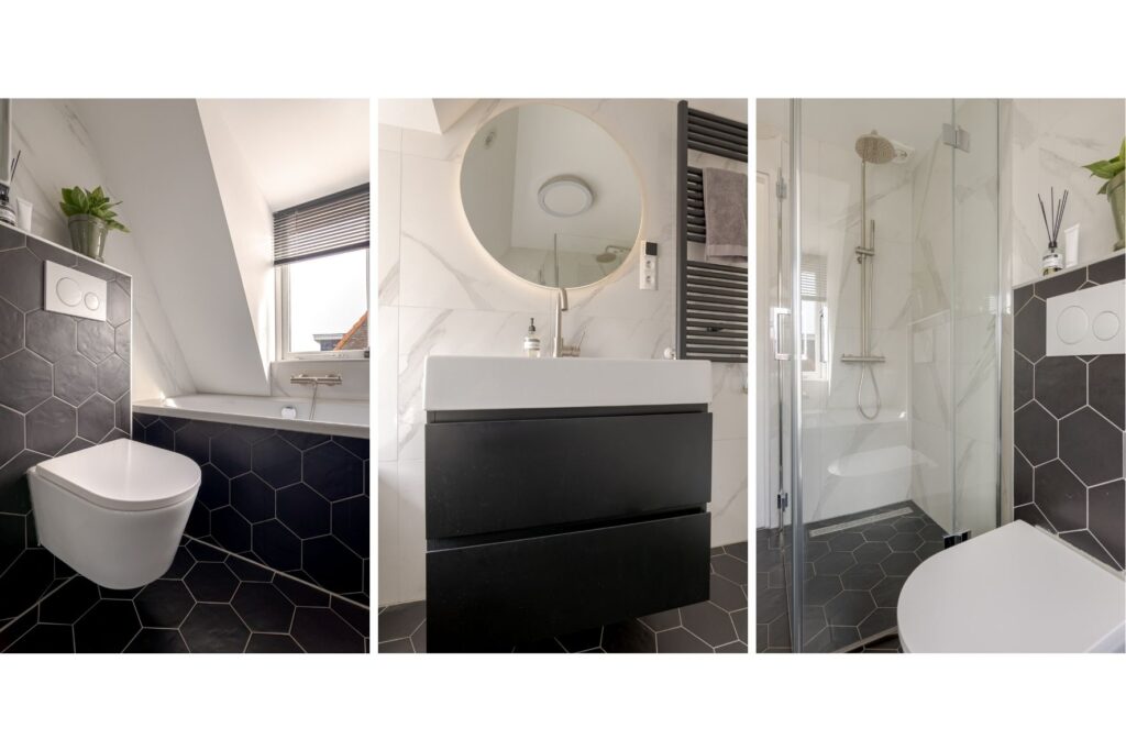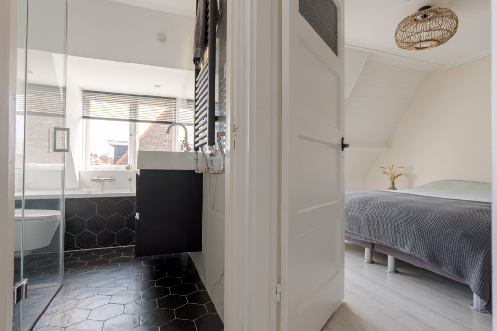Op de eerste verdieping bevinden zich twee slaapkamers, beide prettig van formaat. De recent vernieuwde badkamer is compleet ingericht met ligbad, douche, toilet, designradiator en wastafelmeubel. De elektrische vloerverwarming zorgt hier voor extra comfort. Op de overloop bevindt zich een voormalige doucheruimte, momenteel in gebruik als kastruimte. Deze ruimte biedt mooie mogelijkheden, bijvoorbeeld voor het realiseren van een aparte wasruimte.