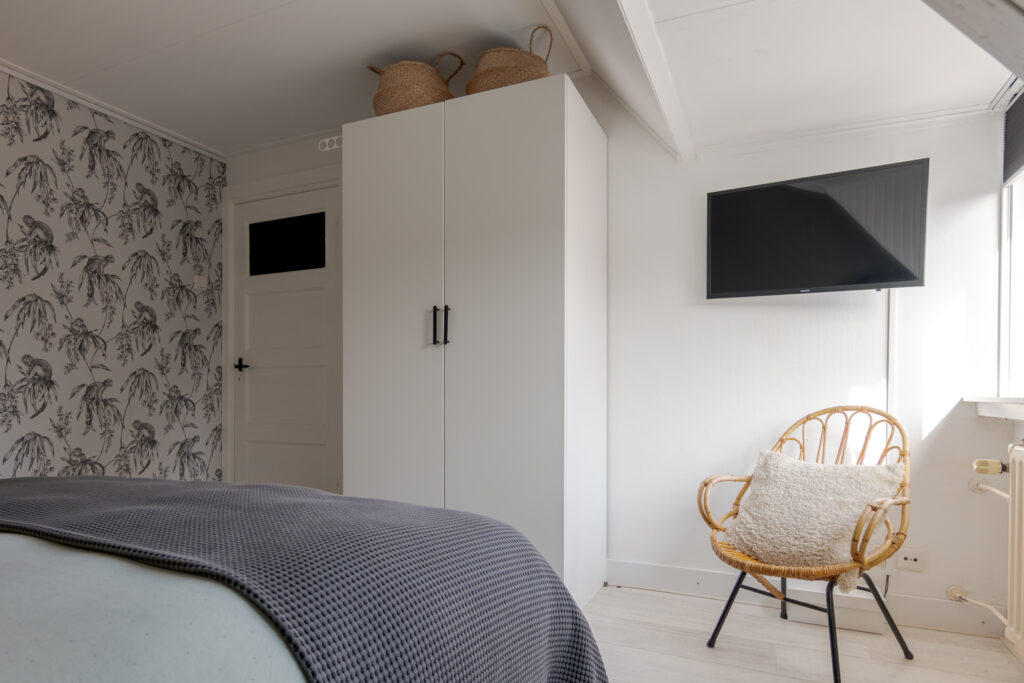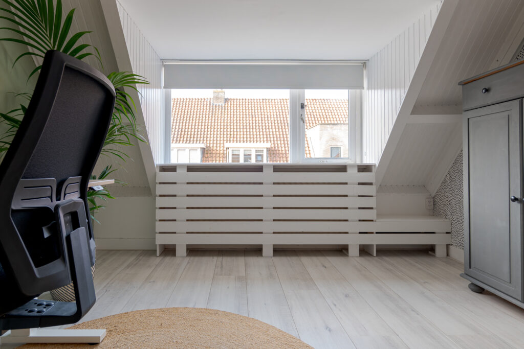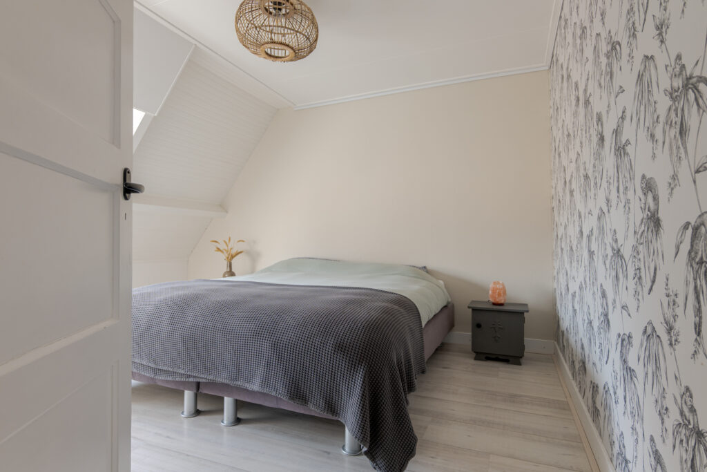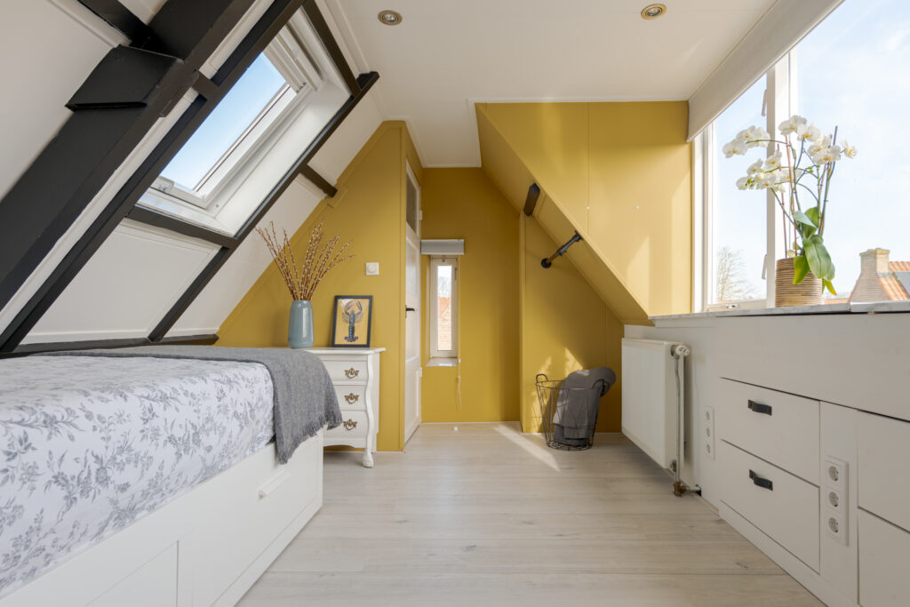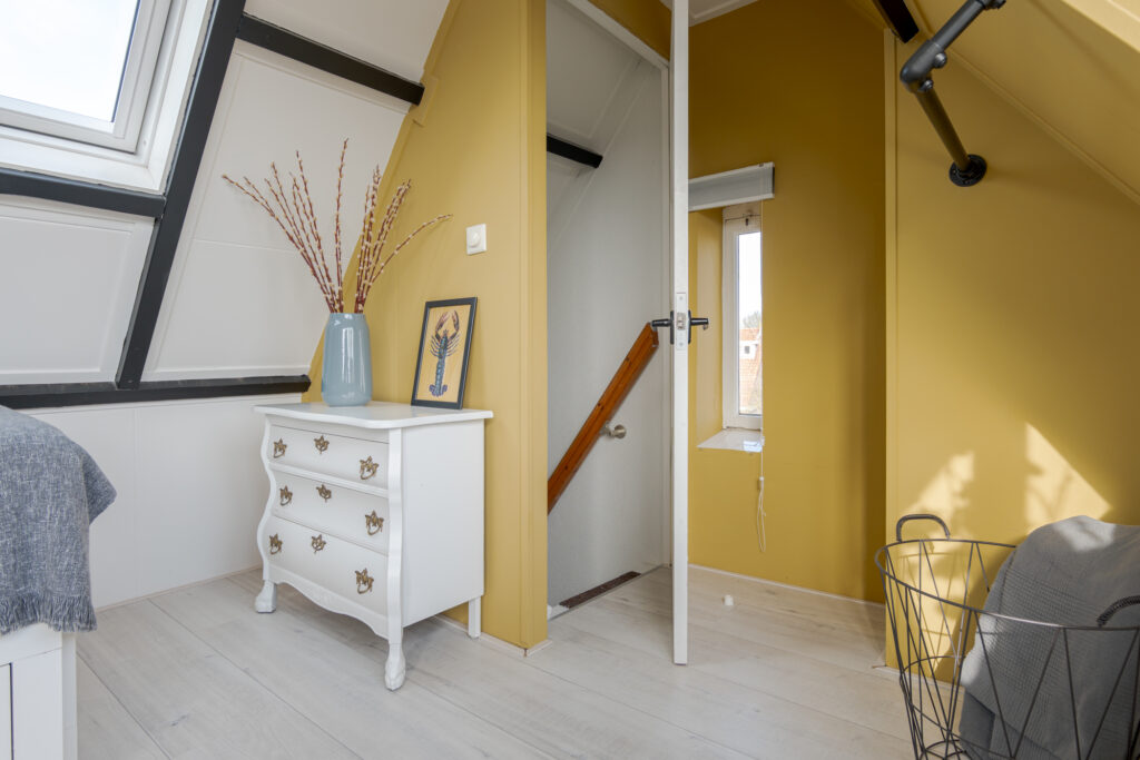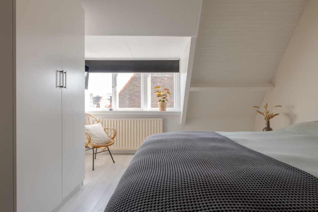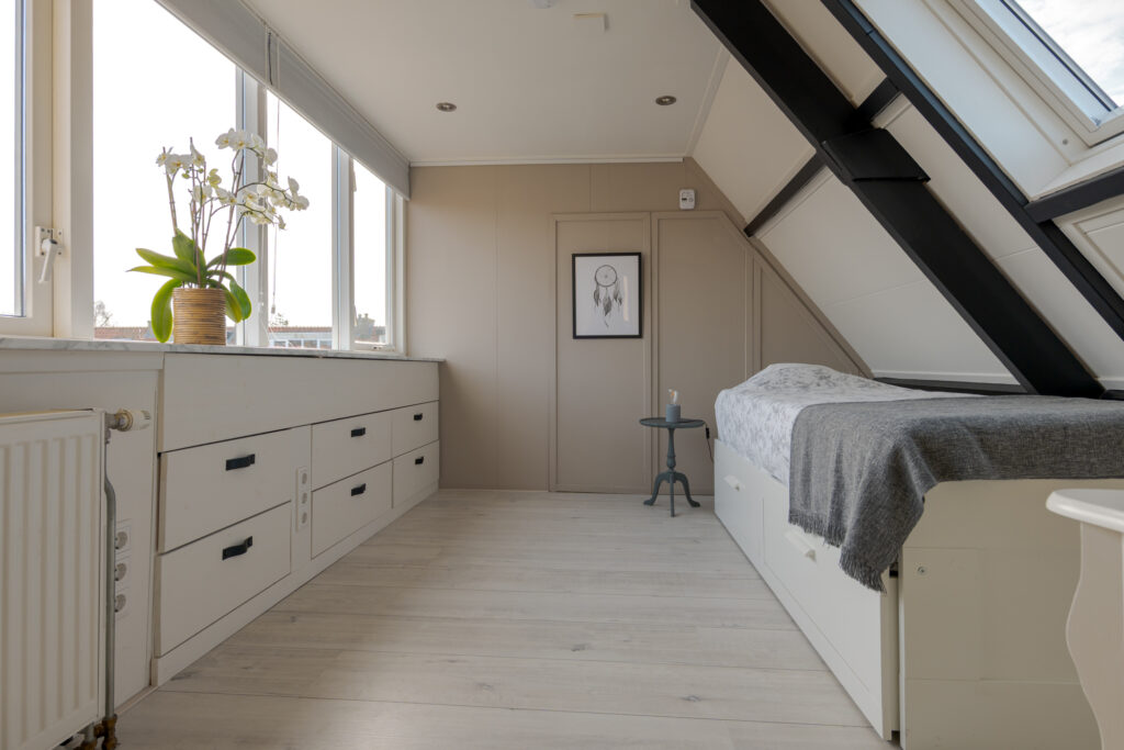 Via een vaste trap bereikt u de tweede verdieping. Hier vindt u de derde slaapkamer met dakkapel en extra dakraam, waardoor ook deze verdieping heerlijk licht aanvoelt. De schuine kap en het daglicht geven deze kamer een sfeervol karakter. Achter de knieschotten is praktische bergruimte aanwezig en de cv-opstelling bevindt zich netjes weggewerkt achter het schot.