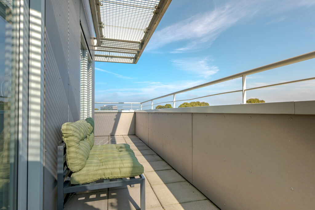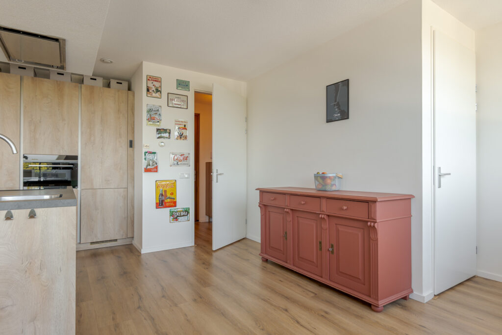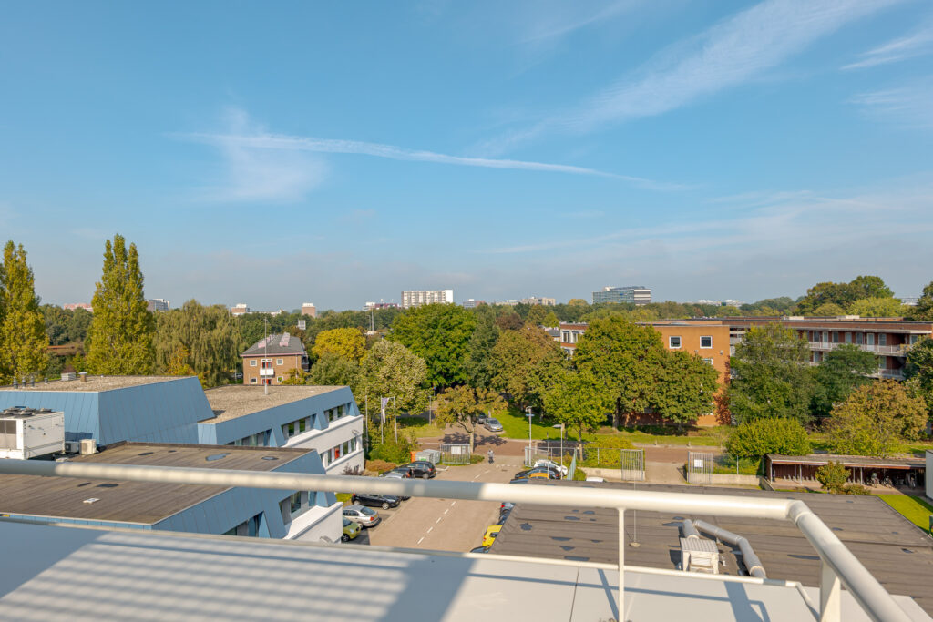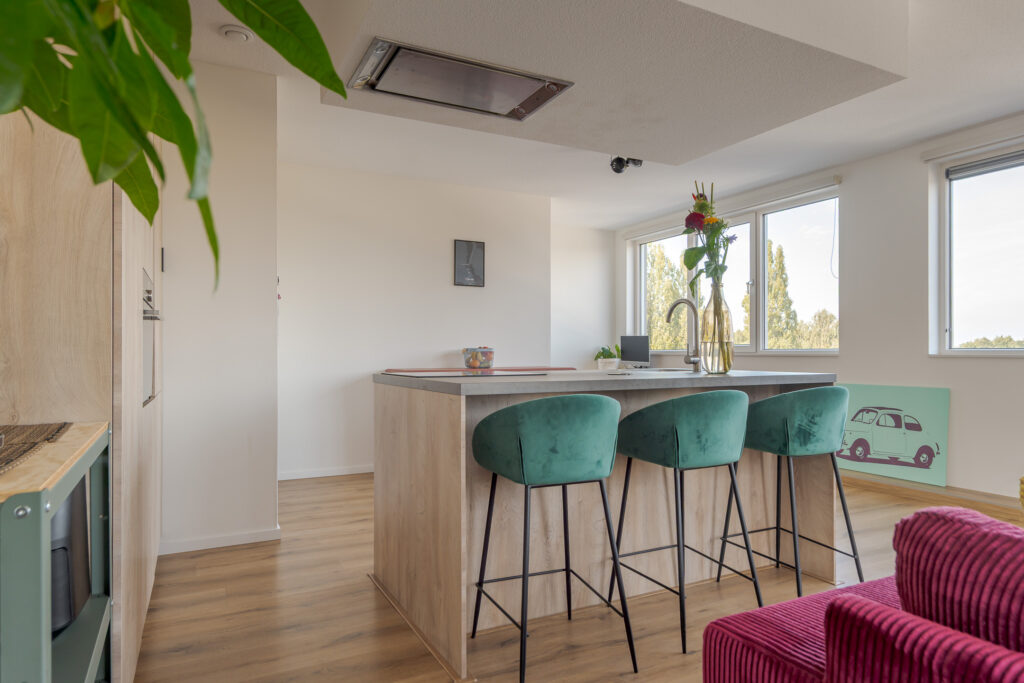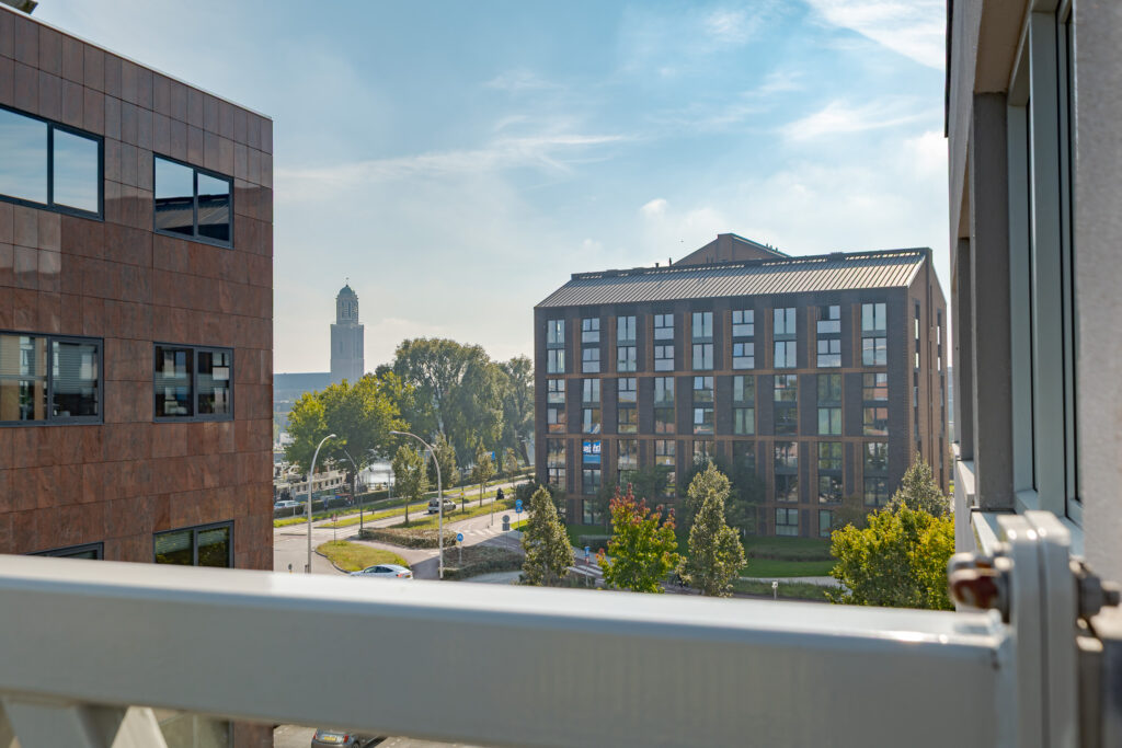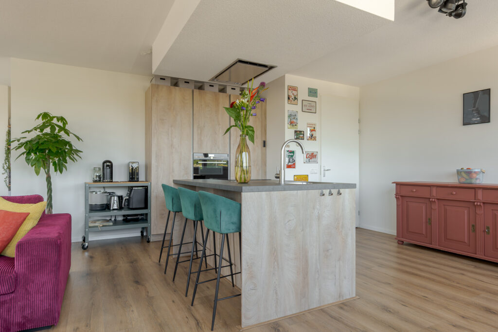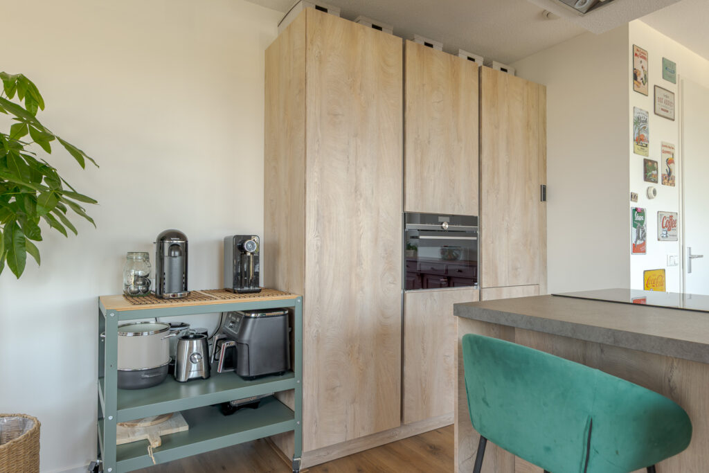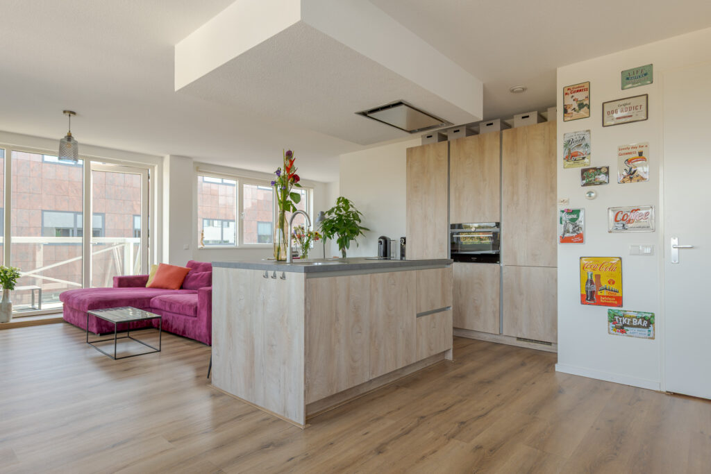 Via de centrale entree, met lift, bereikt u dit appartement, verdeeld over twee woonlagen. U komt binnen in de hal, vanuit hier heeft u toegang tot het toilet en de woonkamer met zonnig balkon met uitzicht op de iconische Peperbus. De royale woonkamer met diverse grote raampartijen zorgen voor een overvloed aan natuurlijk licht. De open keuken is centraal geplaatst en uitgerust met een modern kook- en spoeleiland met Siemens inbouwapparatuur en een gezellige ontbijt-/borrrelbar. De afzuigkap is slim weggewerkt in het plafond. Tevens is er een royale voorraadkast aanwezig.
