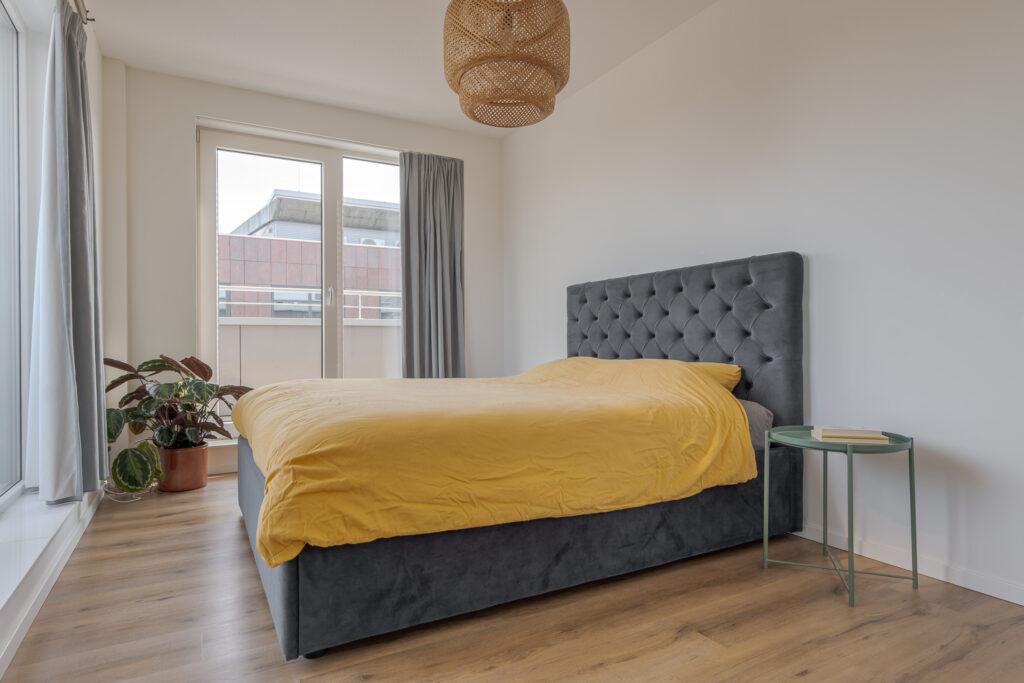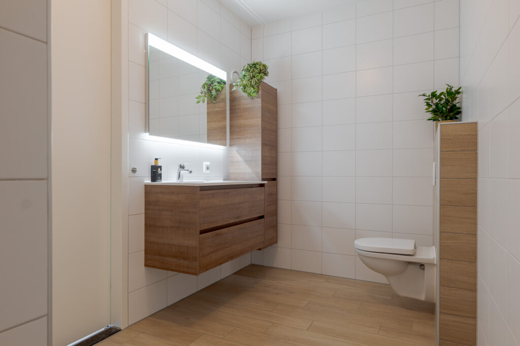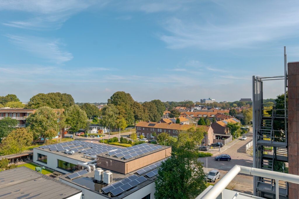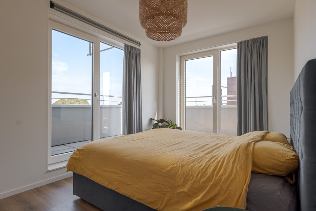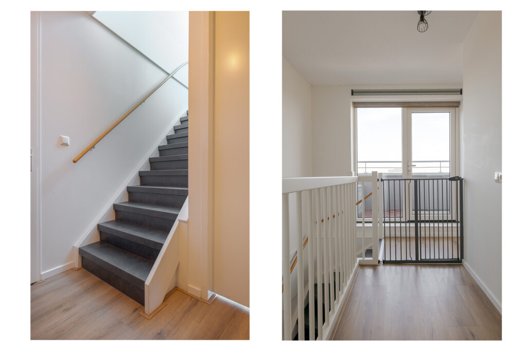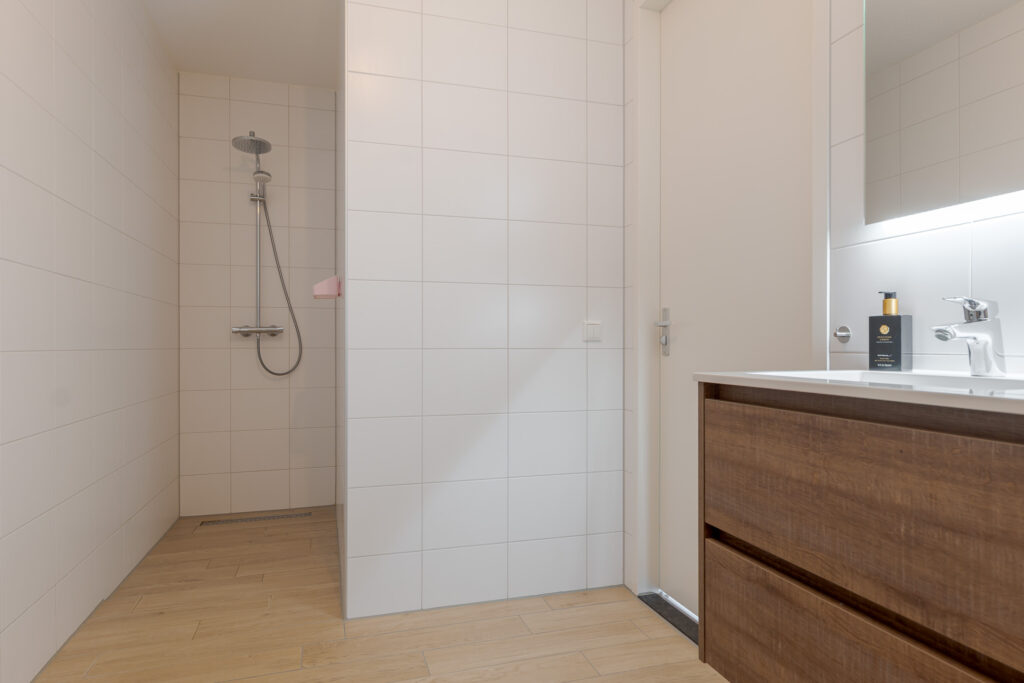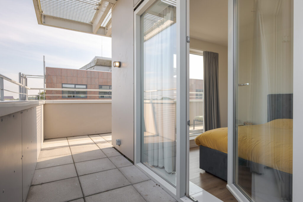 Op de verdieping bevinden zich twee volwaardige slaapkamers, elk voorzien van een inbouwkast en van een deur naar het dakterras. Het dakterras beslaat 2 zijden waardoor je altijd van de zon kan genieten. De moderne en ruime badkamer heeft een frisse rustige uitstraling door de witte tegels gecombineerd met houttinten en is uitgerust met een inloopdouche, toilet en wastafel met meubel. Daarnaast is er nog een aparte wasruimte en een vide boven de trapopgang, wat een extra ruimtelijk en licht effect geeft. In het gehele appartement ligt een mooie stijlvolle en praktische PVC vloer.