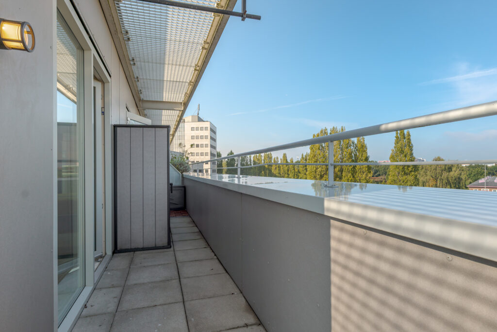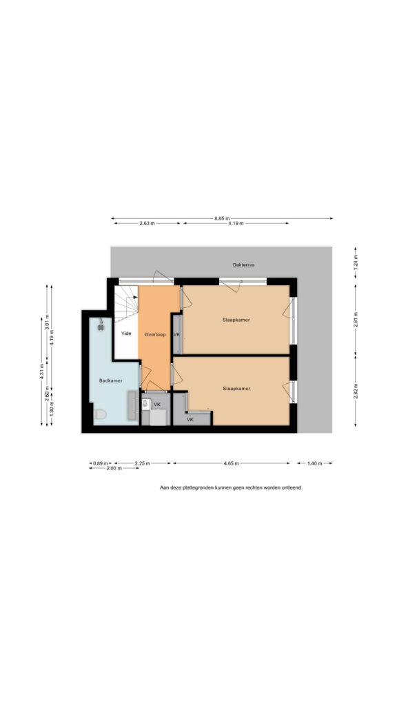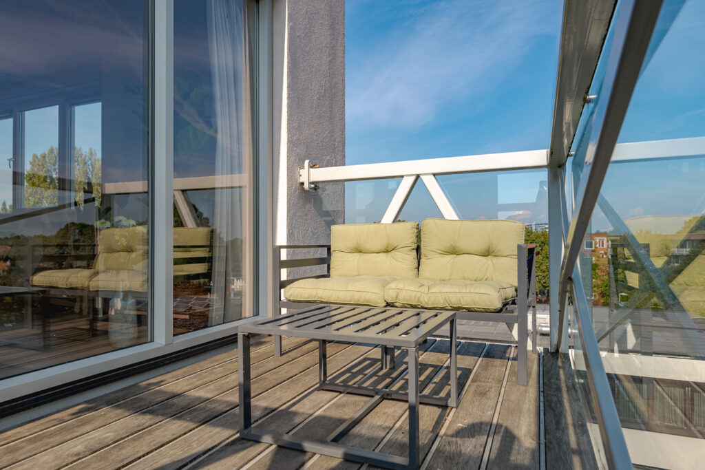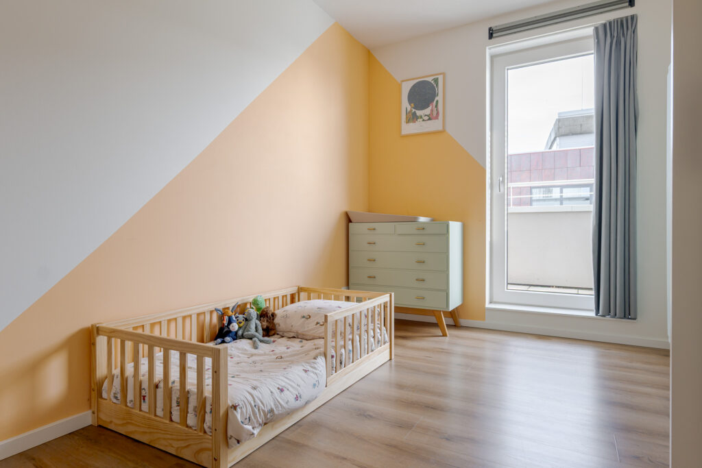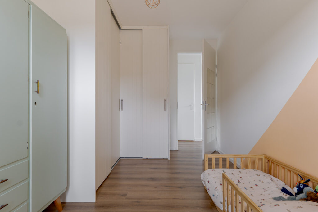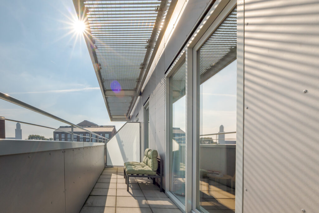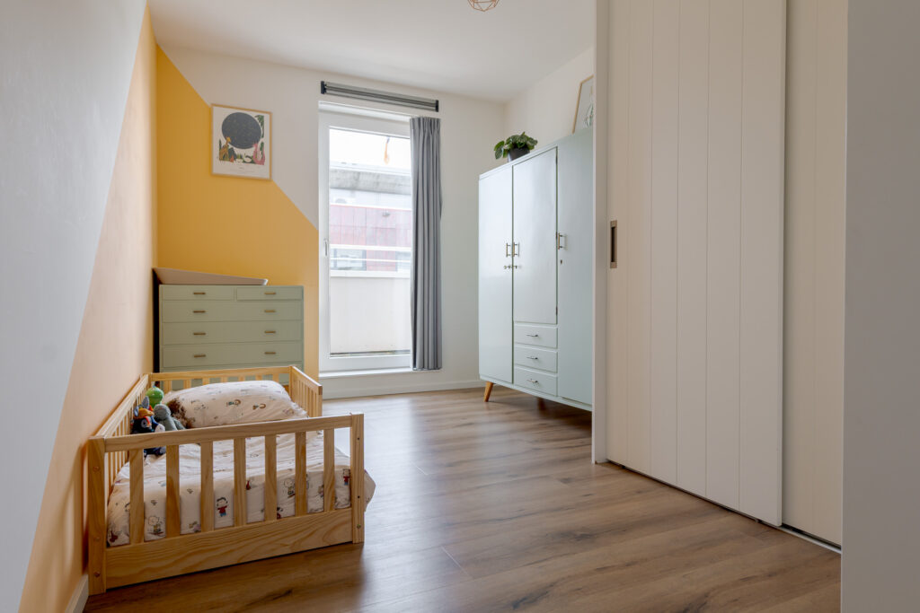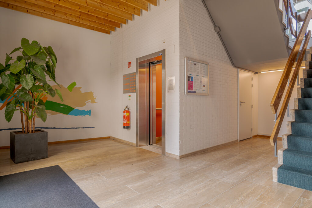 Op de verdieping bevinden zich twee volwaardige slaapkamers, elk voorzien van een inbouwkast en van een deur naar het dakterras. Het dakterras beslaat 2 zijden waardoor je altijd van de zon kan genieten. De moderne en ruime badkamer heeft een frisse rustige uitstraling door de witte tegels gecombineerd met houttinten en is uitgerust met een inloopdouche, toilet en wastafel met meubel. Daarnaast is er nog een aparte wasruimte en een vide boven de trapopgang, wat een extra ruimtelijk en licht effect geeft. In het gehele appartement ligt een mooie stijlvolle en praktische PVC vloer.