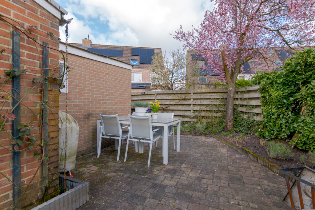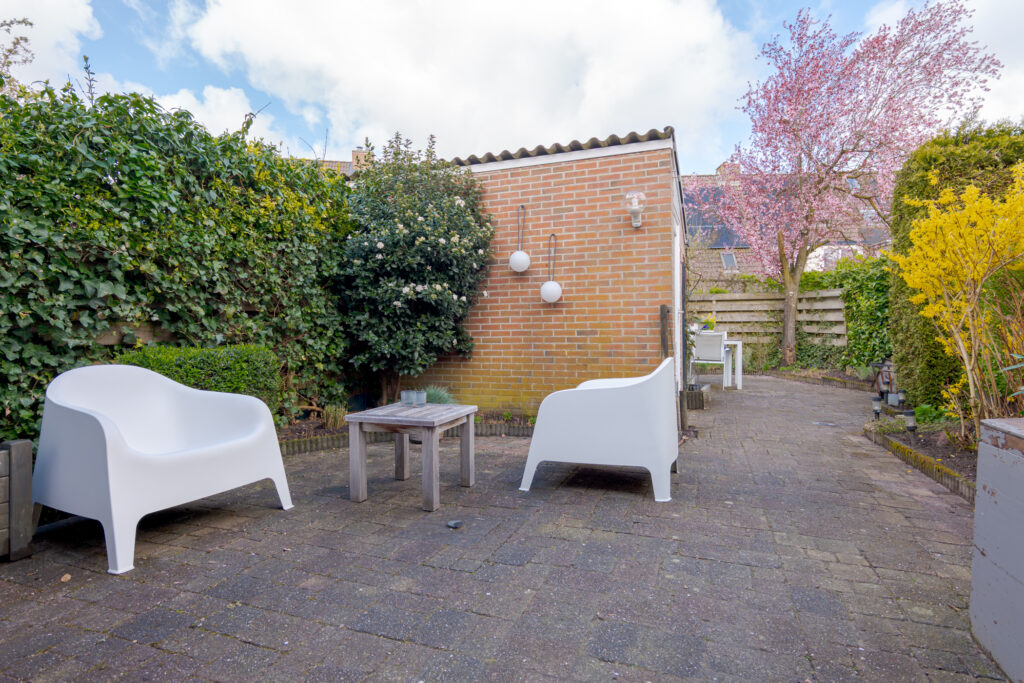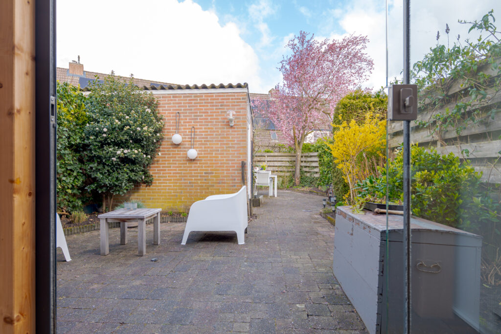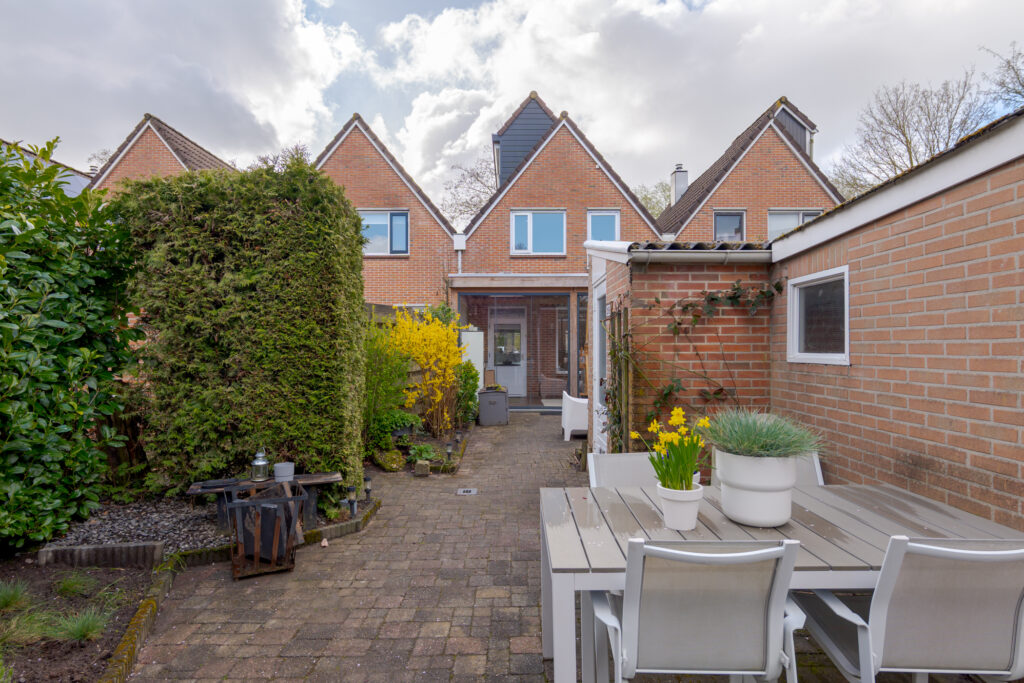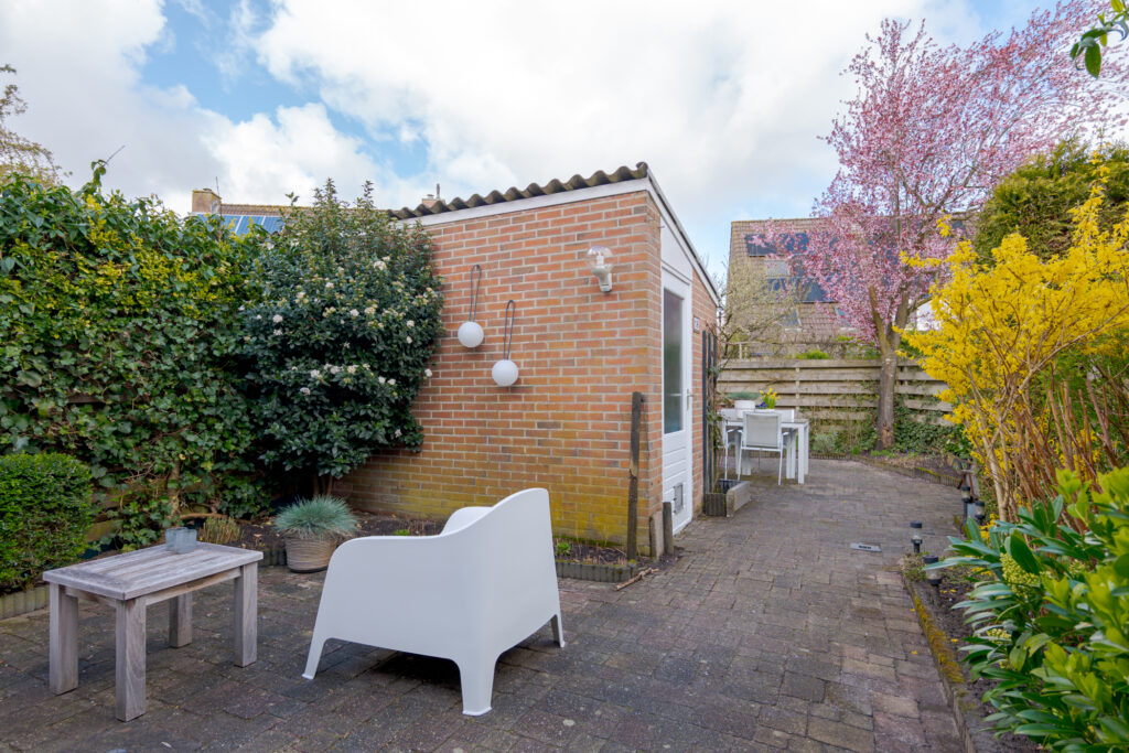 De achtertuin is verzorgd aangelegd en heeft met een diepte van circa 15 meter een prettig formaat. Daardoor is het mogelijk meerdere zitplekken te creëren. Door de afwezigheid van directe achterburen maakt het genieten van de tuin extra aantrekkelijk. De tuin ligt op het noorden en beschikt over een achterom. Daarnaast zijn er twee vrijstaande stenen bergingen aanwezig, beide voorzien van elektra. Daarmee is er volop ruimte voor fietsen, opslag en tuinspullen.