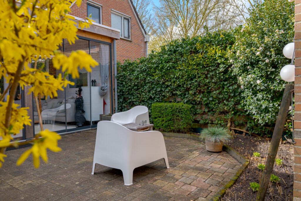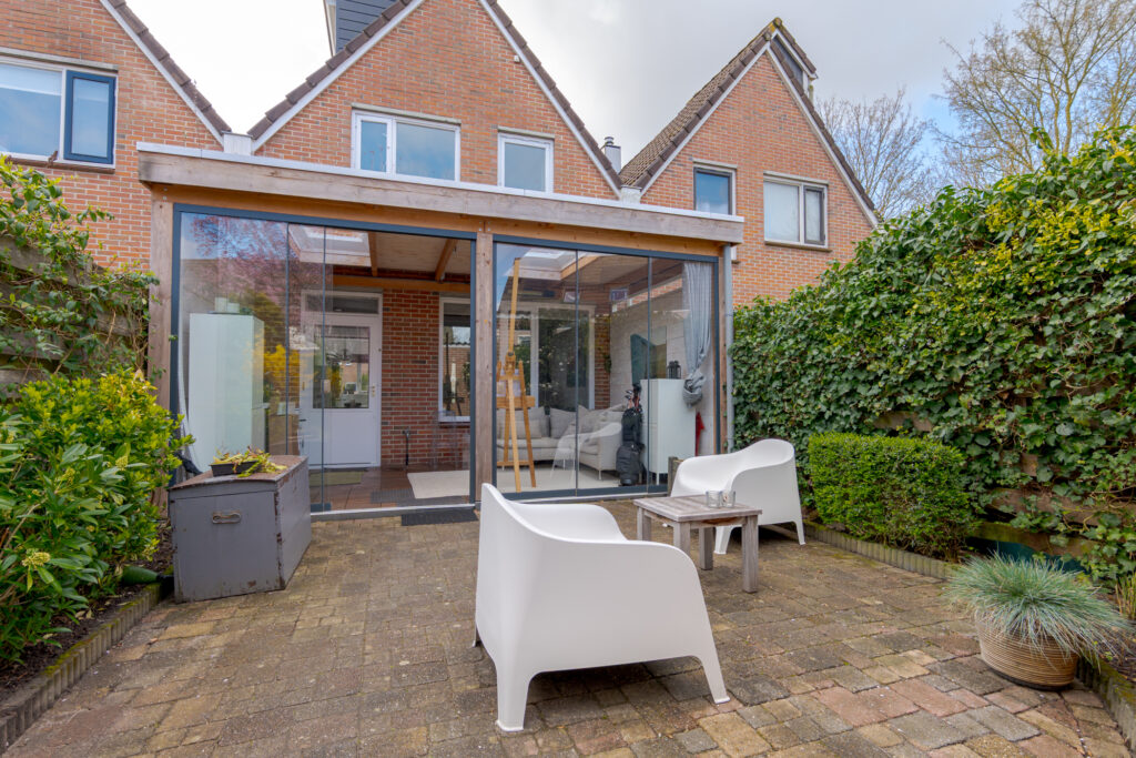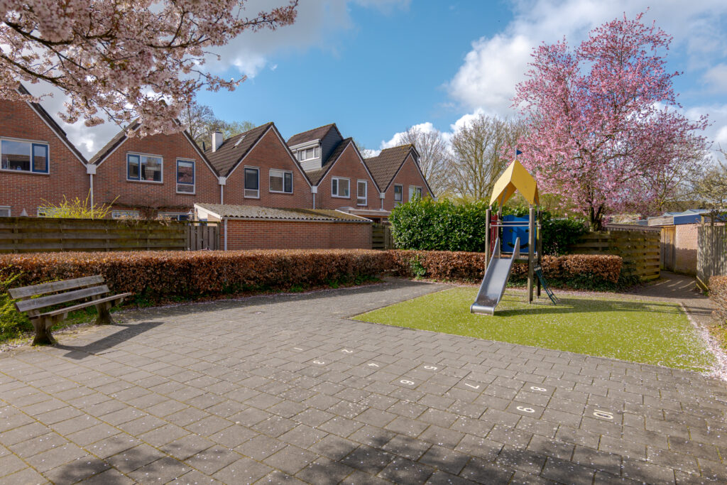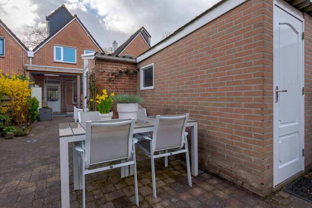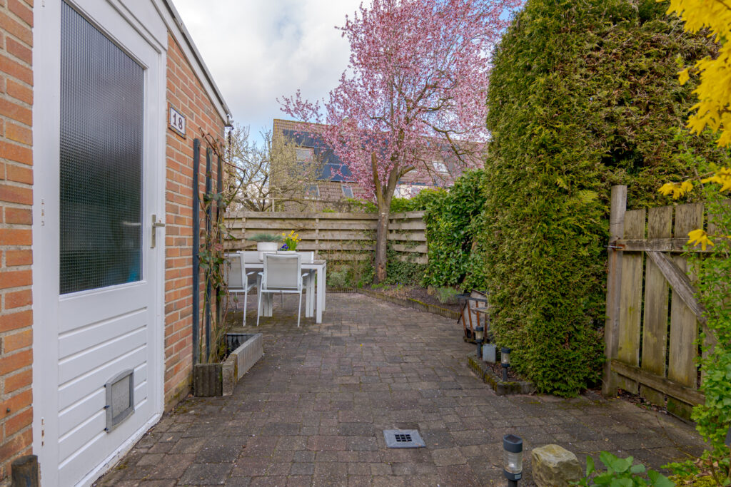 De achtertuin is verzorgd aangelegd en heeft met een diepte van circa 15 meter een prettig formaat. Daardoor is het mogelijk meerdere zitplekken te creëren. Door de afwezigheid van directe achterburen maakt het genieten van de tuin extra aantrekkelijk. De tuin ligt op het noorden en beschikt over een achterom. Daarnaast zijn er twee vrijstaande stenen bergingen aanwezig, beide voorzien van elektra. Daarmee is er volop ruimte voor fietsen, opslag en tuinspullen.