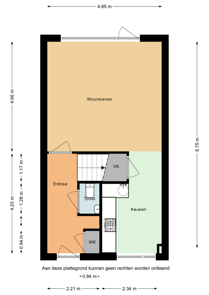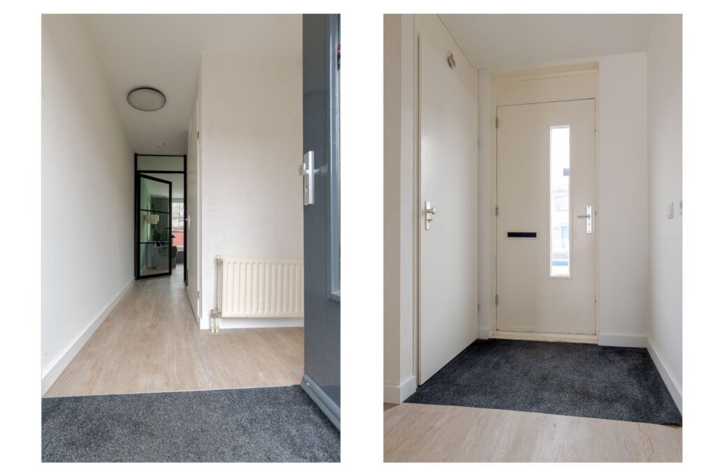 Via de voortuin, die zorgt voor een fijne mate van privacy, bereikt u de entree van de woning. In de hal bevinden zich het toilet, de meterkast en de trapopgang naar de eerste verdieping. Vanuit hier loopt u door naar de woonkamer, die over de volle breedte aan de achterzijde van de woning is gesitueerd. Dankzij de royale maatvoering is er volop ruimte voor zowel een comfortabele zithoek als een gezellige eethoek. De trapkast tussen de woonkamer en de keuken biedt praktische bergruimte.