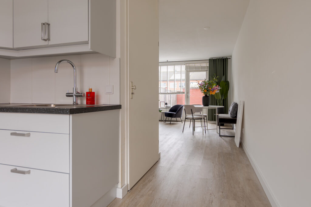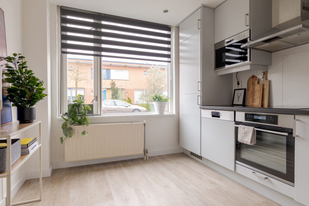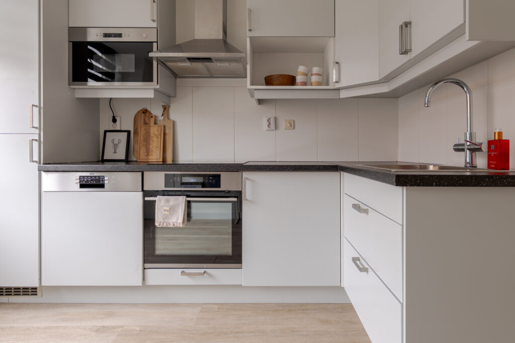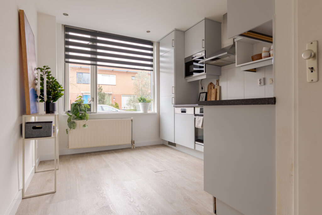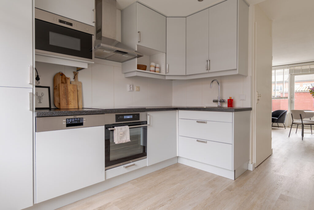 De keuken is aan de voorzijde van de woning gelegen en uitgevoerd in een frisse witte kleurstelling. Dankzij de prettige lichtinval is dit een aangename plek om te koken. De keuken is voorzien van diverse inbouwapparatuur, waaronder een Quooker, vaatwasser, koel-vriescombinatie, oven en magnetron. Op de begane grond ligt een praktische houtlook PVC-vloer, die bijdraagt aan een rustige en verzorgde uitstraling.