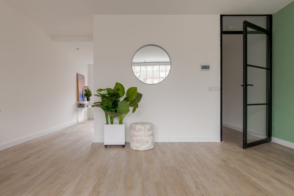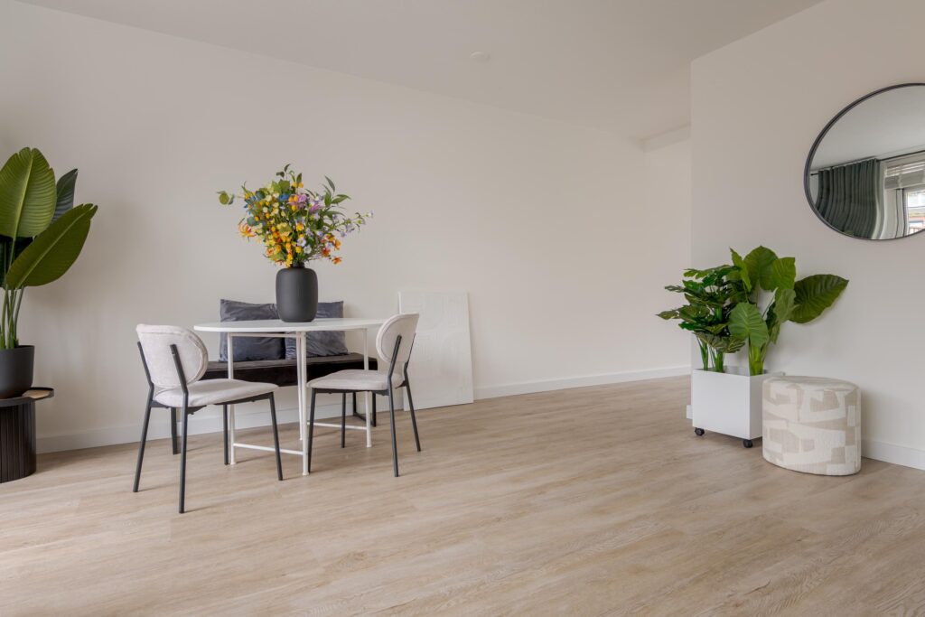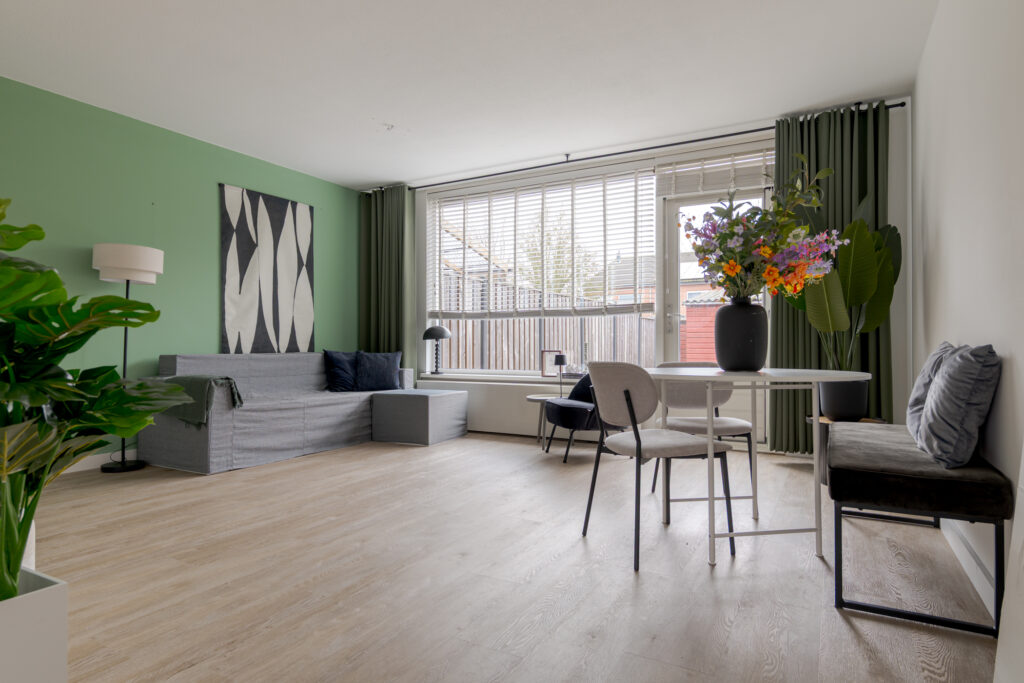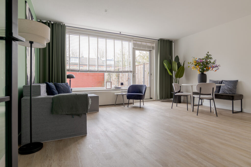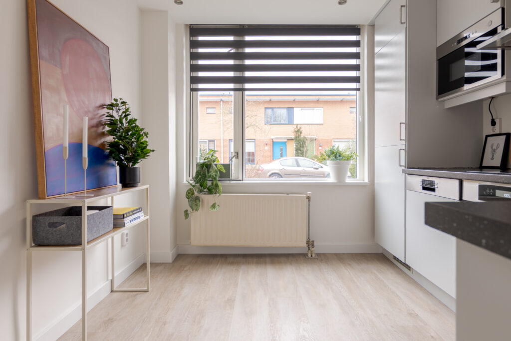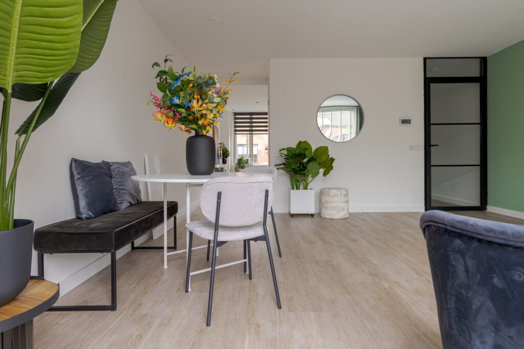 De keuken is aan de voorzijde van de woning gelegen en uitgevoerd in een frisse witte kleurstelling. Dankzij de prettige lichtinval is dit een aangename plek om te koken. De keuken is voorzien van diverse inbouwapparatuur, waaronder een Quooker, vaatwasser, koel-vriescombinatie, oven en magnetron. Op de begane grond ligt een praktische houtlook PVC-vloer, die bijdraagt aan een rustige en verzorgde uitstraling.