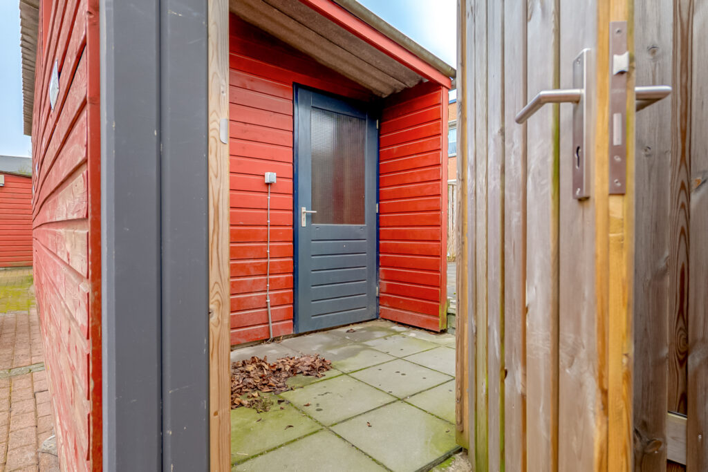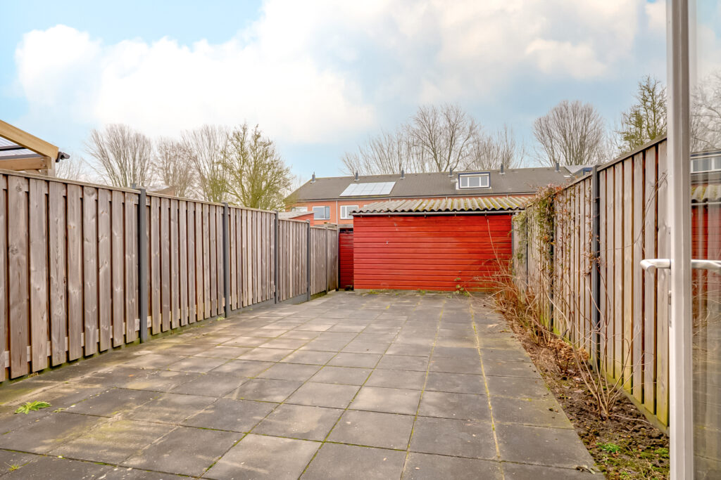 De achtertuin is gelegen op het oosten en heeft een oppervlakte van circa 65 m². De tuin is onderhoudsvriendelijk ingericht en vormt een goede basis om eventueel geheel naar eigen wens opnieuw vorm te geven. De tuin beschikt over een achterom en een vrijstaande houten berging met elektra, ideaal voor fietsen en tuinspullen. Parkeren kan op de eigen parkeerplaats aan de achterzijde van de tuin.