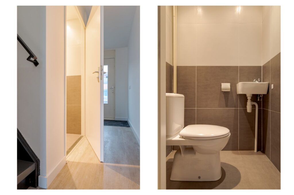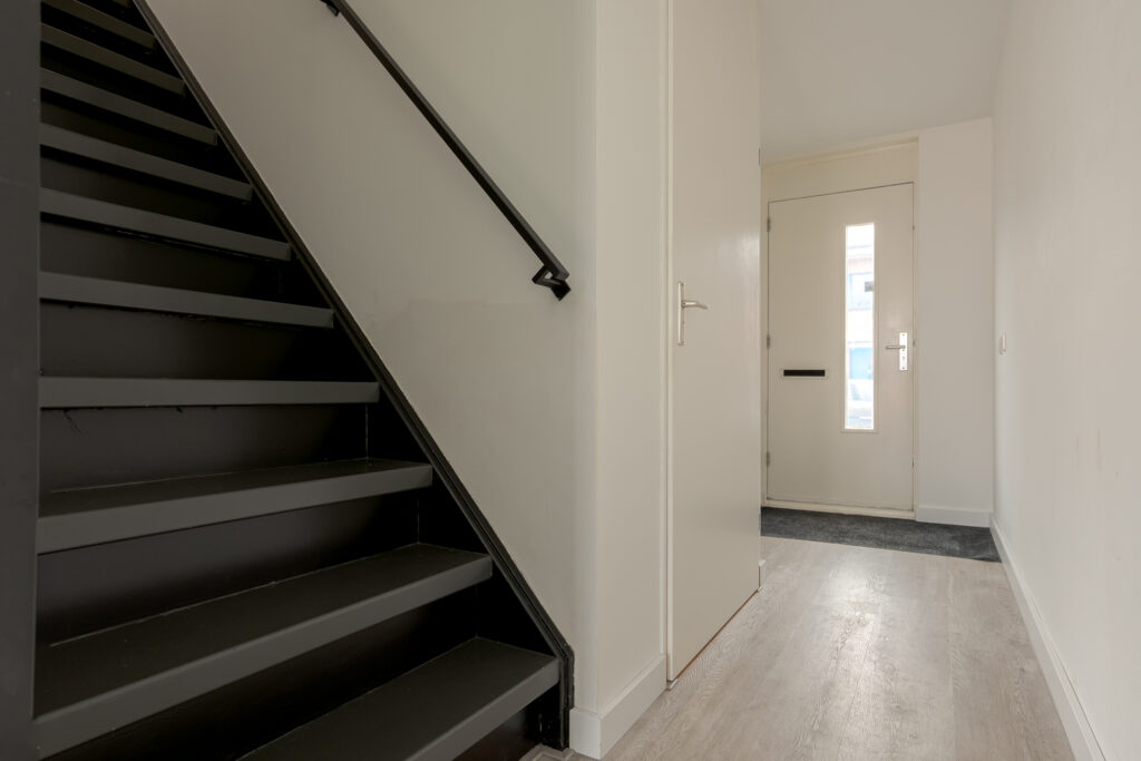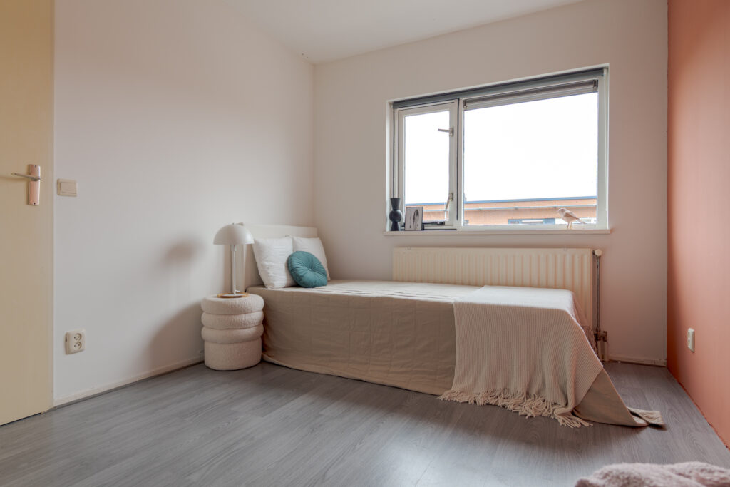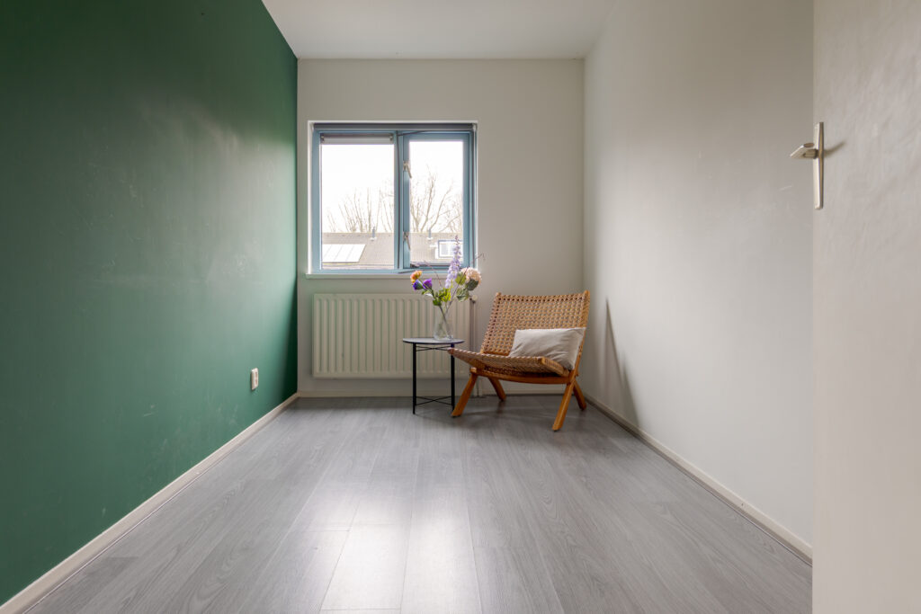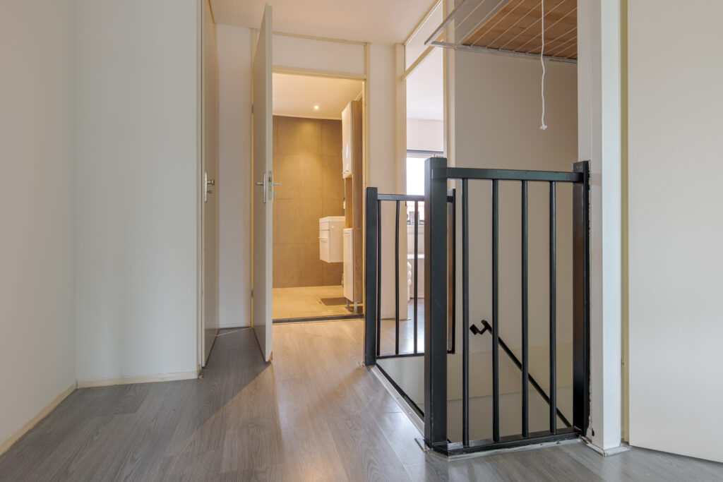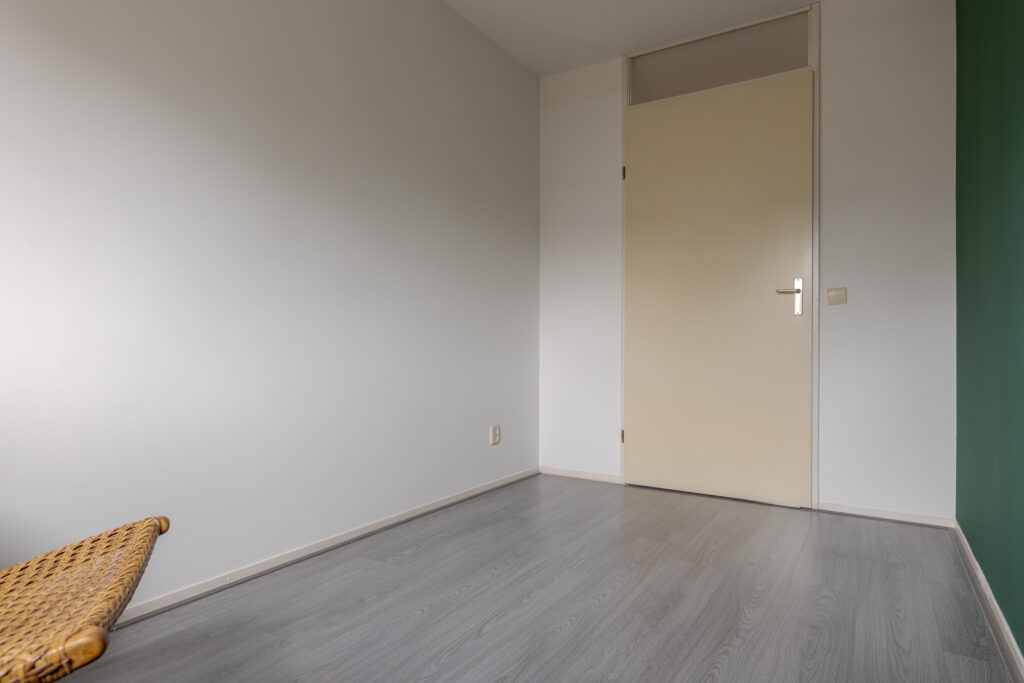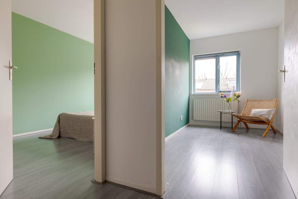 Op de eerste verdieping komt u uit op de overloop, die toegang biedt tot drie slaapkamers van verschillende afmetingen. De kamers zijn functioneel ingedeeld en lenen zich uitstekend voor gebruik als slaap-, werk- of hobbyruimte. De badkamer is uitgevoerd in een frisse grijs-witte betegeling en voorzien van een douche, wastafel en toilet. Daarnaast is op deze verdieping een vaste kast met de ketelopstelling aanwezig, die tevens extra bergruimte biedt.